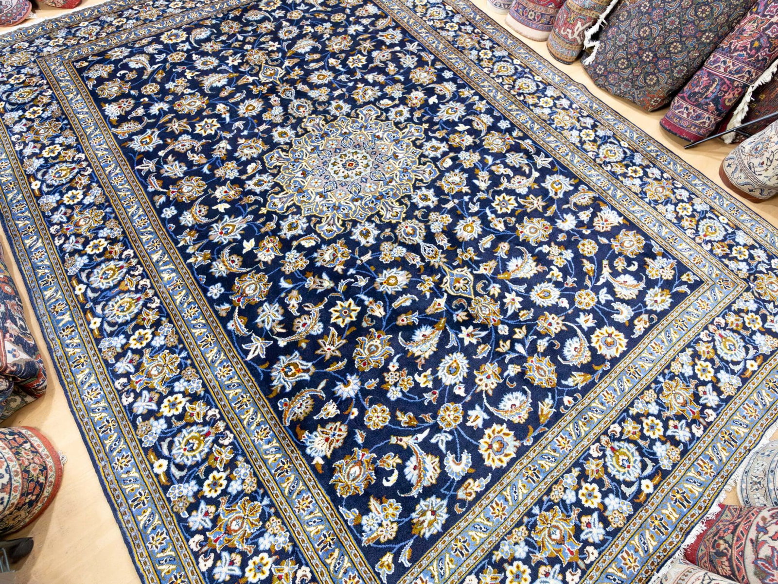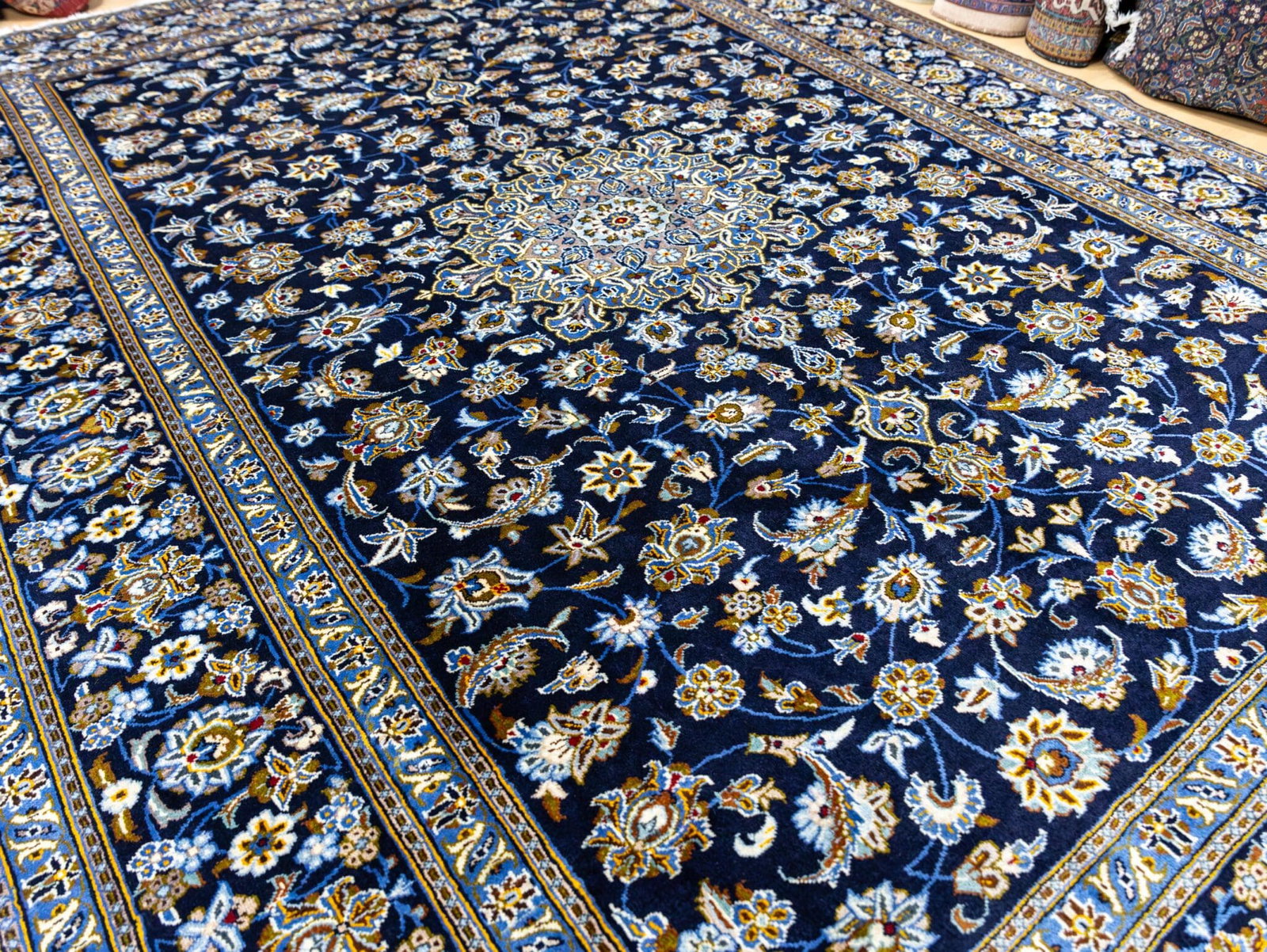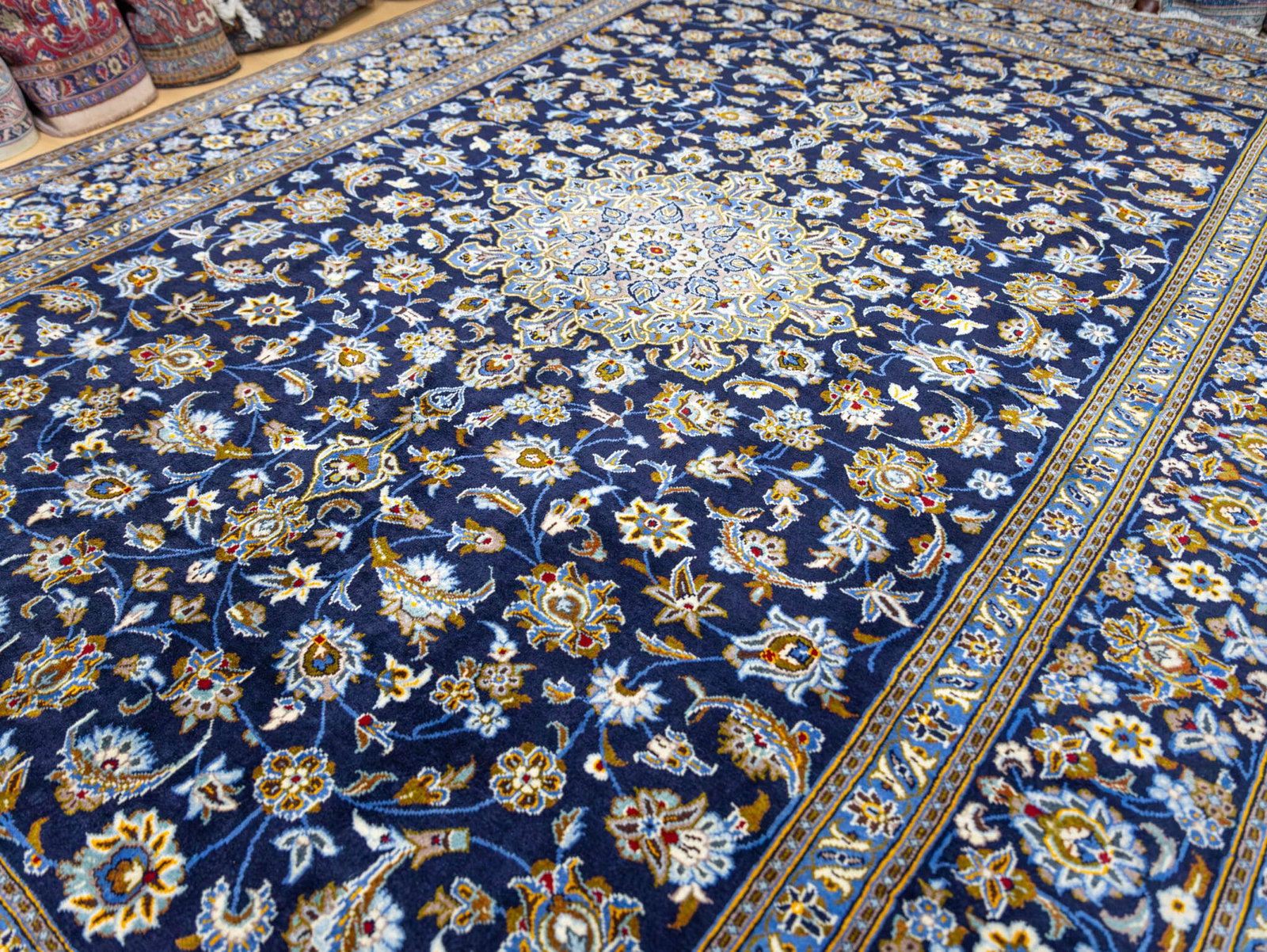 Dieser originale handgeknüpfte Kashan aus Iran misst großzügige 369 × 275 cm und zeigt die charakteristischen floralen Motive, für die Kashan weltweit bekannt ist. Besonders hervorzuheben ist das seltene Design ohne Eckmotive (Lachak) – die meisten klassischen Kashan-Teppiche besitzen ein zentrales Toranj-Medaillon mit flankierenden Eckmotiven. Dieses Stück jedoch zeigt die reine Medaillonform ohne Lachak, was es zu einem selteneren und begehrten Design innerhalb der Kashan-Tradition macht.