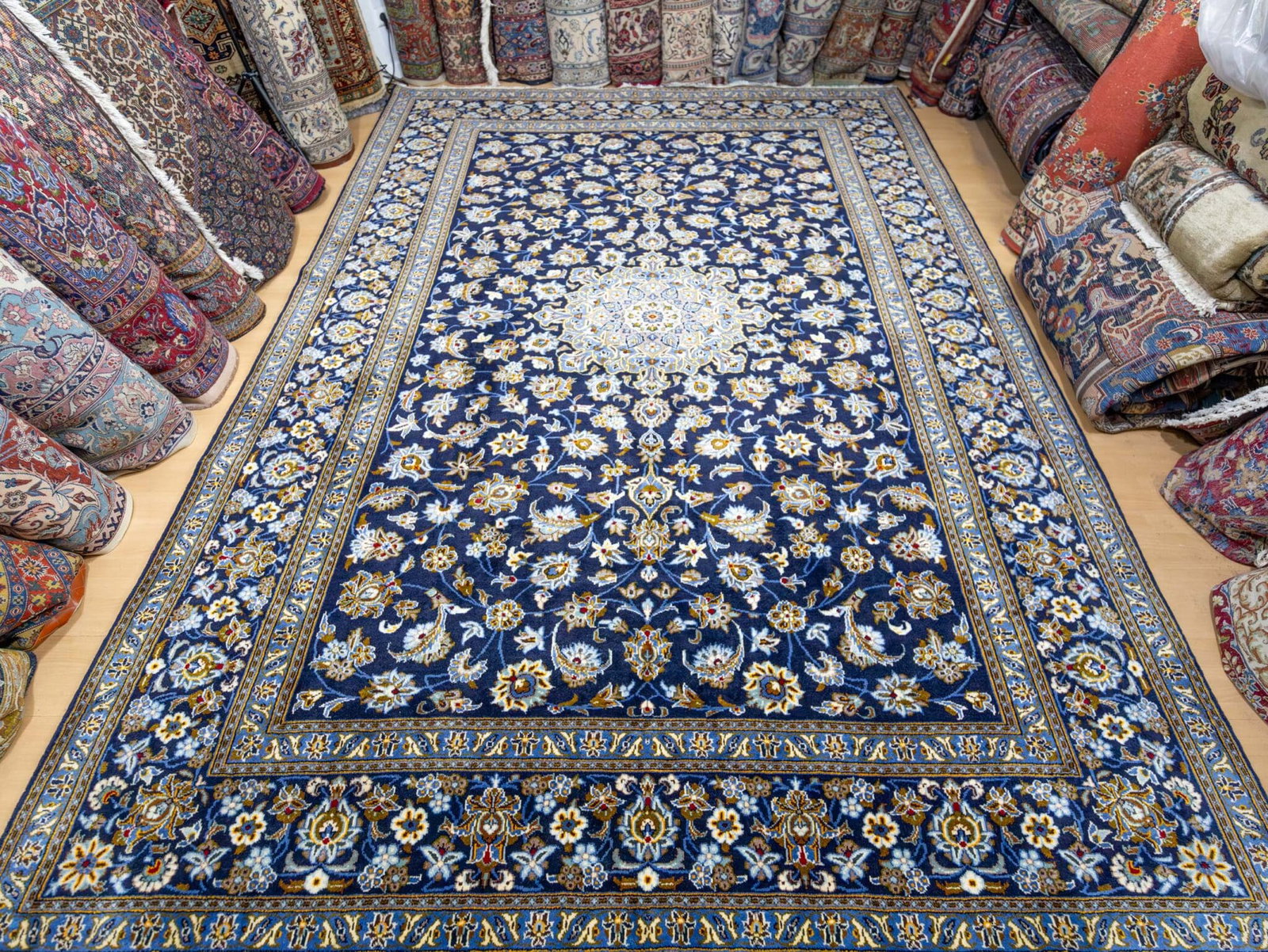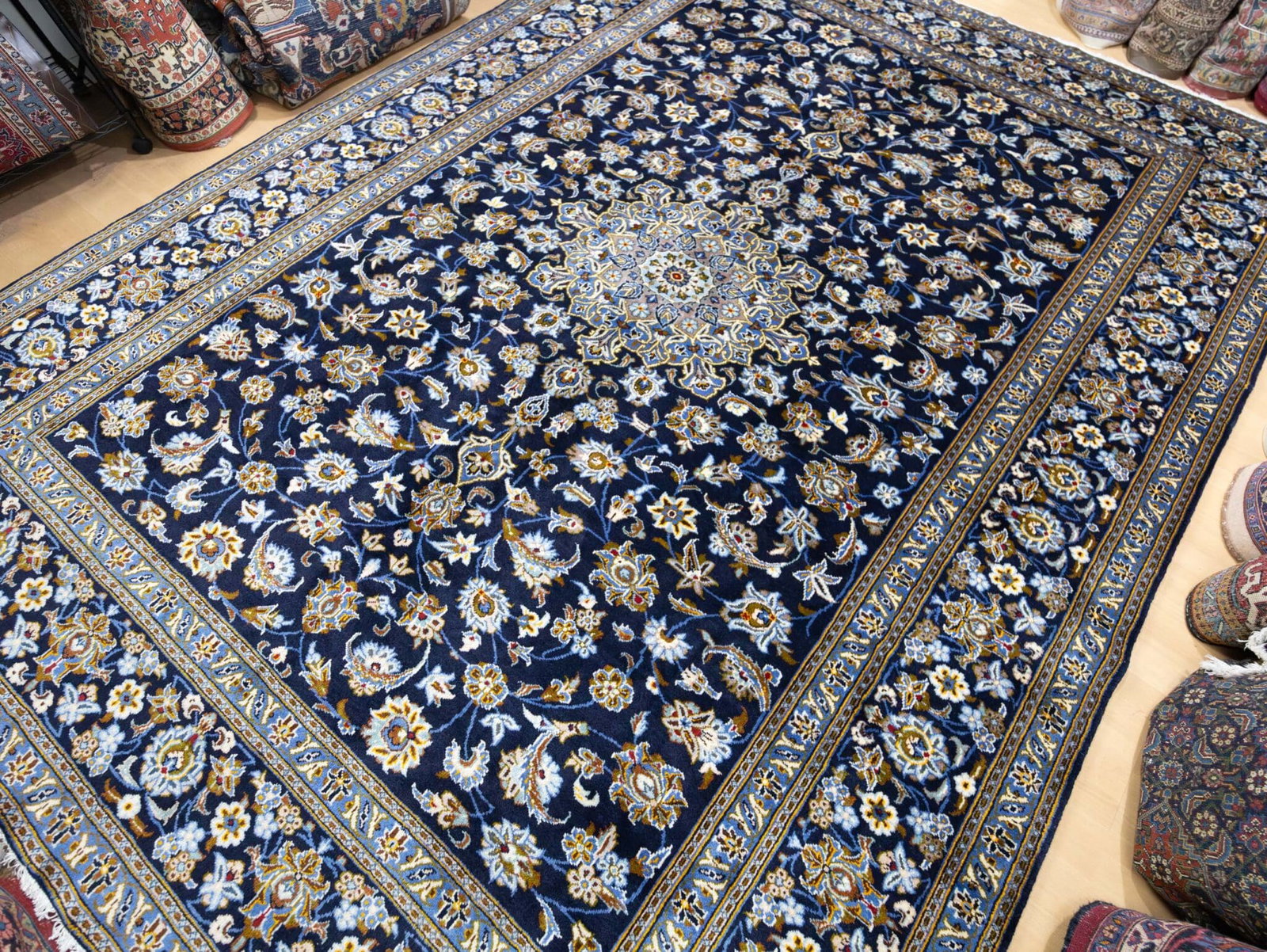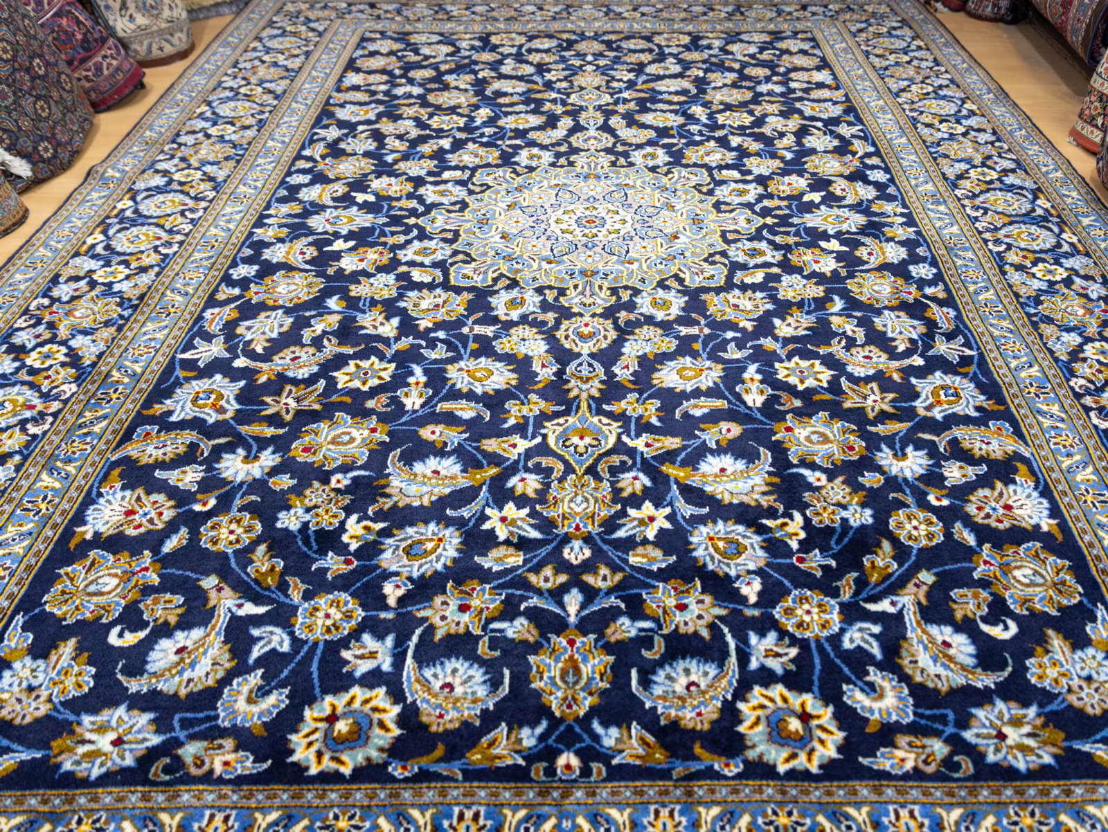 Dieser originale handgeknüpfte Kashan aus Iran misst großzügige 369 × 275 cm und zeigt die charakteristischen floralen Motive, für die Kashan weltweit bekannt ist. Besonders hervorzuheben ist das seltene Design ohne Eckmotive (Lachak) – die meisten klassischen Kashan-Teppiche besitzen ein zentrales Toranj-Medaillon mit flankierenden Eckmotiven. Dieses Stück jedoch zeigt die reine Medaillonform ohne Lachak, was es zu einem selteneren und begehrten Design innerhalb der Kashan-Tradition macht.