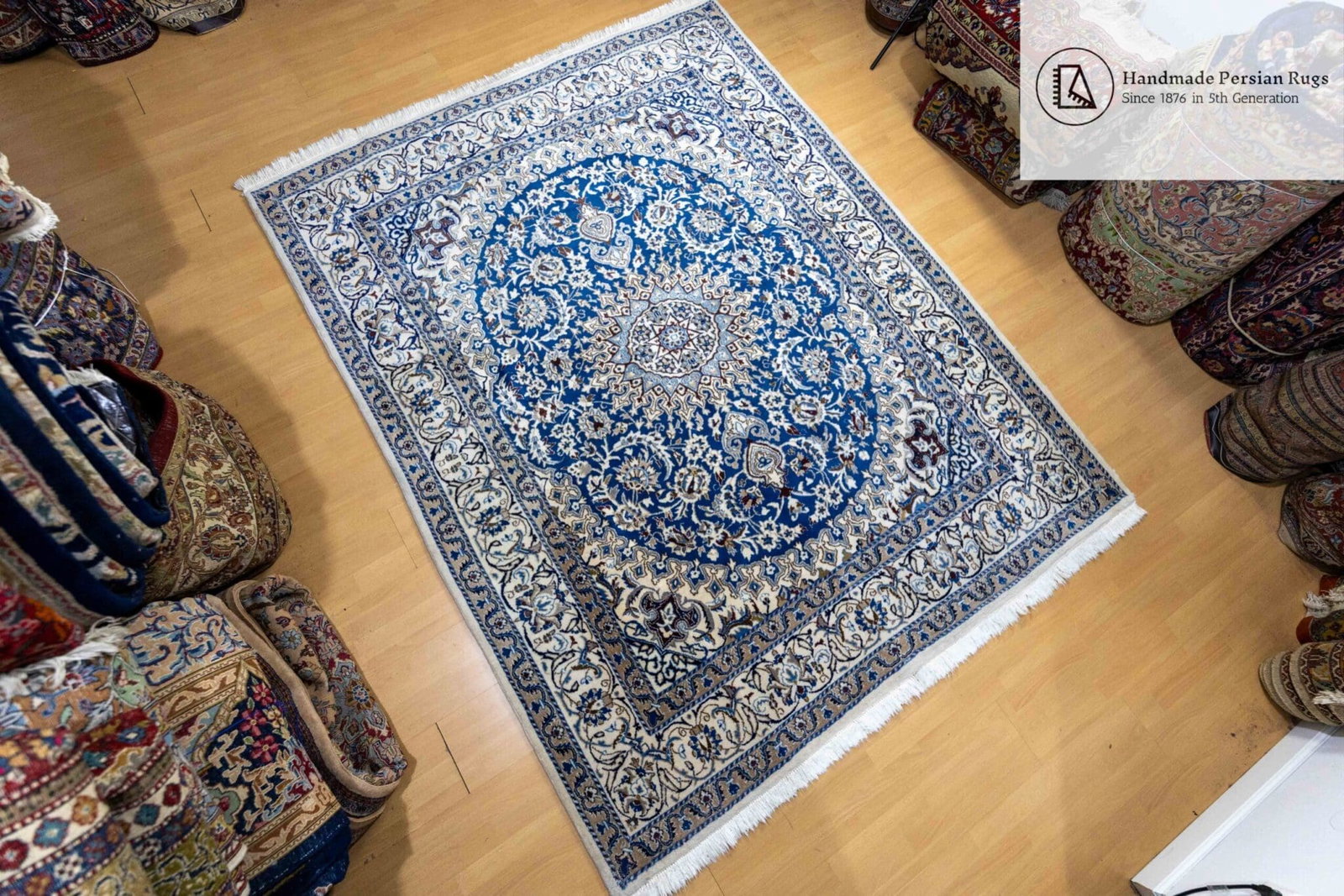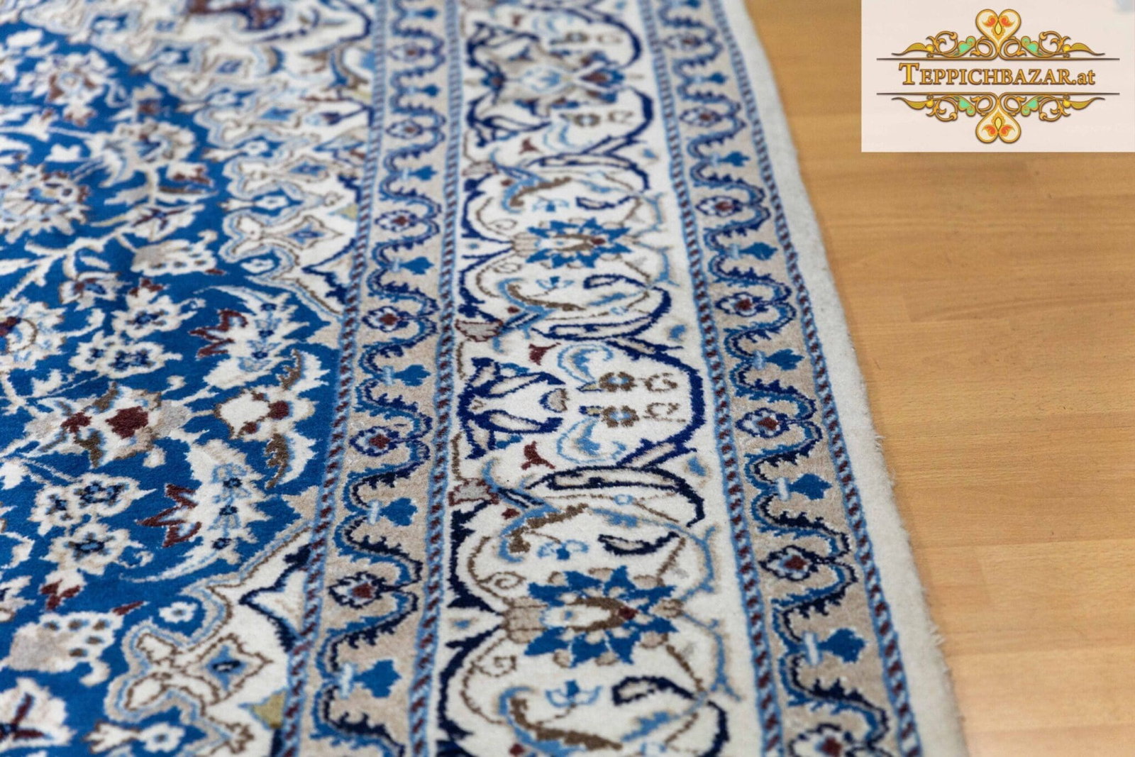 Dieser Teppich befindet sich in einem perfekten, neuen Zustand und wurde bereits einer professionellen Handwäsche unterzogen, um seine Schönheit und Reinheit zu gewährleisten. Er ist bereit, Ihr Zuhause mit seinem Reichtum und seiner Eleganz zu bereichern.