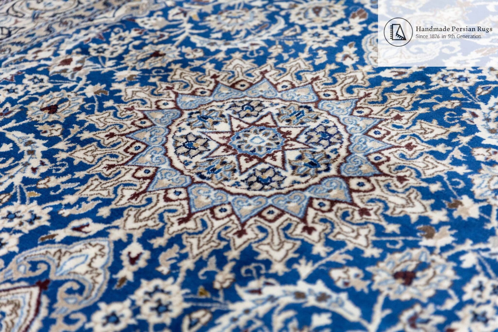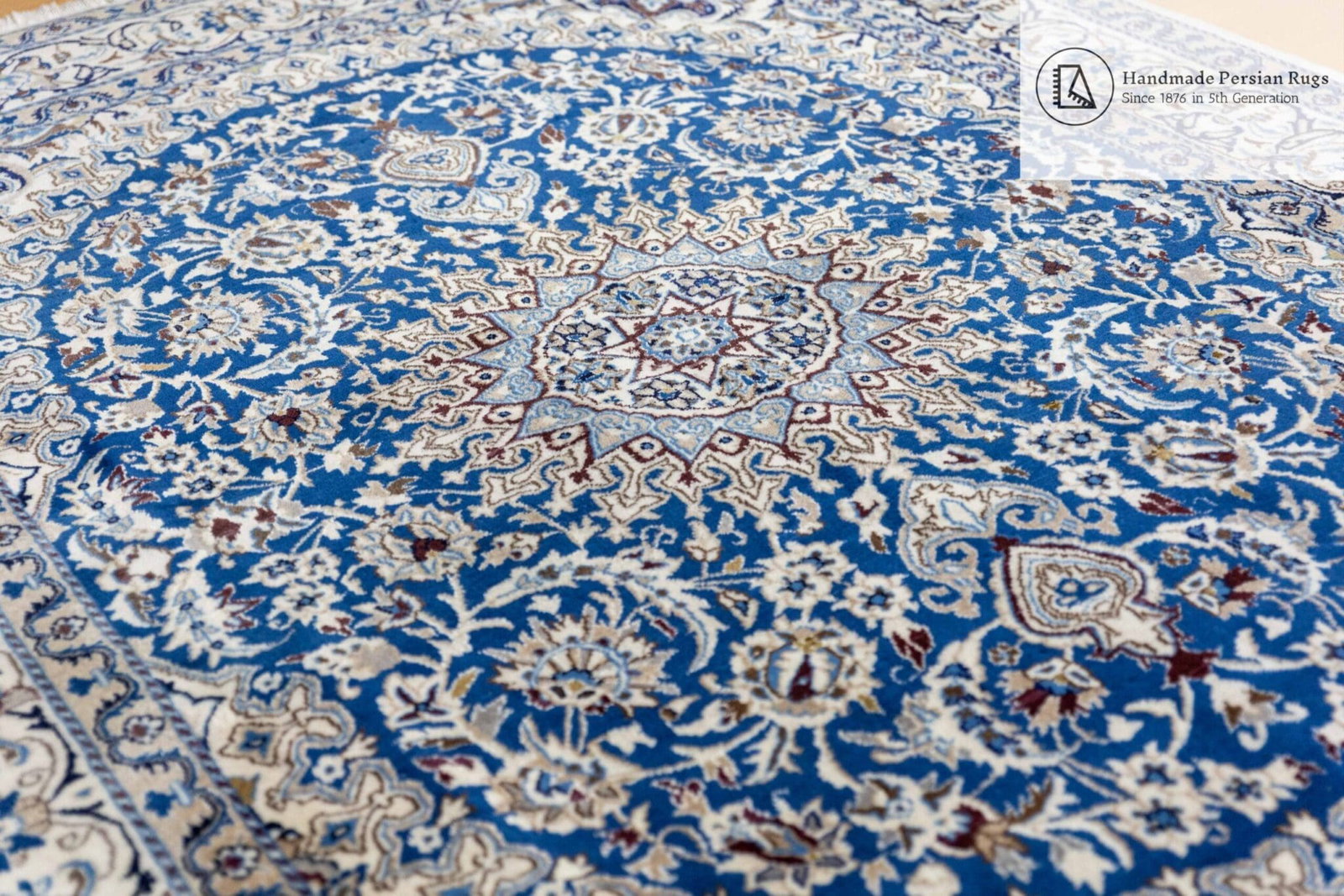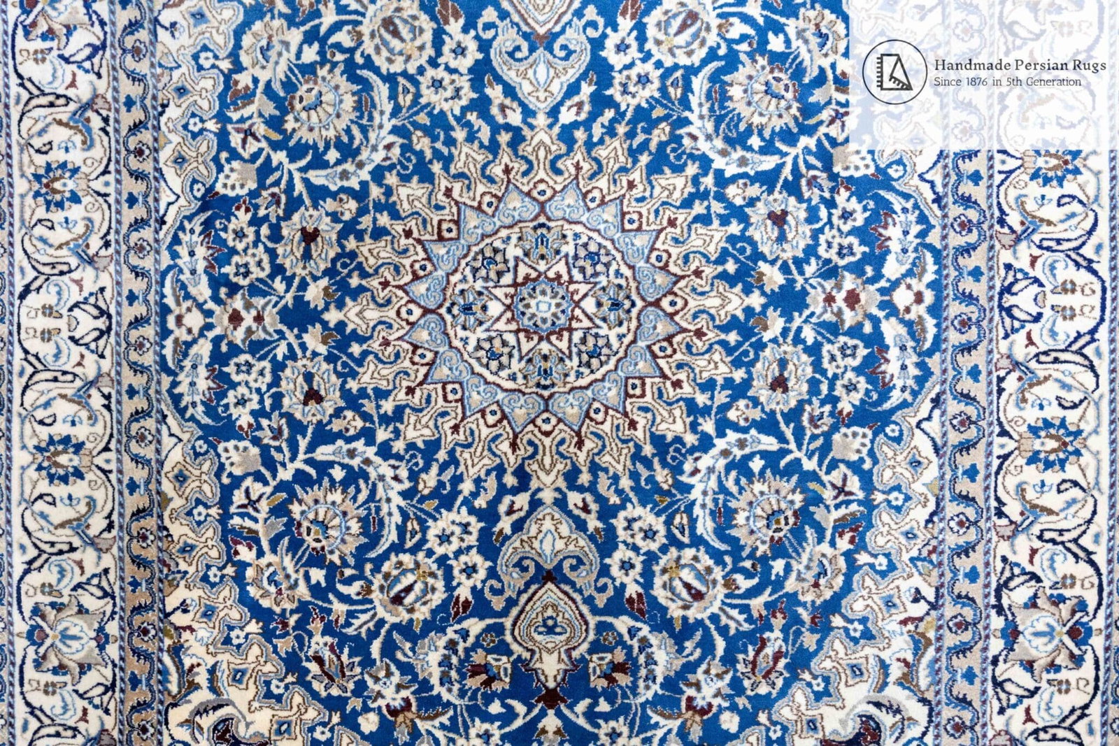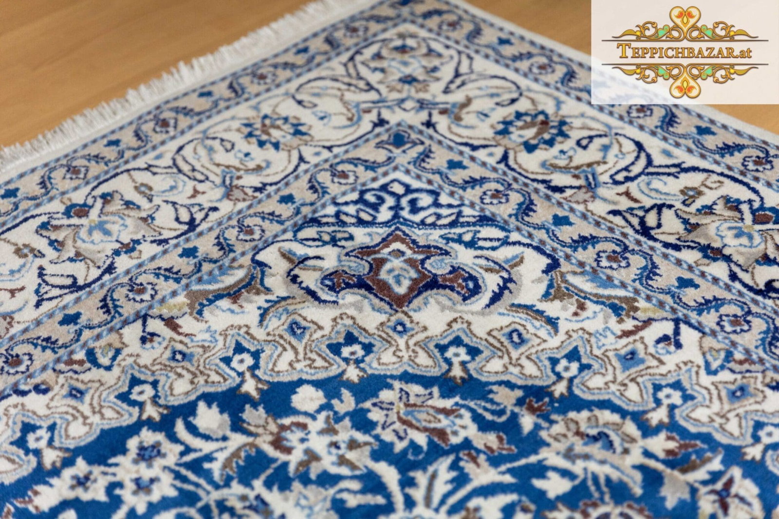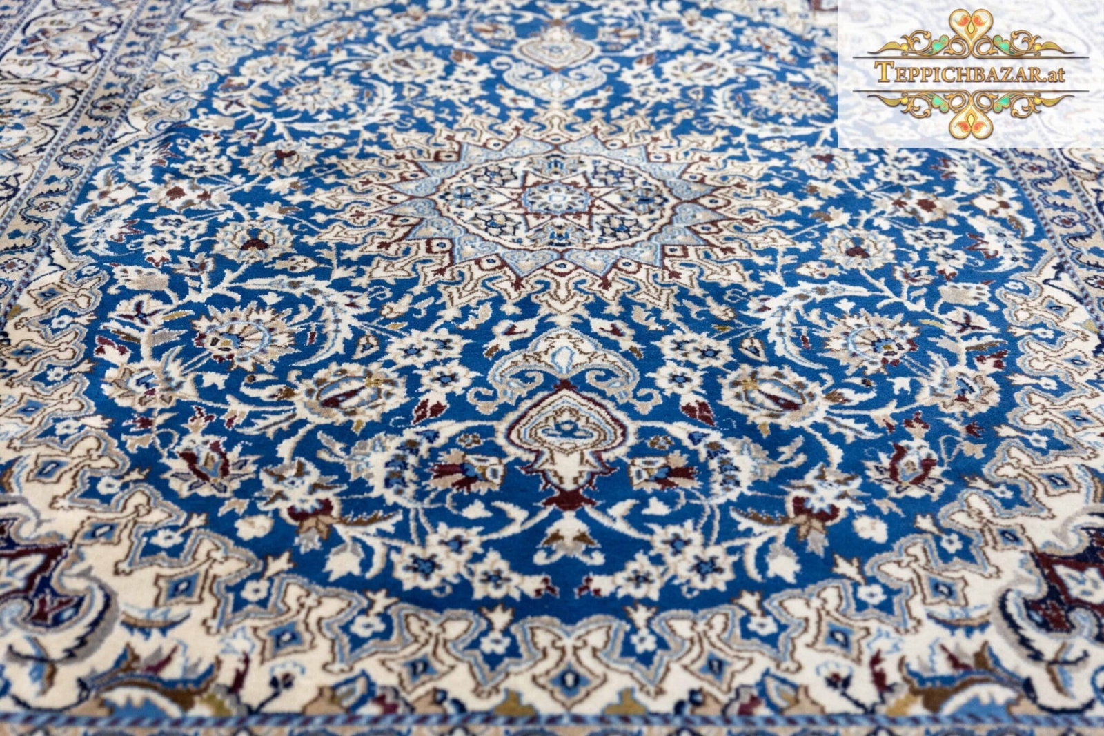 Größe: 284x191cm | Knotendichte: 12La (ca. 250.000 Knoten/qm) | Muster: Lachak-Toranj Nain-Medaillon | Herkunft: Stadt Nain, Persien | Zustand: NEU, professionelle Handwäsche durchgeführt | Material: Flor 100% Wolle mit Seide, Kette 100% Baumwolle