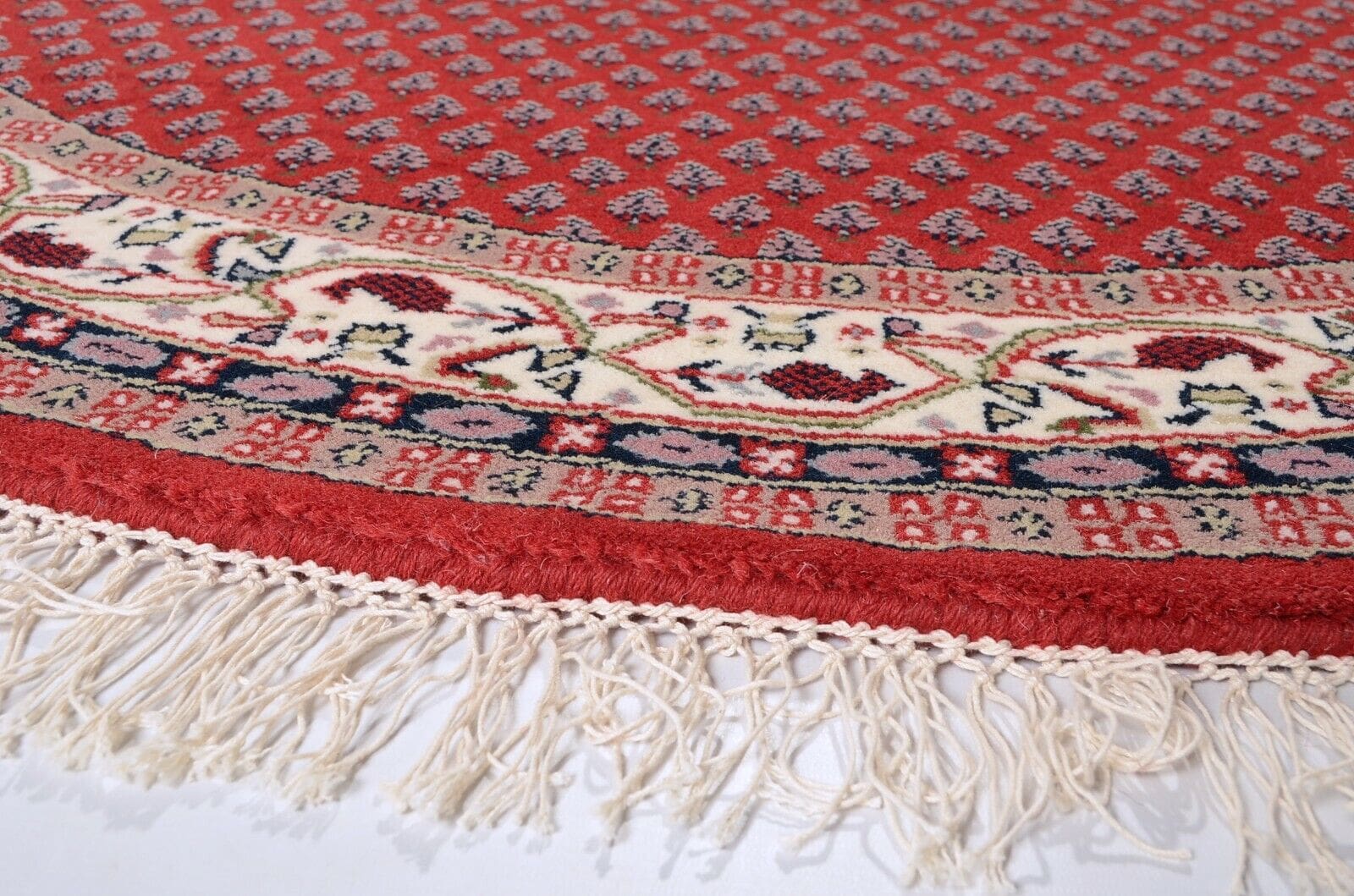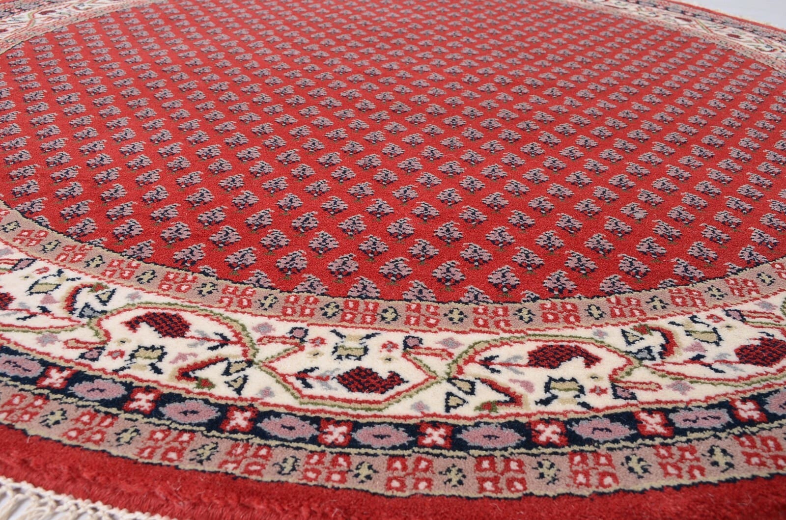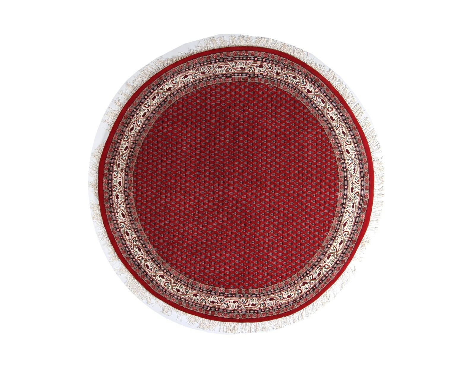 Runder Indo Sarough Mir Teppich | Größe: 100 x 100 cm | Material: 100% Schurwolle | Knotendichte: 120.000 – 140.000 Knoten/m² | Dicke: ca. 15 mm | Zustand: Neu, perfekt | Herkunft: Indien | Farbe: Rot | Stil: Traditionell Persisch/Orientalisch | Für Fußbodenheizung geeignet