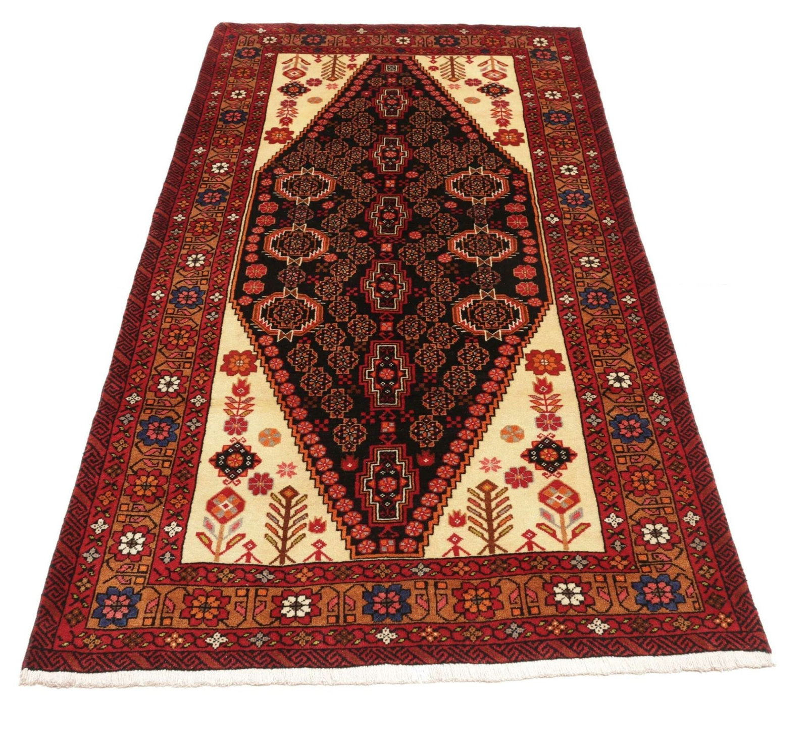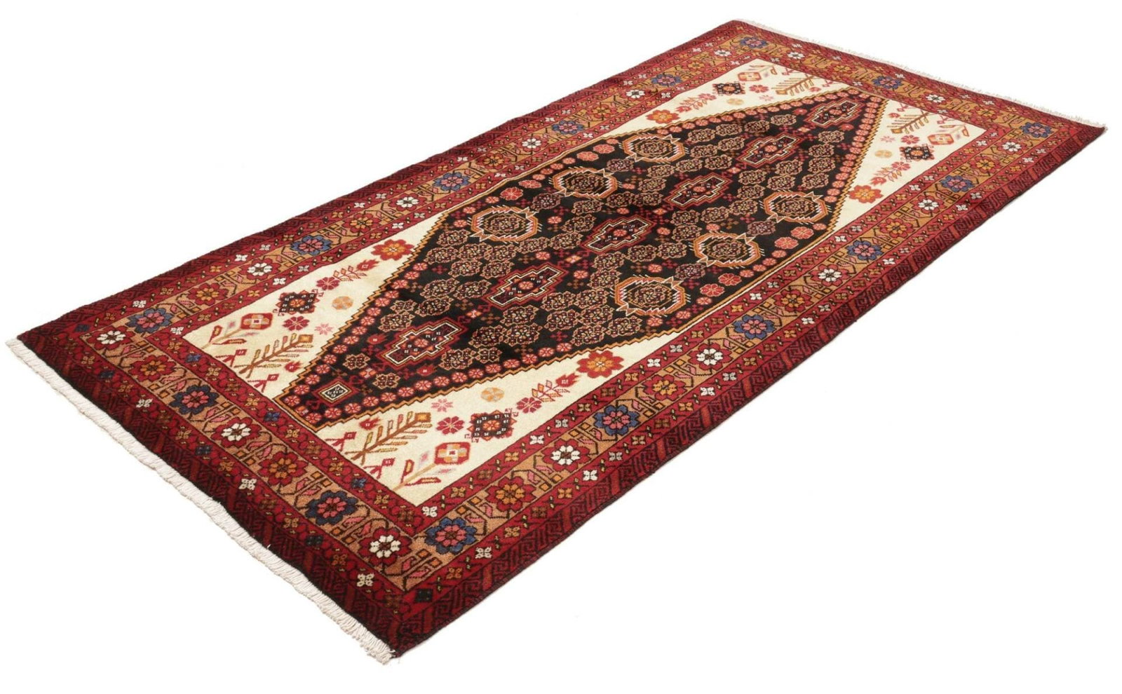 Handgeknüpfter persischer Teppich | Knotendichte: ca. 200.000 Knoten/m² | Material: 100% Schurwolle (Flor), 100% Baumwolle (Kette) | Größe: 108 x 213 cm | Höhe: ca. 7-10 mm | Herkunft: Iran | Muster: Aufwändige florale und geometrische Formen | Zustand: Ausgezeichnet