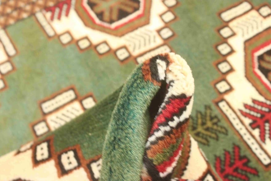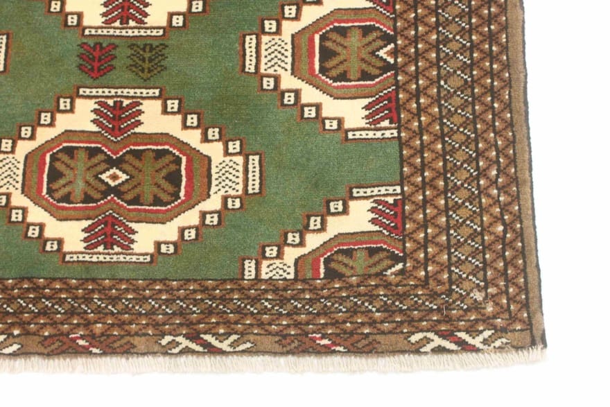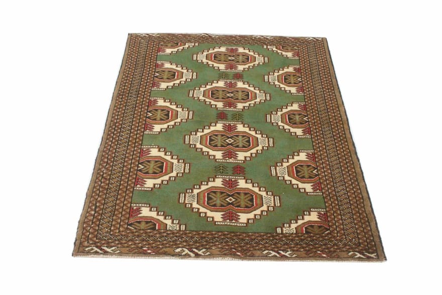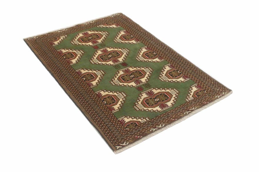 Handgeknüpfter Turkaman-Teppich | Knotendichte: 128.000 – 160.000 Knoten/m² | Material: 100 % handgesponnene Wolle | Größe: 143×101 cm | Herkunft: Iran/Persien | Zustand: Neuzeitlich (0-20 Jahre) | Farbe: Grün/Oliv | Form: Rechteckig | Gewicht: ca. 4 kg