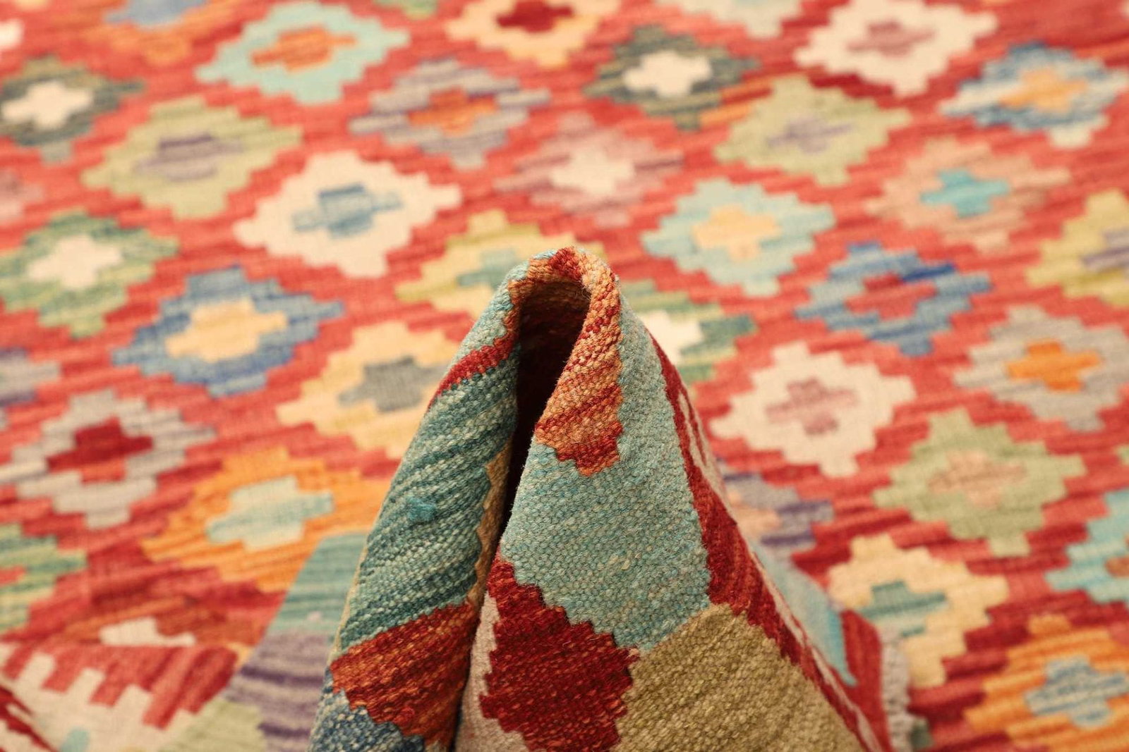 Neben der ästhetischen Anziehungskraft bietet dieser handgewebte Orientteppich auch praktische Vorteile. Er ist pflegeleicht und aufgrund der Robustheit der Schurwolle äußerst strapazierfähig. Das natürliche Material ist zudem hypoallergen und bietet eine gesunde Wohnatmosphäre. Der Teppich ist ideal für Wohnräume, Schlafzimmer oder auch als stilvolle Ergänzung in Fluren und Eingangsbereichen. Der Kelim-Teppich setzt nicht nur Farb- und Strukturakzente, sondern fungiert auch als schalldämpfendes Element, das Raumklänge reduziert und ein behagliches Umfeld schafft.