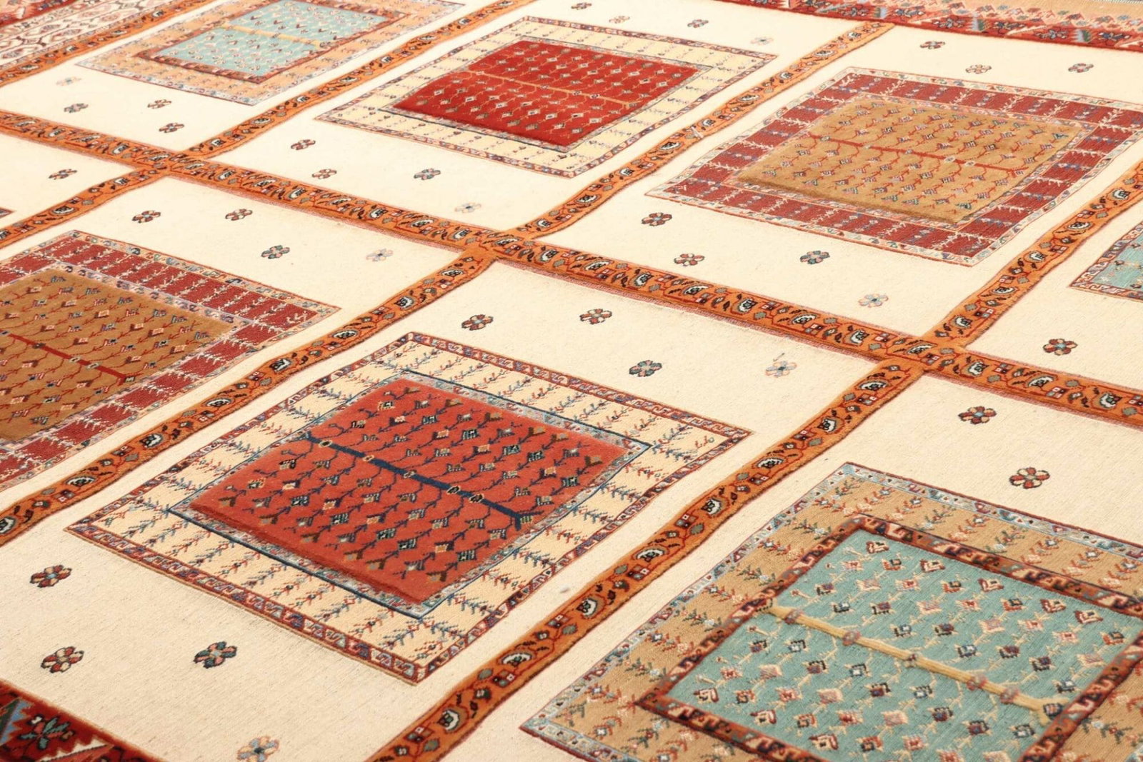Die Kombination aus traditioneller Knüpftechnik, hochwertigen Materialien und ansprechendem Design macht diesen Teppich zu einem zeitlosen Stück, das Generationen überdauern kann.