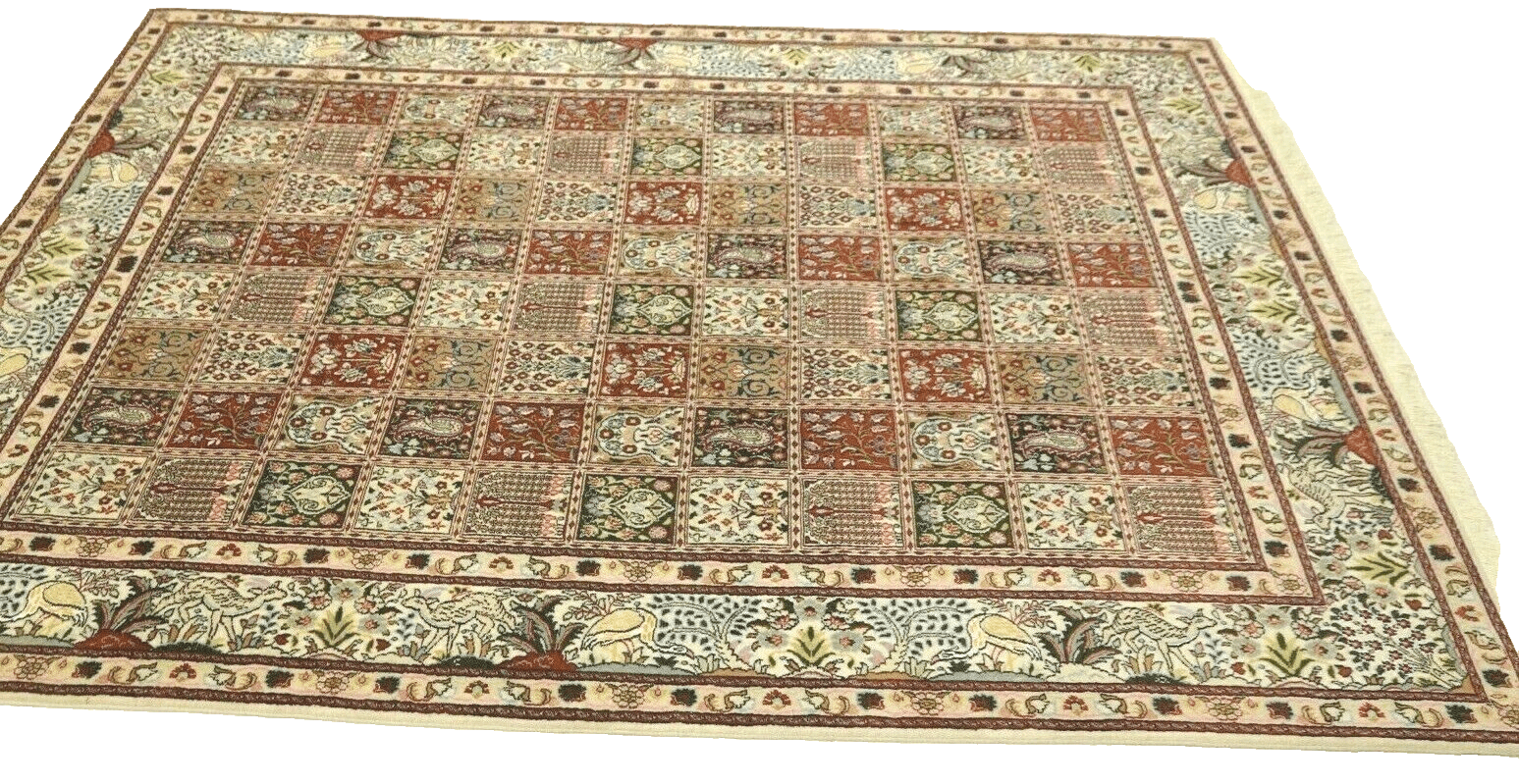 Die Farbpalette variiert in warmen Erd- und Naturtönen, die es leicht machen, den Teppich in verschiedene Einrichtungsstile zu integrieren, von traditionell bis modern. Die Details sind so präzise gearbeitet, dass man bei näherer Betrachtung immer neue Facetten entdecken kann.