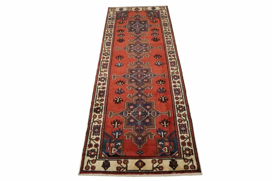 Handgeknüpfter Teppich aus Hamedan | Knotendichte: 160.000 – 200.000 Knoten/m² | Material: Wolle (Flor), Baumwolle (Kette) | Größe: 318×111 cm | Zustand: Neuzeitlich (0-20 Jahre) | Ursprung: Iran/Persien | Farbe: Rot/Orange | Form: Läufer | Dicke: ca. 10 mm | Gewicht: ca. 10 kg