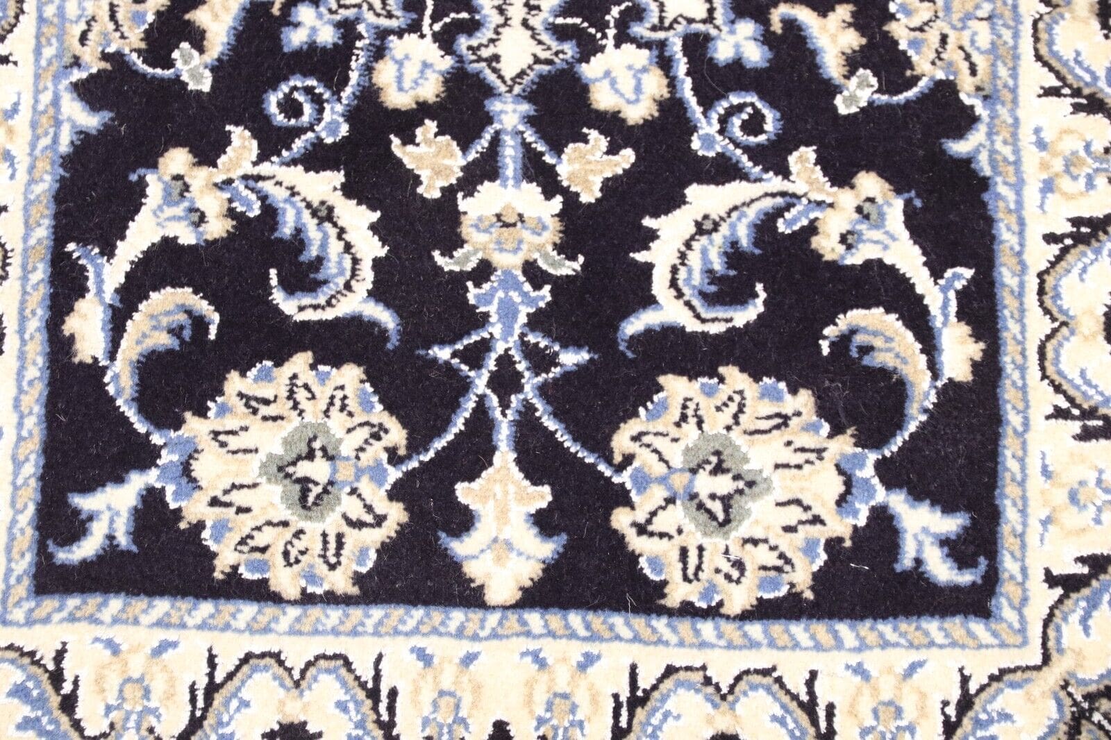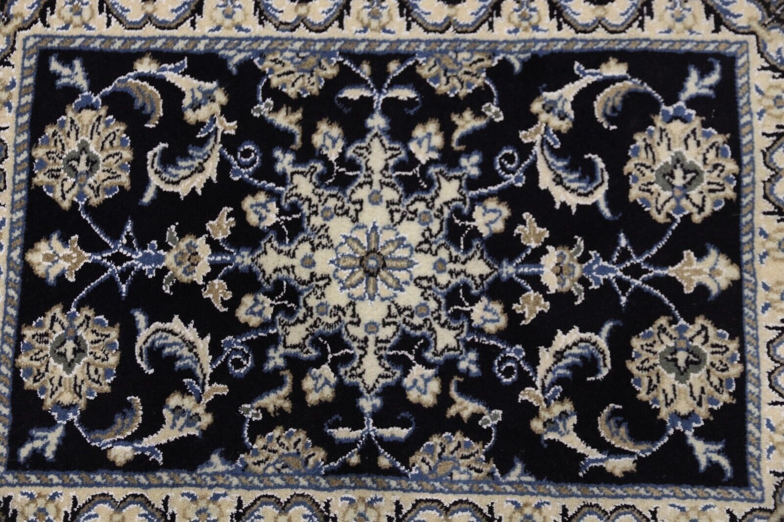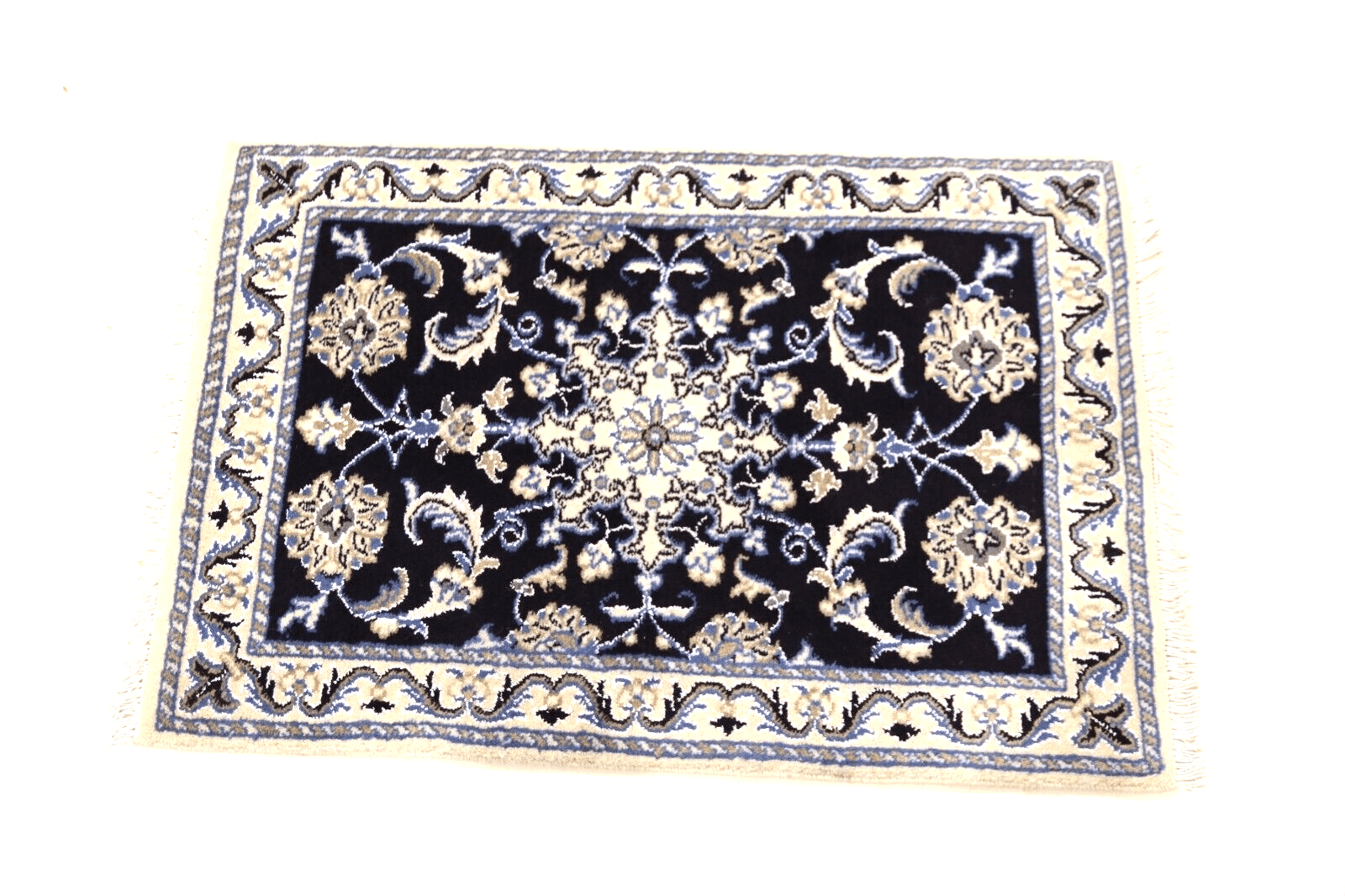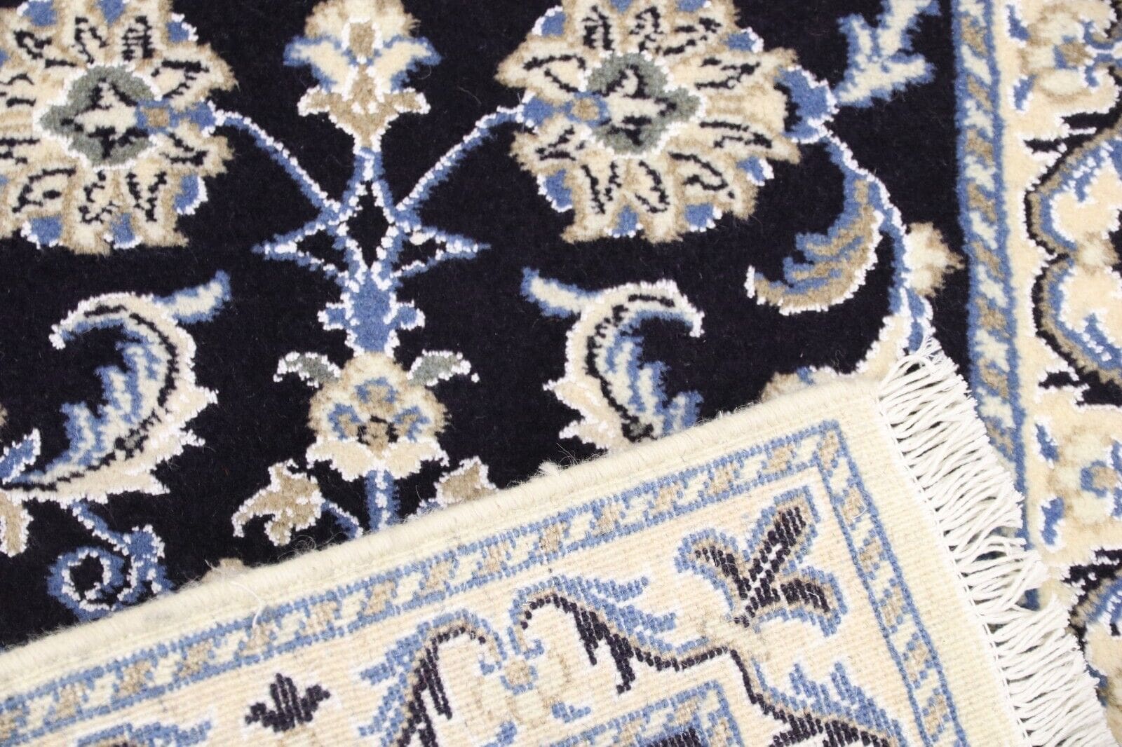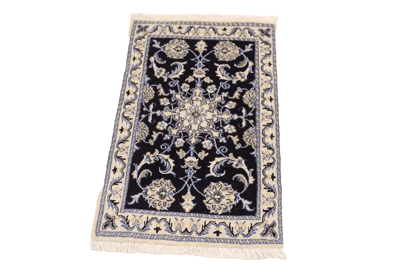 Orientteppich Super Nain | Größe: 90 x 60 cm | Knotendichte: ca. 300.000 Knoten/m² | Material: 90 % Schurwolle, 10 % Seide, 100 % Baumwolle | Zustand: Neu | Herkunft: Persien | Dicke: ca. 8 mm | Stil: Traditionell orientalisch/persisch | Besonderheiten: Handgeknüpft, für Fußbodenheizung geeignet, haustier- und kinderfreundlich, mottenresistent | Farbe: Dunkelblau | Design: Orientalisch