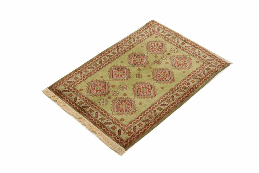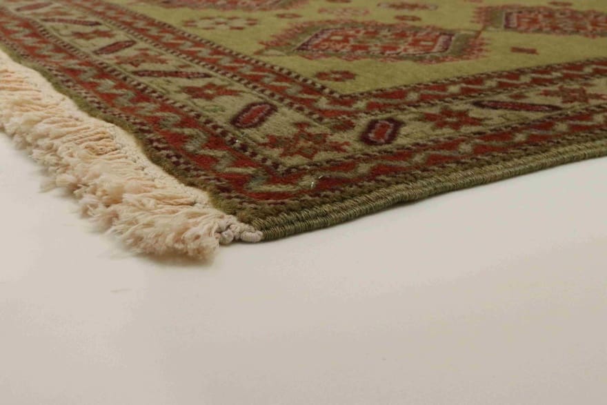 Antiker russischer Teppich | Knotendichte: 160.000 – 200.000 Knoten/m² | Material: Wolle und Baumwolle | Größe: 95×63 cm | Farbe: Grün/Oliv | Form: Rechteckig | Dicke: ca. 6 mm | Gewicht: ca. 2 kg | Herkunft: Russland | Handgeknüpft