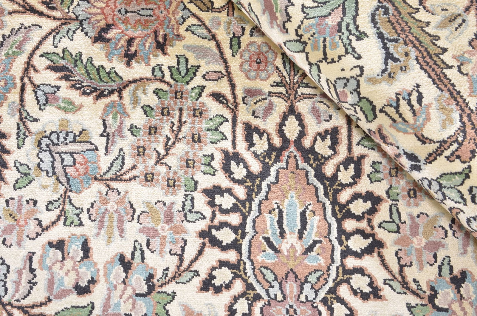 Die Verwendung von Seide verleiht dem Teppich nicht nur eine unvergleichliche Schönheit, sondern auch eine außergewöhnliche Widerstandsfähigkeit gegen Abnutzung. Seide ist bekannt für ihre glänzenden Eigenschaften und sorgt dafür, dass der Teppich unter verschiedenen Lichtverhältnissen immer strahlend aussieht. Die Kette aus Baumwolle sorgt für eine robuste Struktur, die dennoch die Eleganz des Seidenfloors unterstützt. Diese Kombination macht den Teppich sowohl für den täglichen Gebrauch als auch für repräsentative Zwecke geeignet.