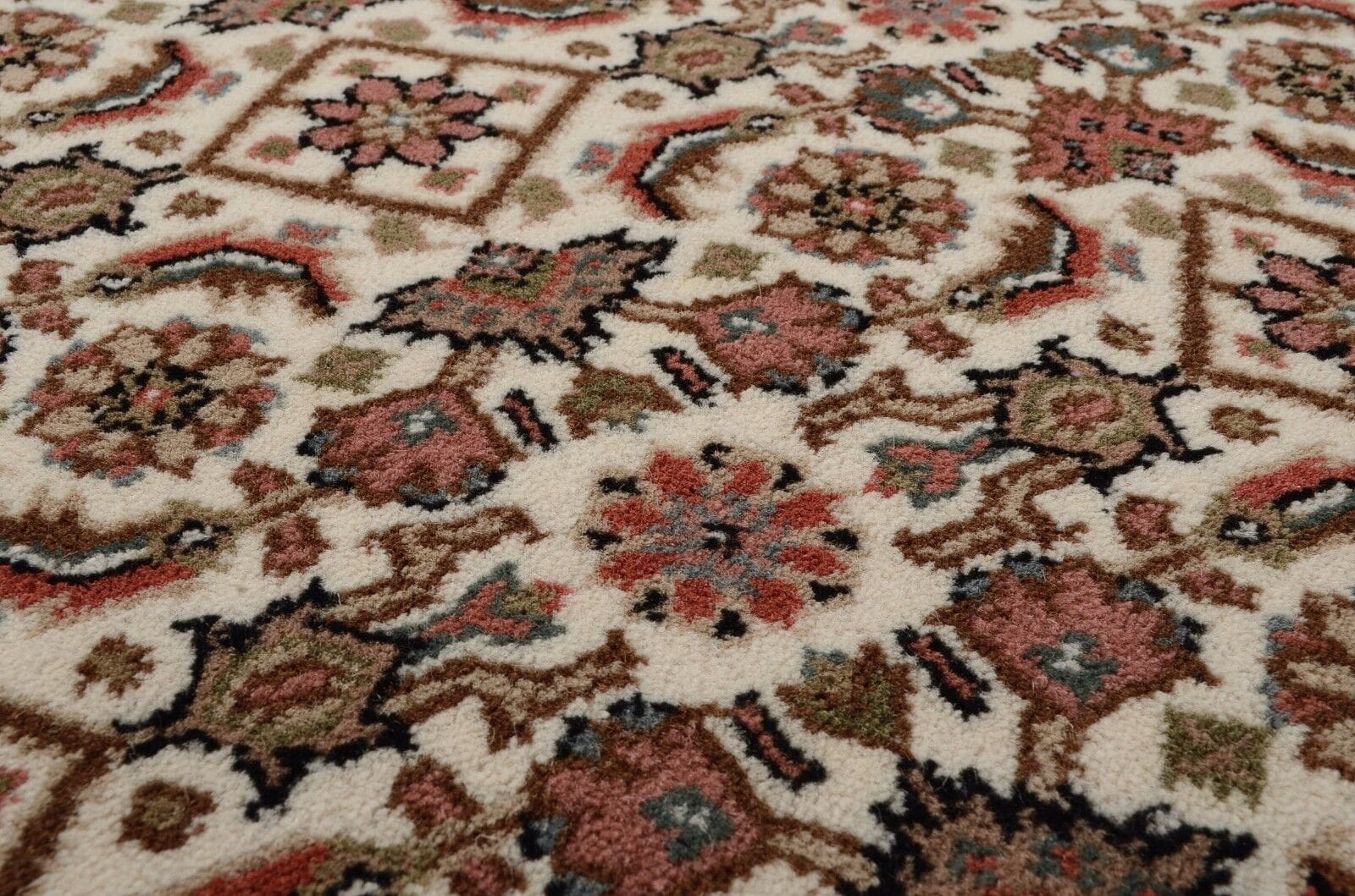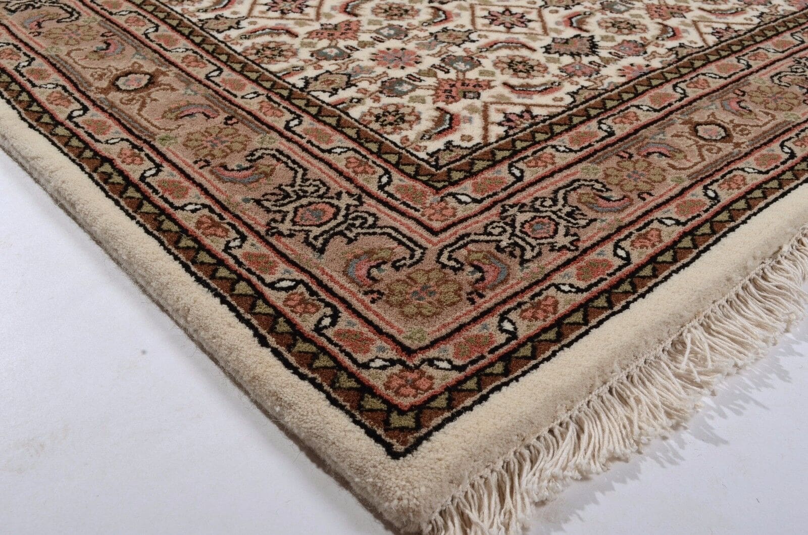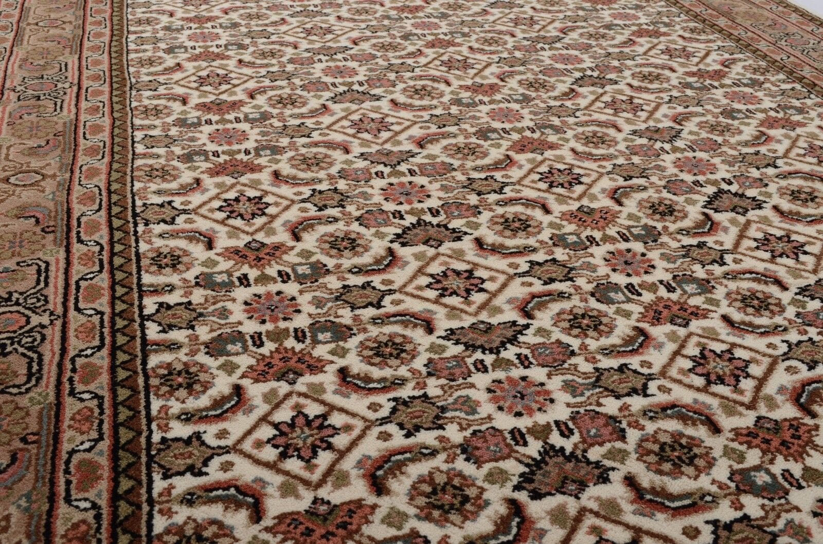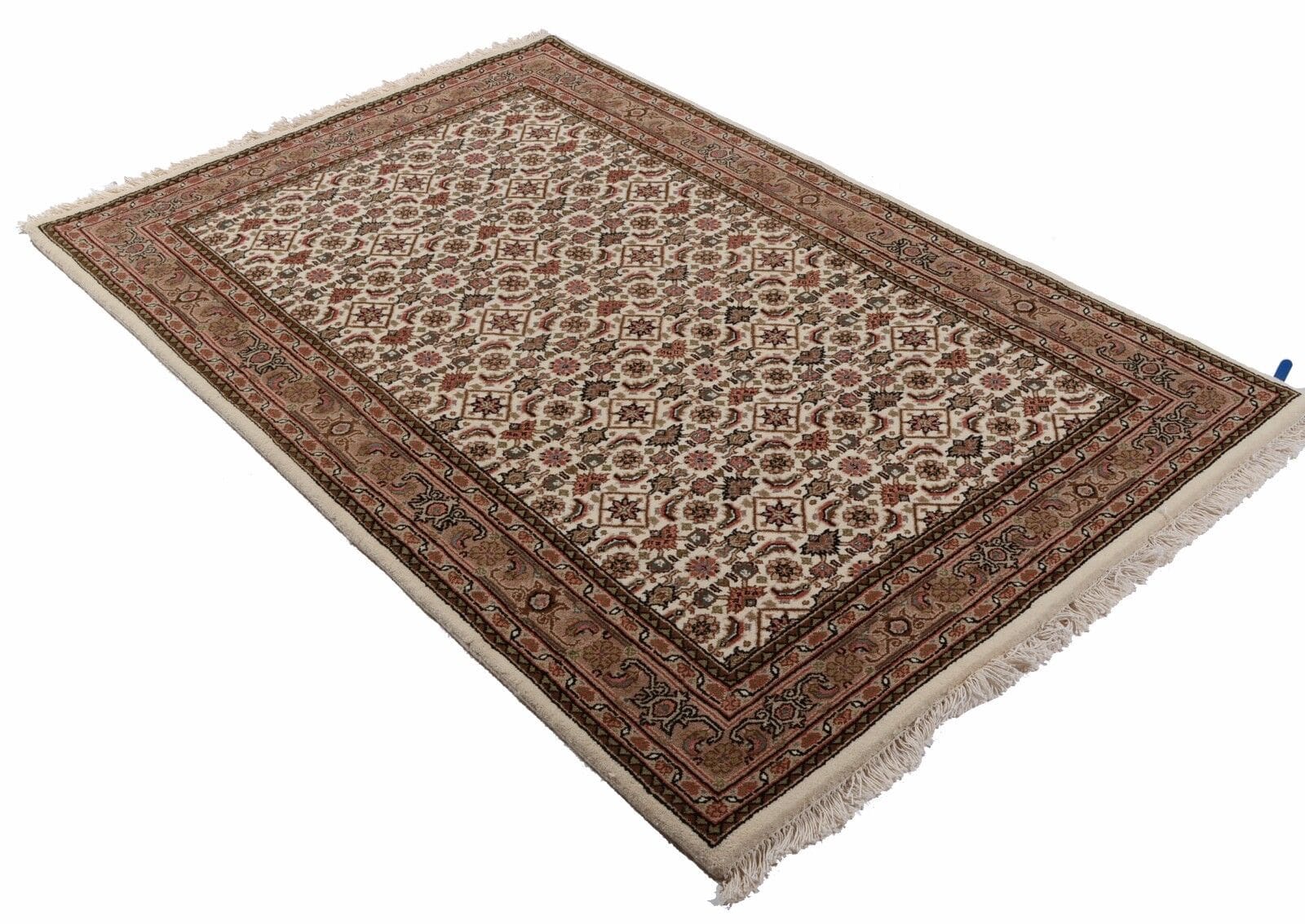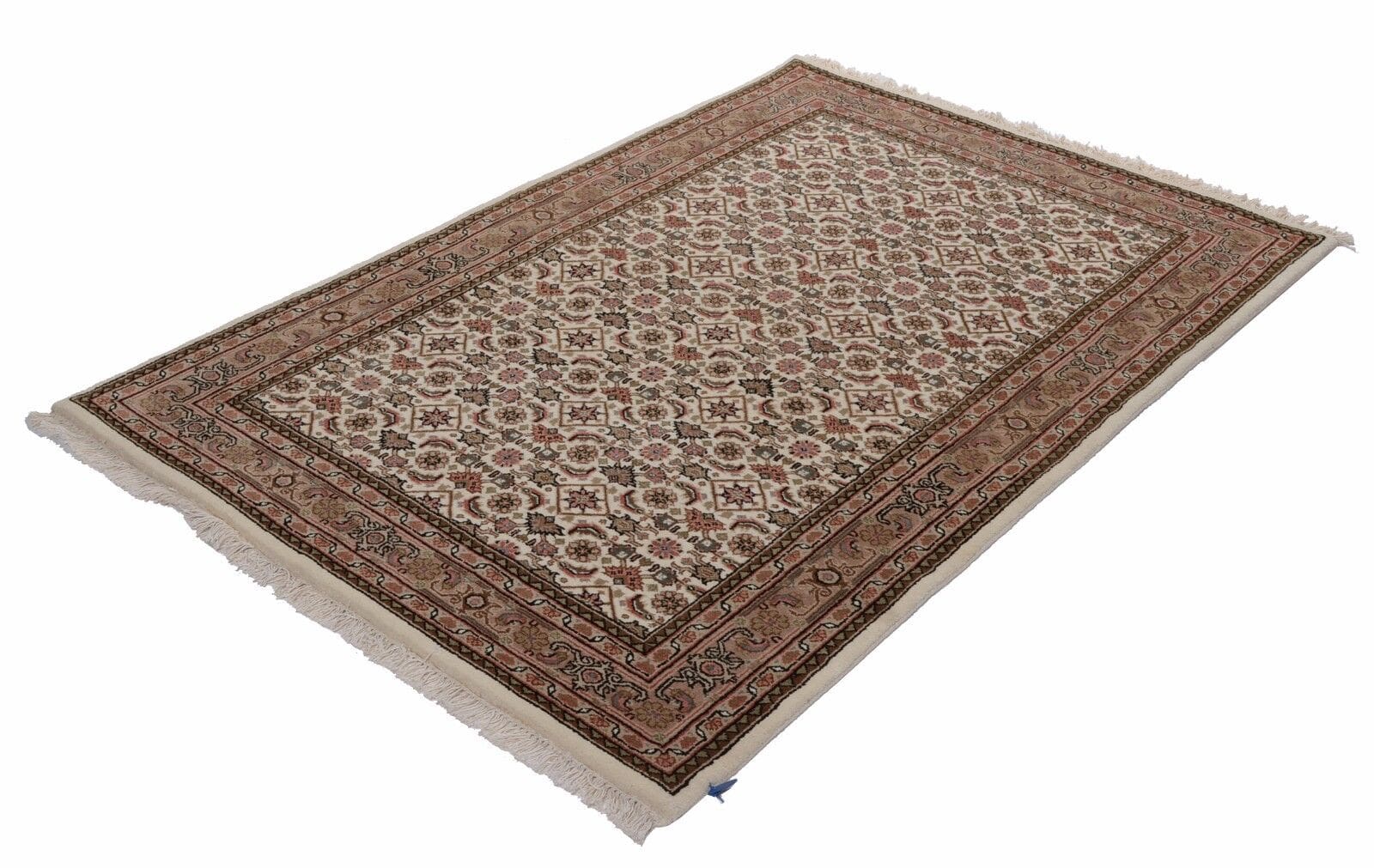 Handgeknüpfter Orientteppich | Geometrisches Muster in Beige | Knotendichte: 155.000 – 185.000 Knoten/m² | Material: 100% Schurwolle | Dicke: ca. 15 mm | Gewicht: ca. 4,5 kg/m² | Zustand: Neu, perfekt | Herkunft: Indien | Für Fußbodenheizung geeignet | Größe: Verschiedene Standardmaße verfügbar