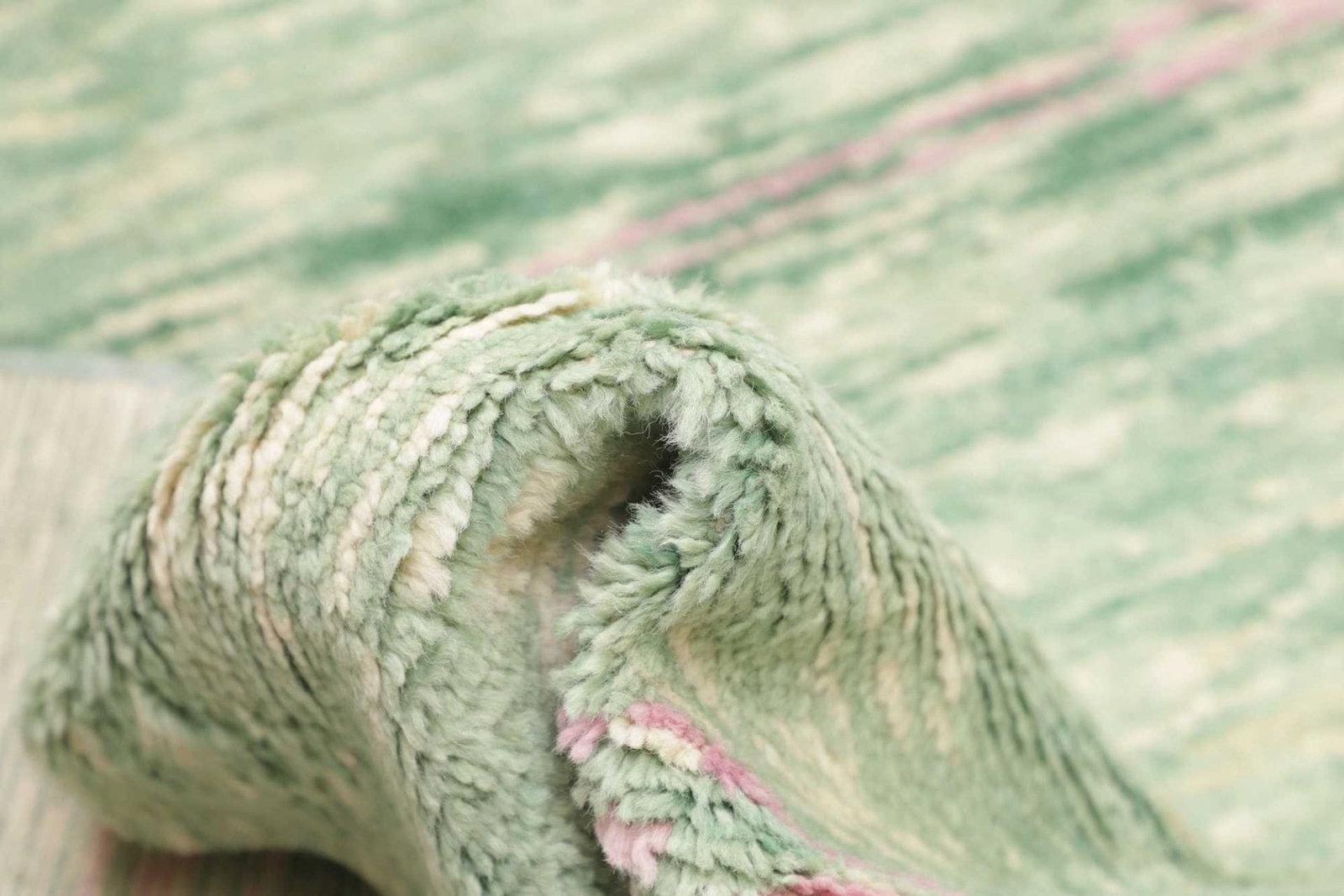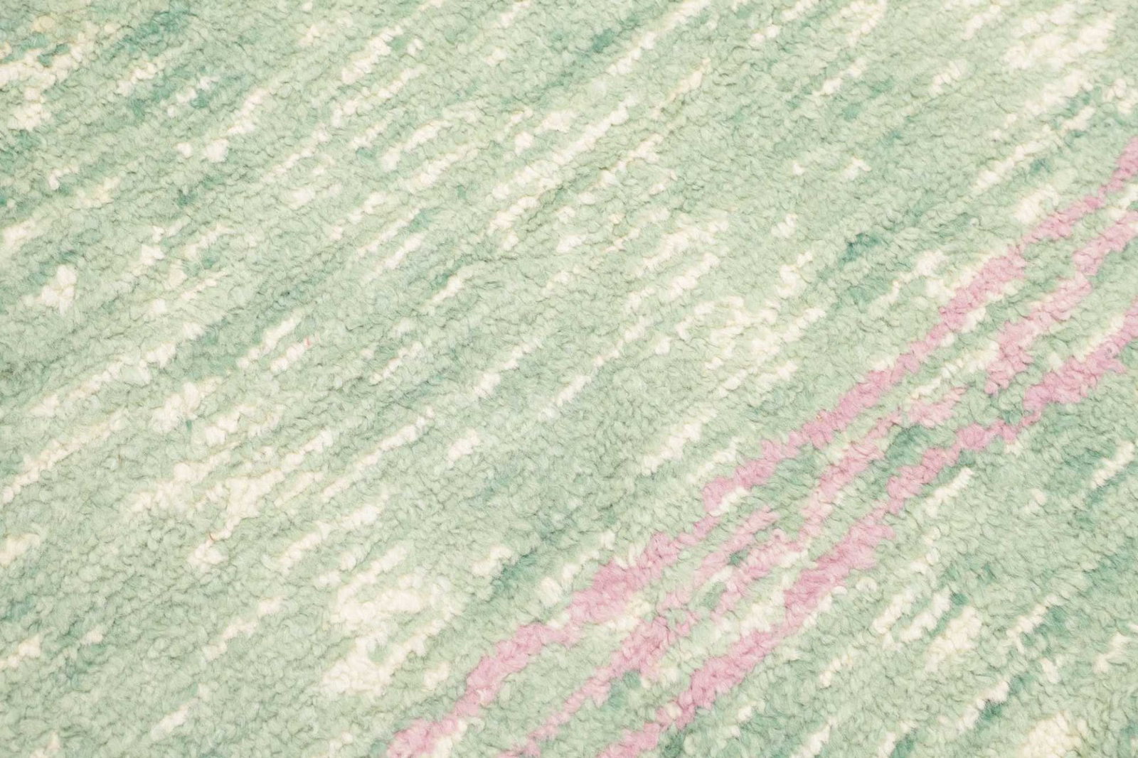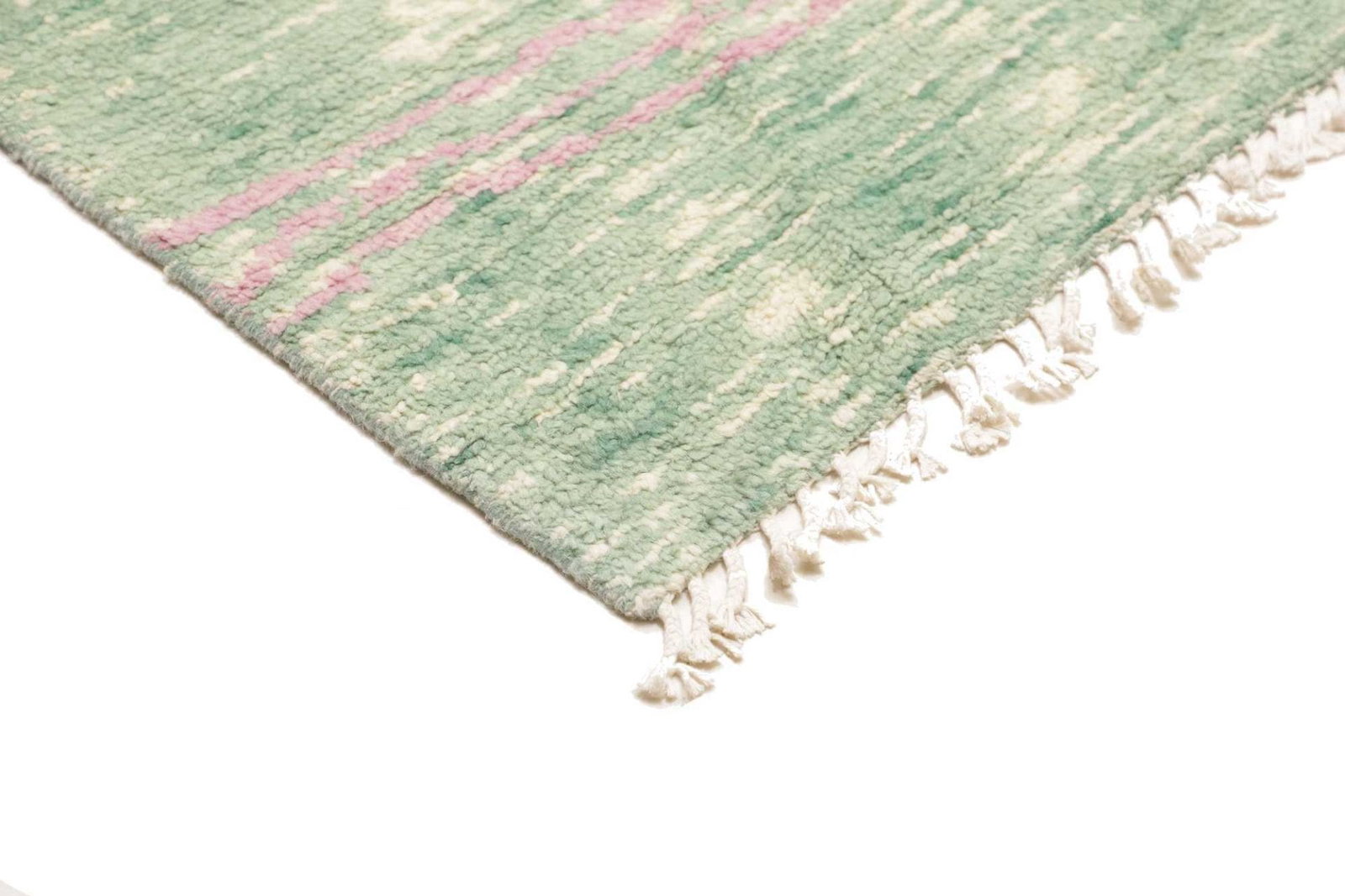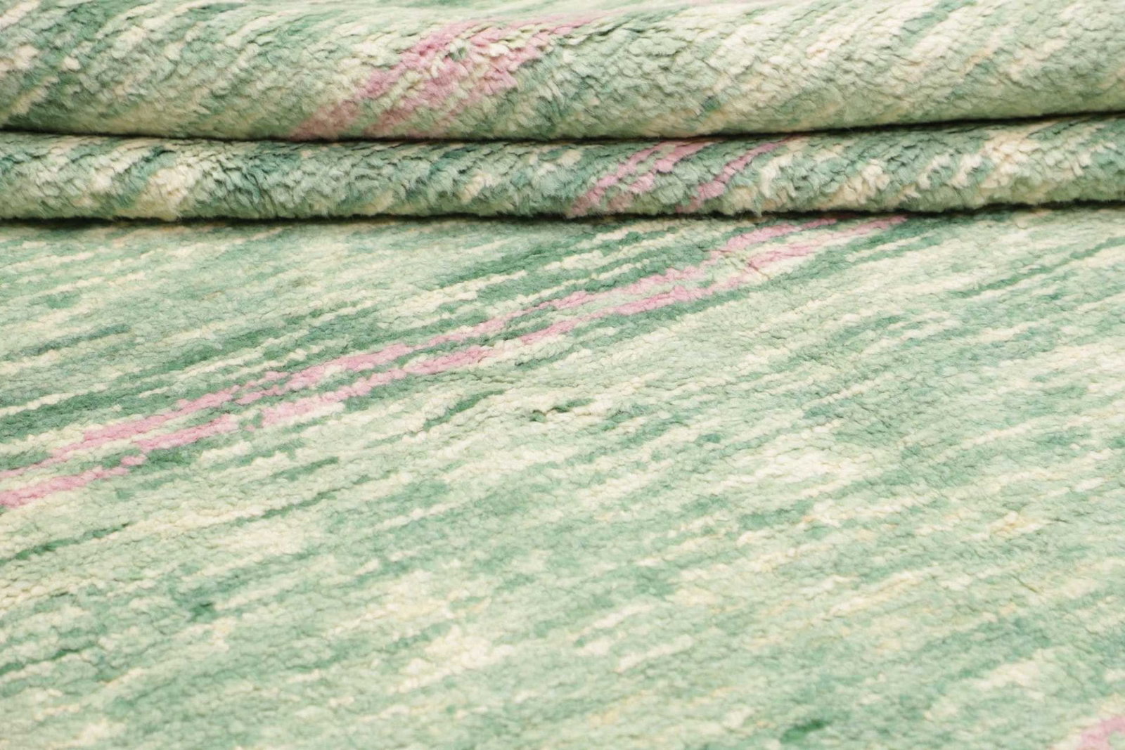 Dieser Berber Teppich ist handgeknüpft und besteht aus 100% Schurwolle für den Flor sowie einer Kette aus 100% Baumwolle. Die Verwendung von Schurwolle verleiht dem Teppich eine angenehme Haptik und sorgt für eine hohe Strapazierfähigkeit. Die Knotendichte liegt bei etwa 100.000 Knoten pro Quadratmeter, was auf eine sorgfältige und präzise Verarbeitung hinweist. Die Florhöhe beträgt ca. 12-15 mm, was den Teppich besonders weich und gemütlich macht.
