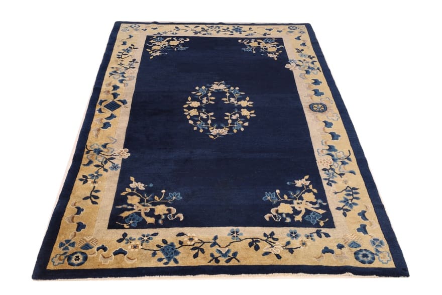 Handgewebter orientalischer Teppich „China“ | Knotendichte: 128.000 – 160.000 Knoten/m² | Material: Hochwertige Wolle und Seide | Größe: 242×157 cm | Farbe: Blau/Türkis | Alter: Antik | Herkunft: China | Verarbeitung: Handgeknüpft | Florhöhe: ca. 8 mm | Gewicht: ca. 12 kg