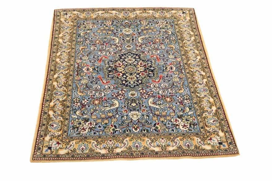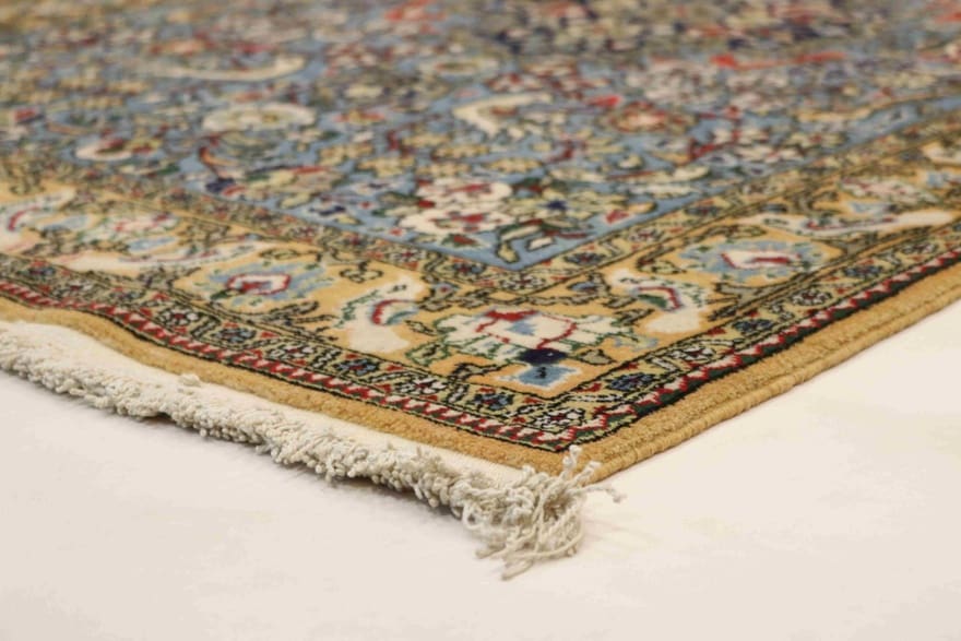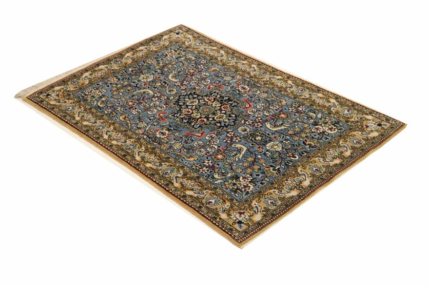 Ghom Teppich | Knotendichte: 200.000 – 250.000 Knoten/m² | Material: Handgesponnene Wolle und Baumwollkette | Größe: 156×105 cm | In neuem Zustand | Ursprung: Iran / Persien | Verarbeitung: Handgeknüpft | Farbe: Blau/Türkis | Dicke: ca. 10 mm | Gewicht: ca. 6 kg