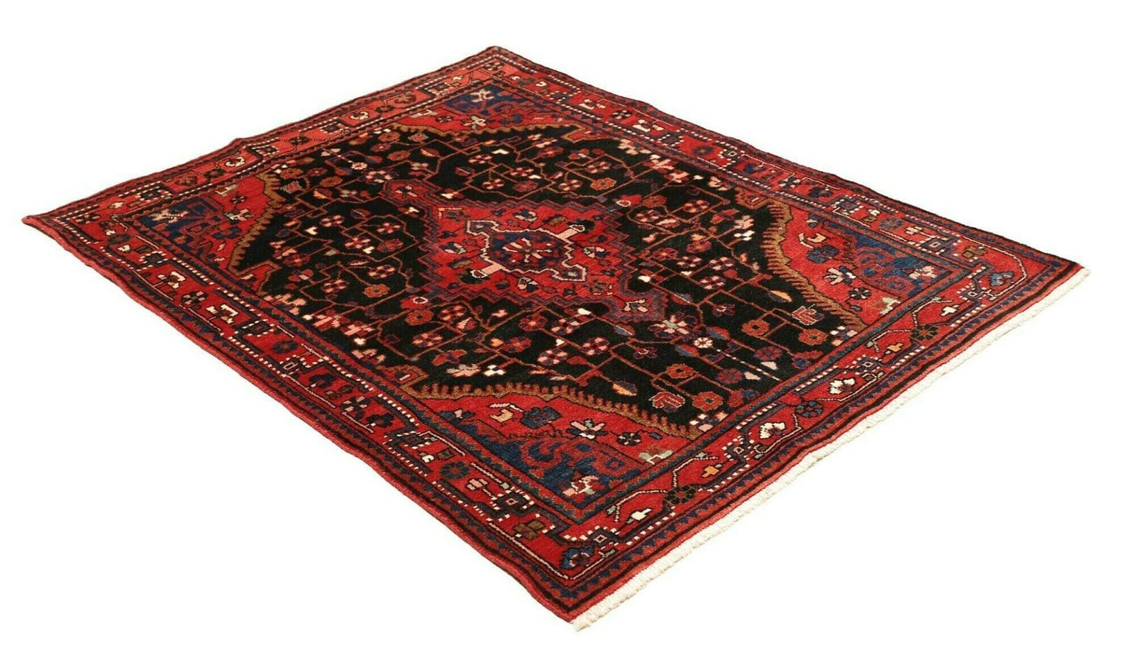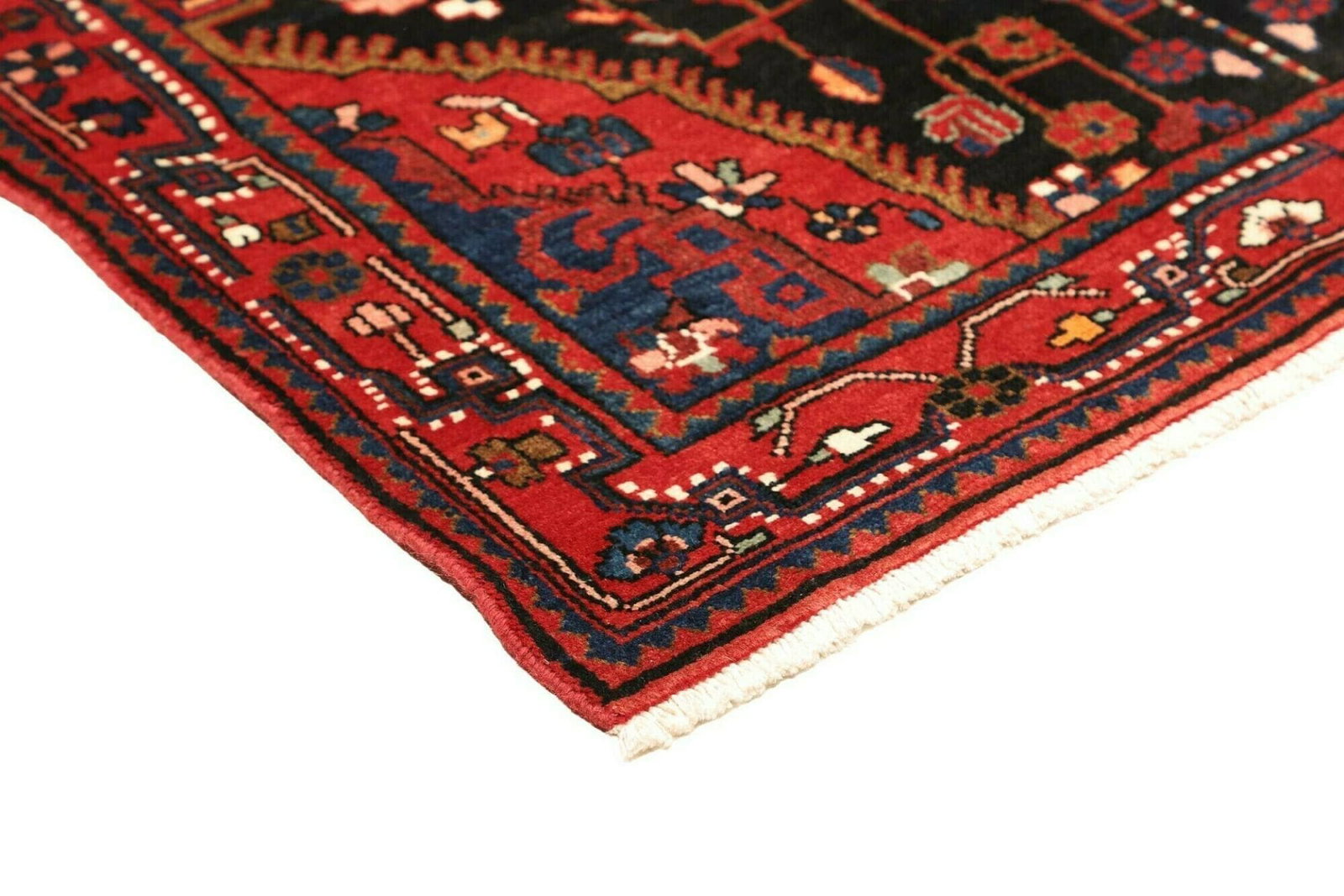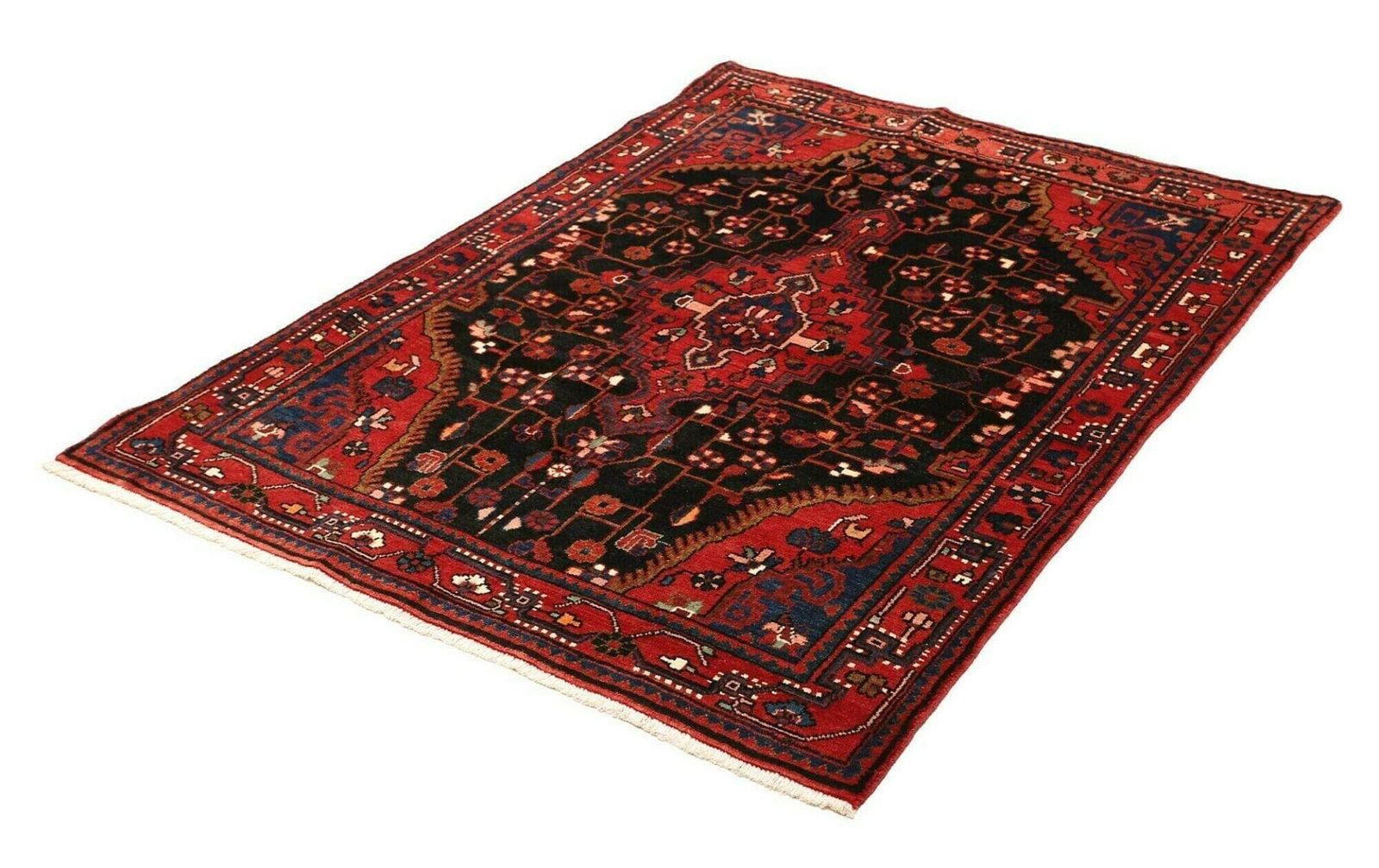 Hamadan Teppich | Knotendichte: ca. 200.000 Knoten/m² | Material: 100% Schurwolle | Größe: 118×150 cm | Zustand: Handgeknüpft, sehr gut | Herkunft: Iran | Muster: Geometrisch und Herati-Muster | Kette: 100% Baumwolle | Höhe: ca. 10-12 mm
