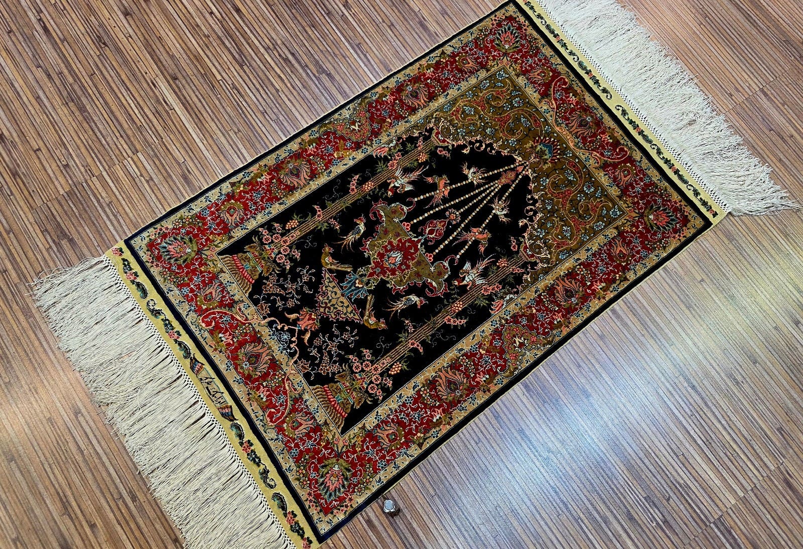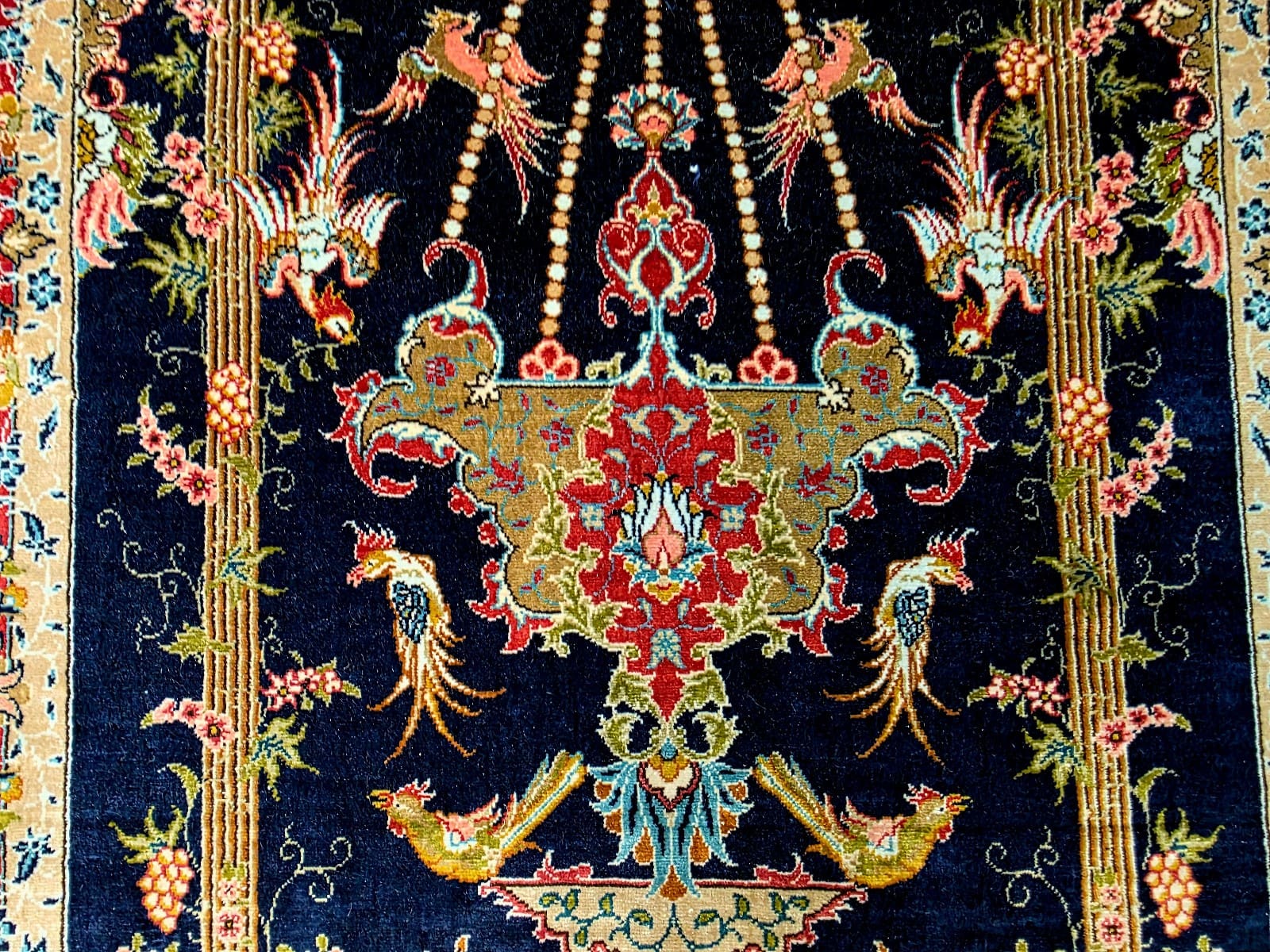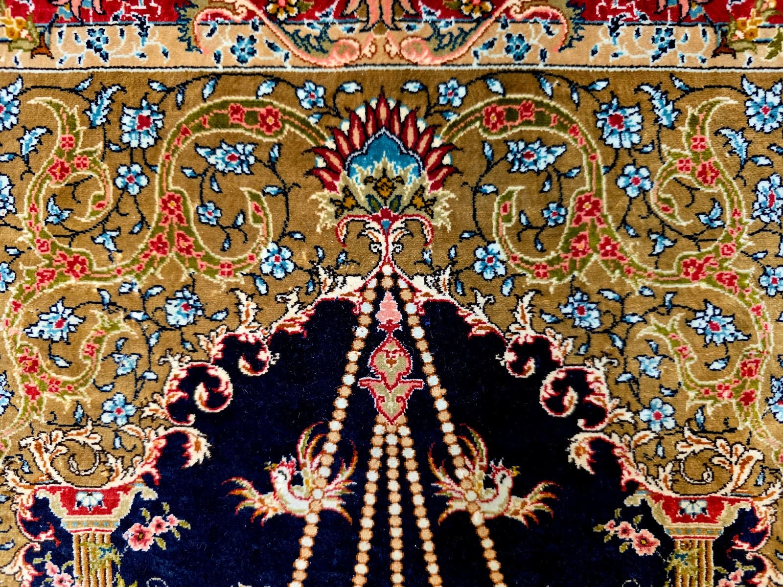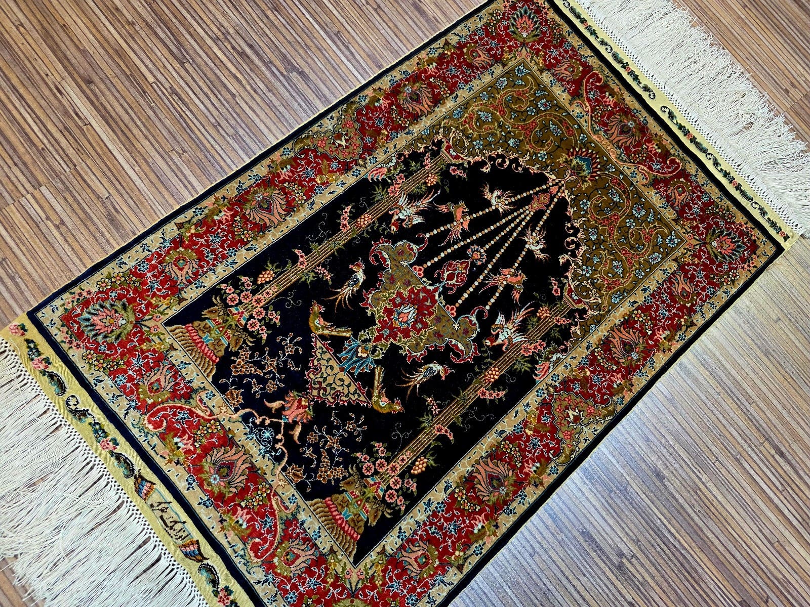 Dieser Teppich ist aus 100 % reiner Naturseide gefertigt, was ihm eine luxuriöse Textur und eine beeindruckende Farbbrillanz verleiht. Die Verarbeitung des Teppichs erfolgt handgeknüpft, was bedeutet, dass jeder Knoten von Hand erstellt wurde. Dies trägt nicht nur zur Einzigartigkeit jedes Teppichs bei, sondern auch zur Haltbarkeit und Langlebigkeit des Produkts. Der Teppich weist eine besonders hohe Feinheit mit einer Knotendichte von 2.250.000 Knoten/m² auf, was ihn zu einem der feinsten handgeknüpften Teppiche macht. Durch diese hohe Knotendichte erhält der Teppich eine detaillierte Musterung und eine außergewöhnliche Strapazierfähigkeit.