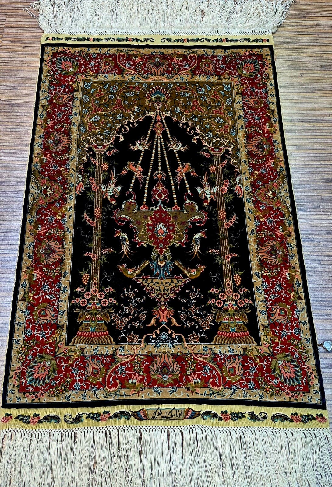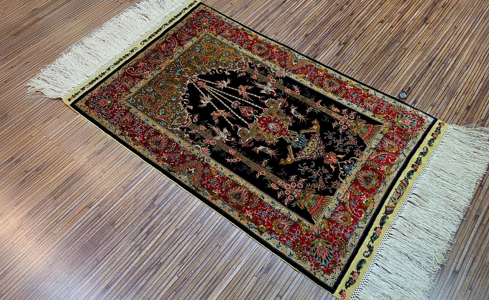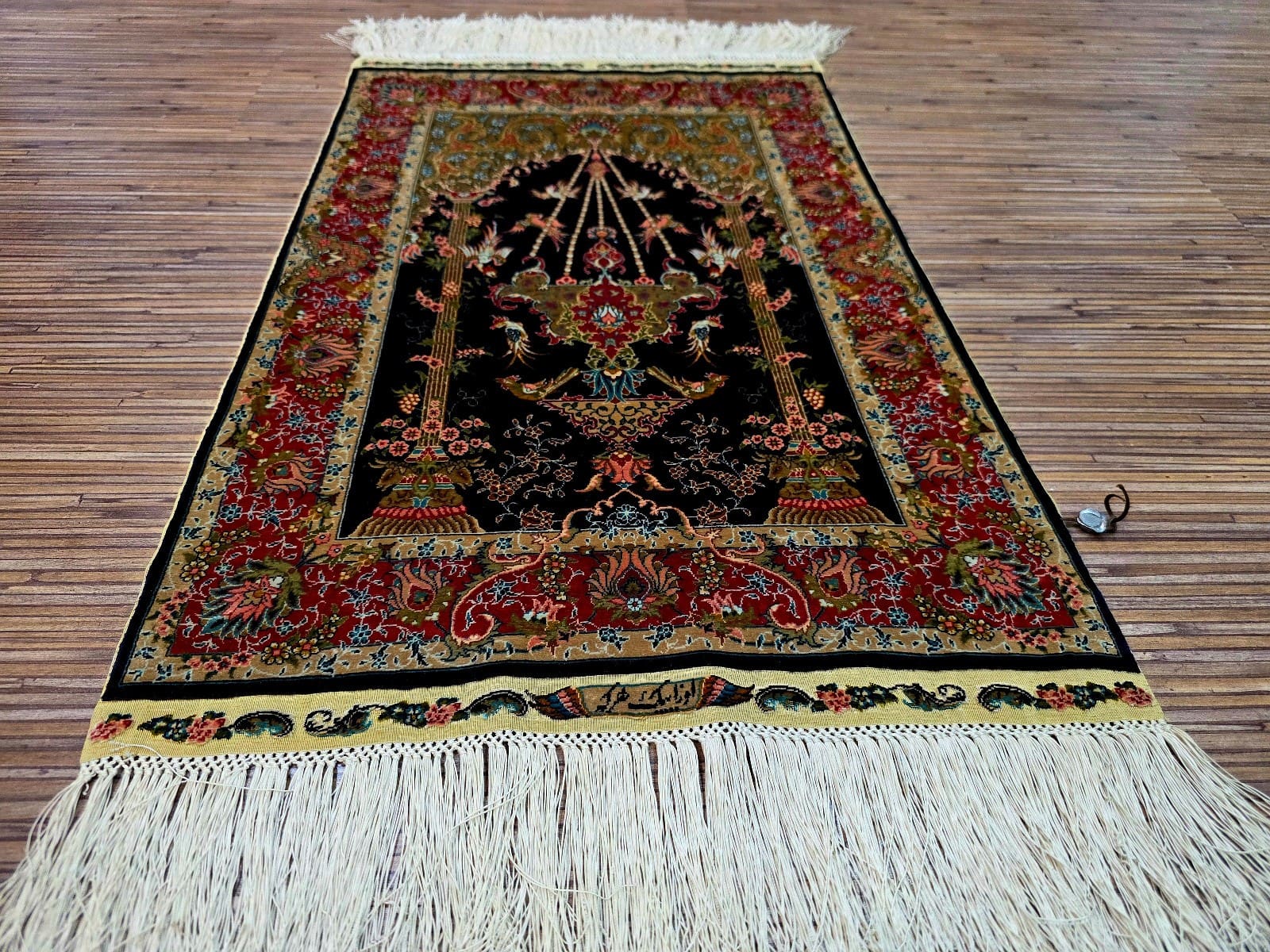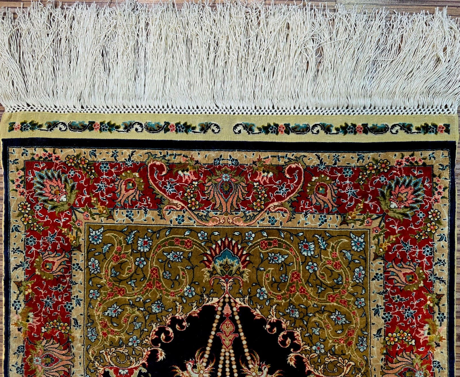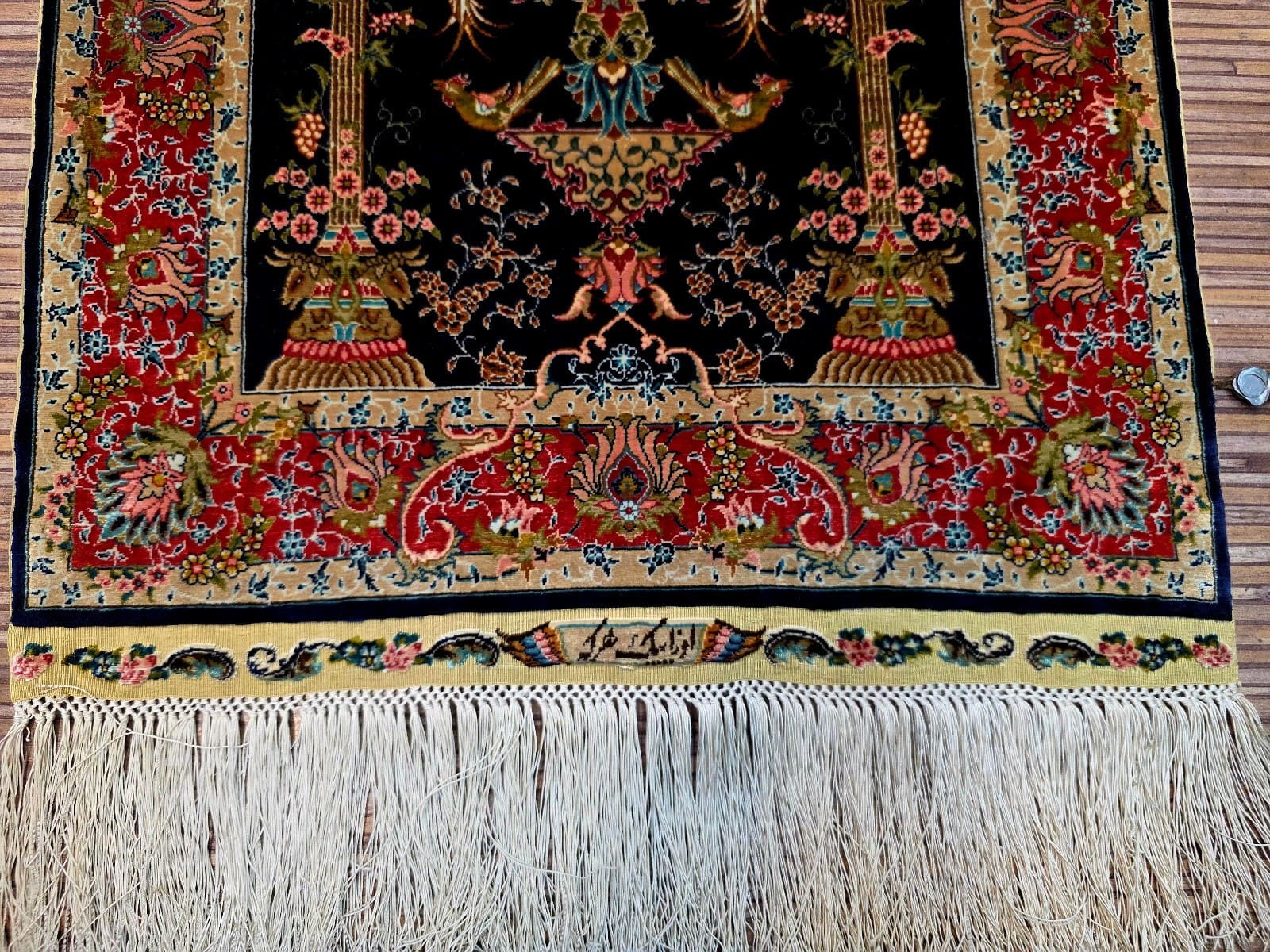 Dieser Teppich ist aus 100 % reiner Naturseide gefertigt, was ihm eine luxuriöse Textur und eine beeindruckende Farbbrillanz verleiht. Die Verarbeitung des Teppichs erfolgt handgeknüpft, was bedeutet, dass jeder Knoten von Hand erstellt wurde. Dies trägt nicht nur zur Einzigartigkeit jedes Teppichs bei, sondern auch zur Haltbarkeit und Langlebigkeit des Produkts. Der Teppich weist eine besonders hohe Feinheit mit einer Knotendichte von 2.250.000 Knoten/m² auf, was ihn zu einem der feinsten handgeknüpften Teppiche macht. Durch diese hohe Knotendichte erhält der Teppich eine detaillierte Musterung und eine außergewöhnliche Strapazierfähigkeit.