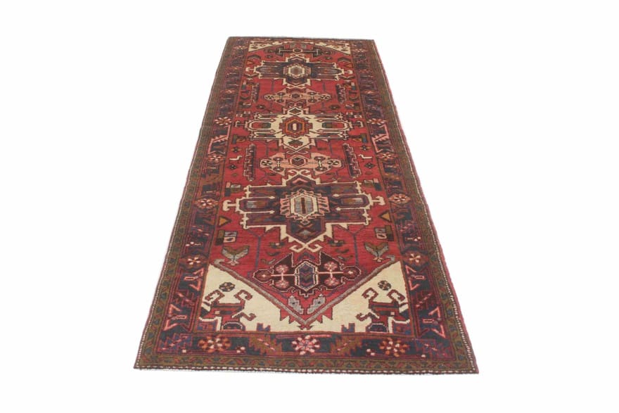 • Handgeknüpfter Heriz Teppich | Knotendichte: 160.000 – 200.000 Knoten/m² | Material: Wolle und Baumwolle | Größe: 331×109 cm | Farbe: Rot/Orange | Ursprung: Iran/Persien | Zustand: Neu