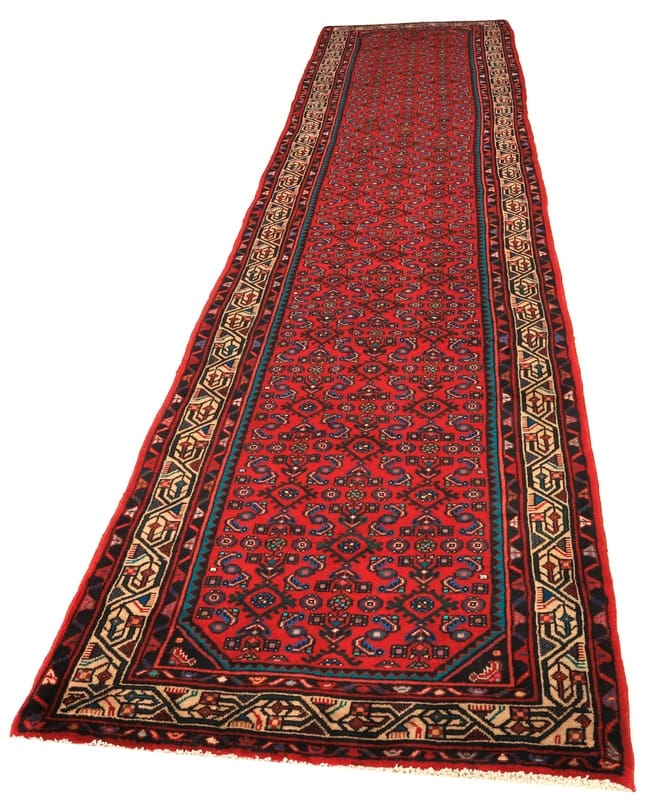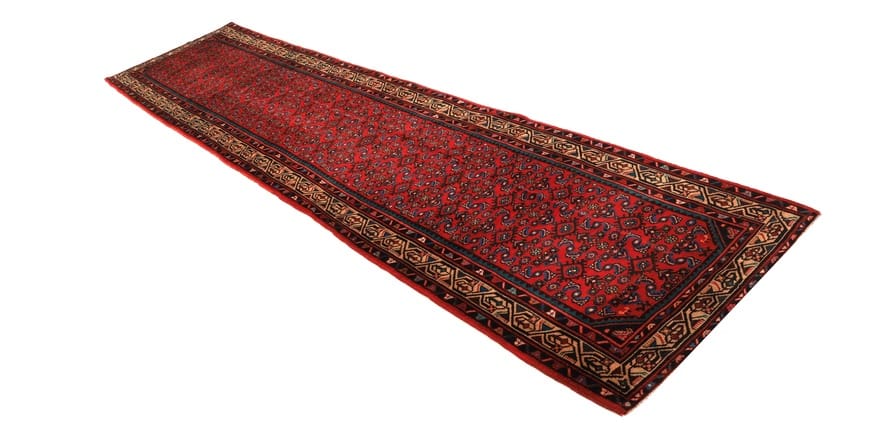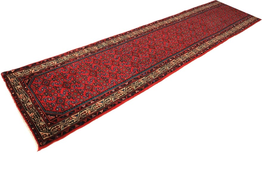 Handgeknüpfter Hodenabad Teppich | Knotendichte: 160.000 – 200.000 Knoten/m² | Material: Hochwertige Wolle auf Baumwollkette | Größe: 397×99 cm | Farben: Strahlendes Rot/Orange | Florhöhe: ca. 8 mm | Gewicht: ca. 12 kg | Herkunft: Handgefertigt in Persien (Iran) | Alter: Neuzeitlich (0-20 Jahre)