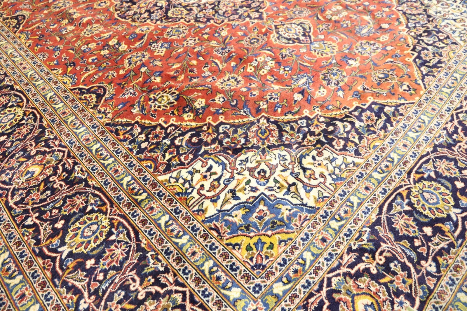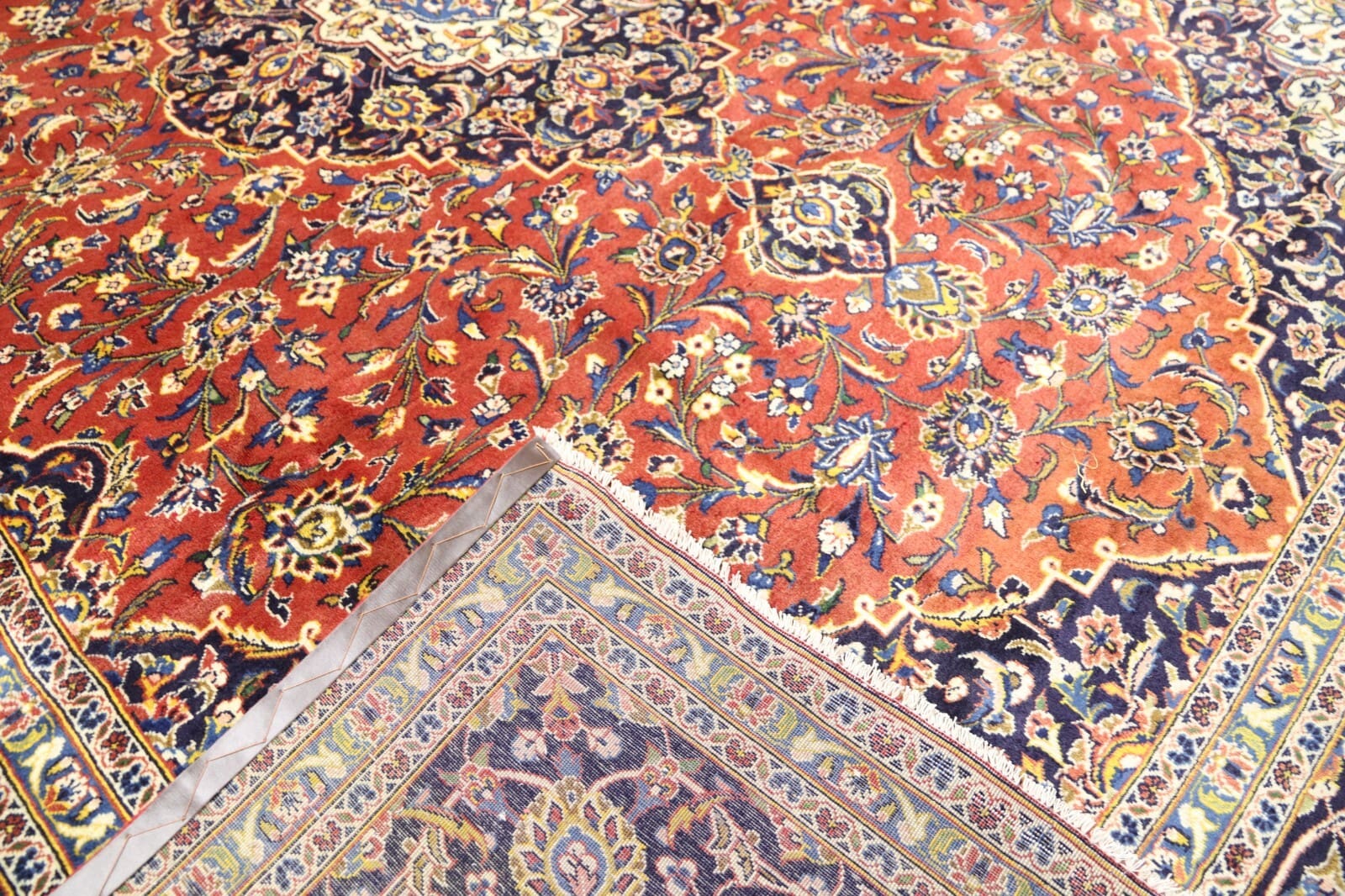 Wunderschöner Handgeknüpfter Orientteppich | Knotendichte: ca. 250.000 – 300.000 Knoten/m² | Material: 100% Schurwolle und 100% Baumwolle | Größe: 407 x 306 cm | Zustand: Sehr gut / Perfekt | Herkunft: Persien / Iran | Provenienz: Kashan | Stil: Traditionell Orientalisch / Persisch | Für Fußbodenheizung geeignet | Unikat / Einzelstück