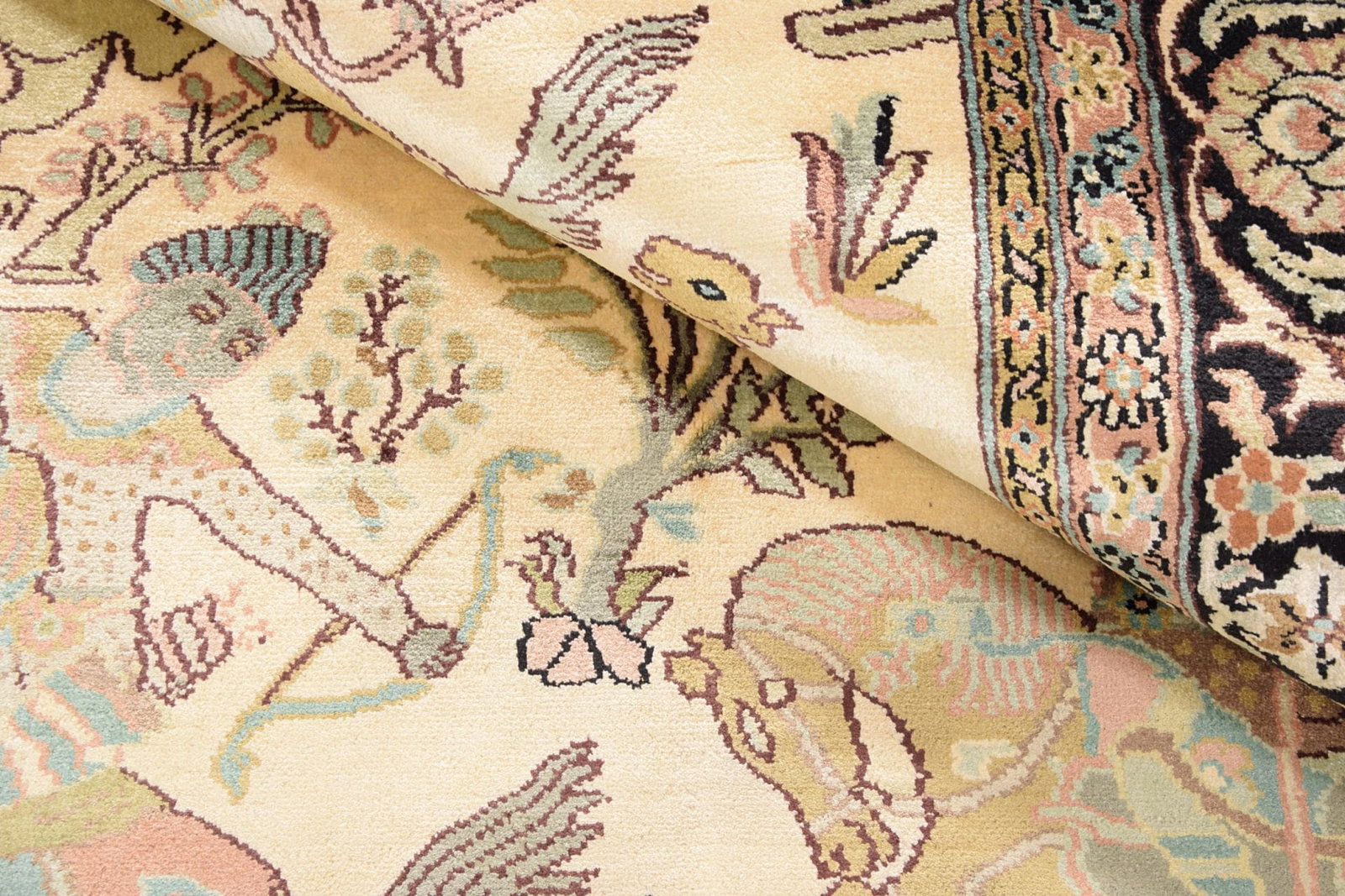 Hergestellt aus feiner Kashmirseide, strahlt dieser Teppich eine luxuriöse Eleganz aus. Die weiche und glänzende Textur der Seide sorgt nicht nur für eine angenehme Haptik, sondern verleiht dem Teppich auch einen einzigartigen Glanz, der das Licht auf besonders schöne Weise reflektiert. Jedes Stück wird liebevoll und im traditionellen Handknüpfverfahren gefertigt, was eine enorm hohe Knotendichte bewirkt. Diese Knotendichte garantiert nicht nur Langlebigkeit und Strapazierfähigkeit, sondern führt auch zu einem exquisiten Finish und einer unverwechselbaren Detailgenauigkeit der Muster.