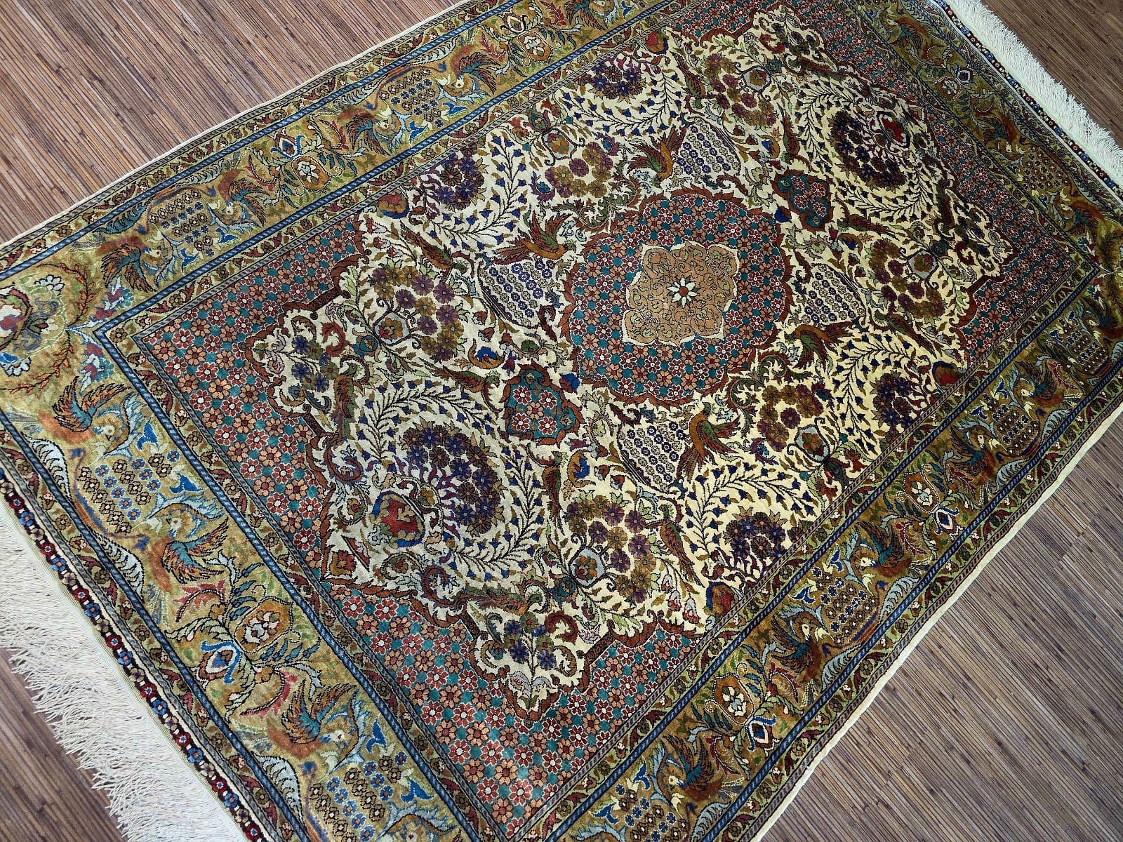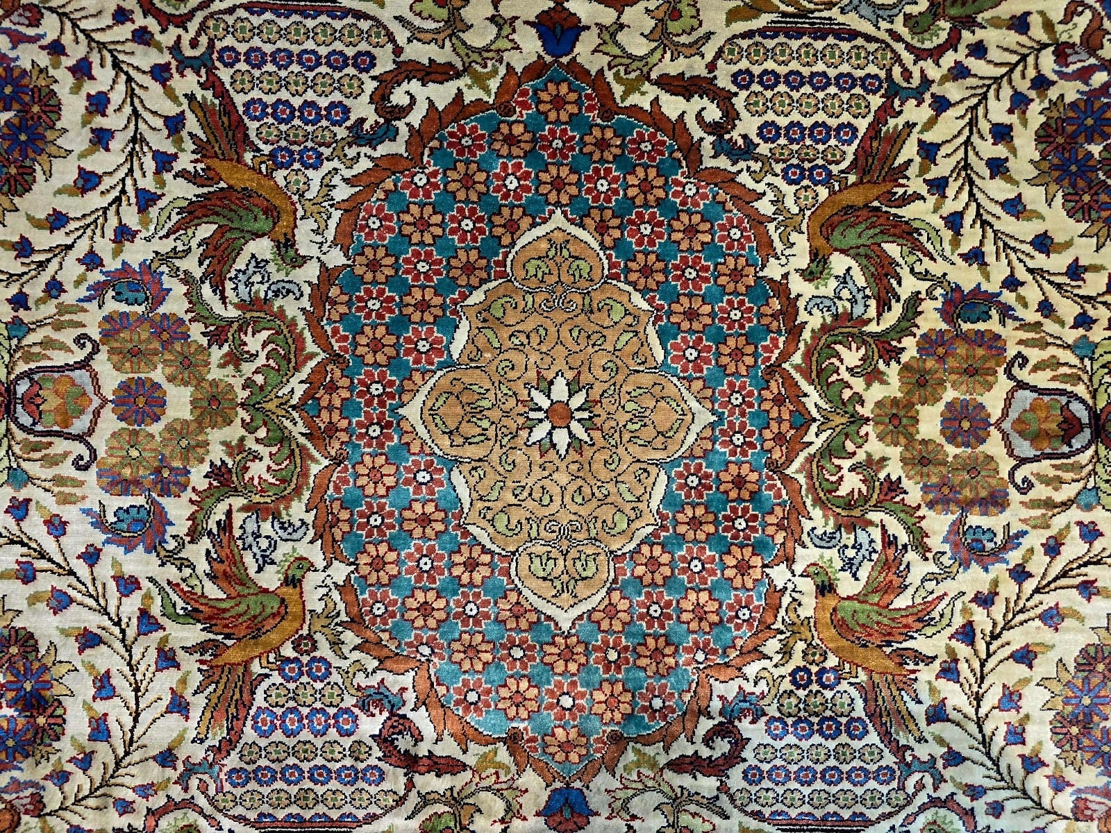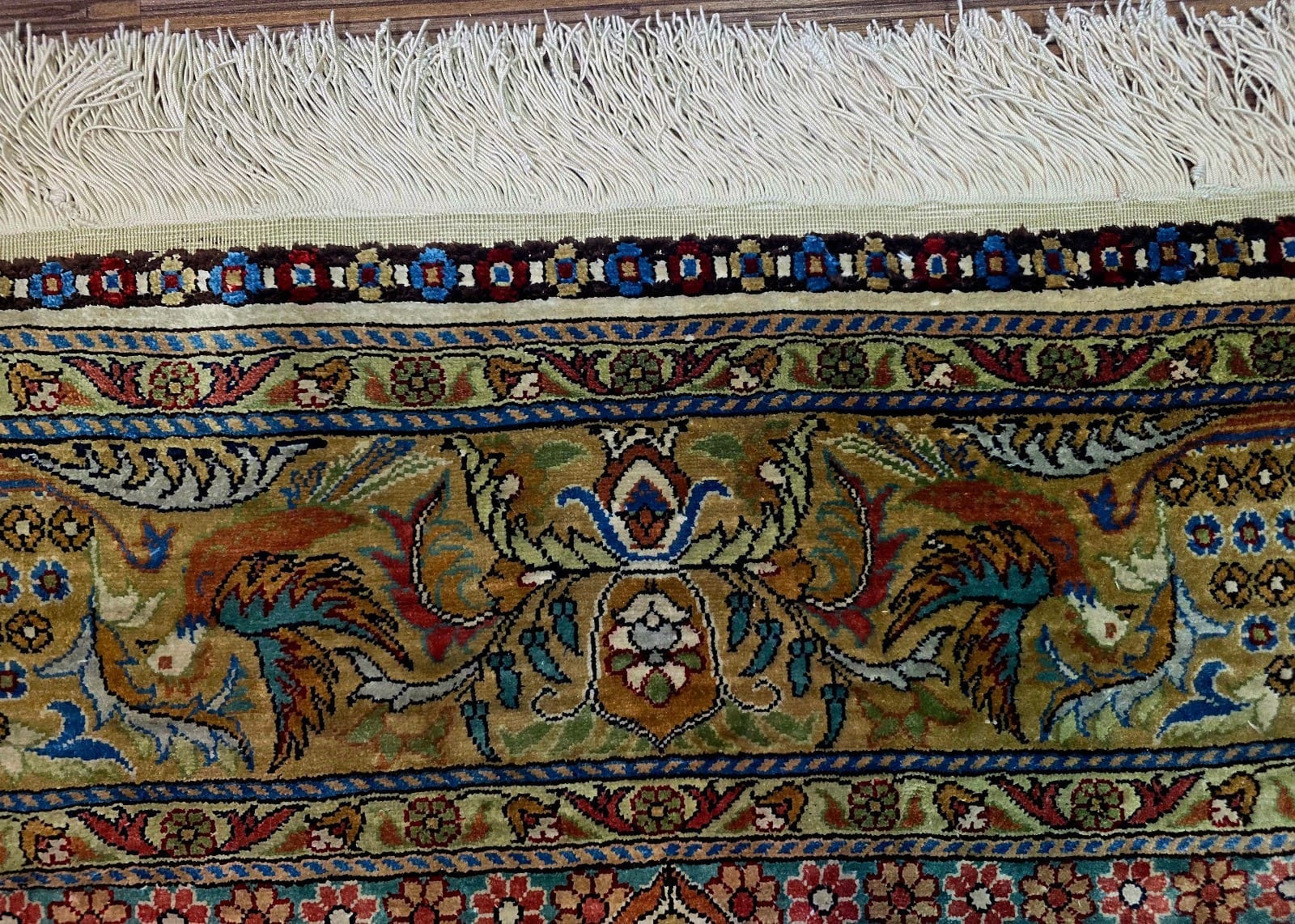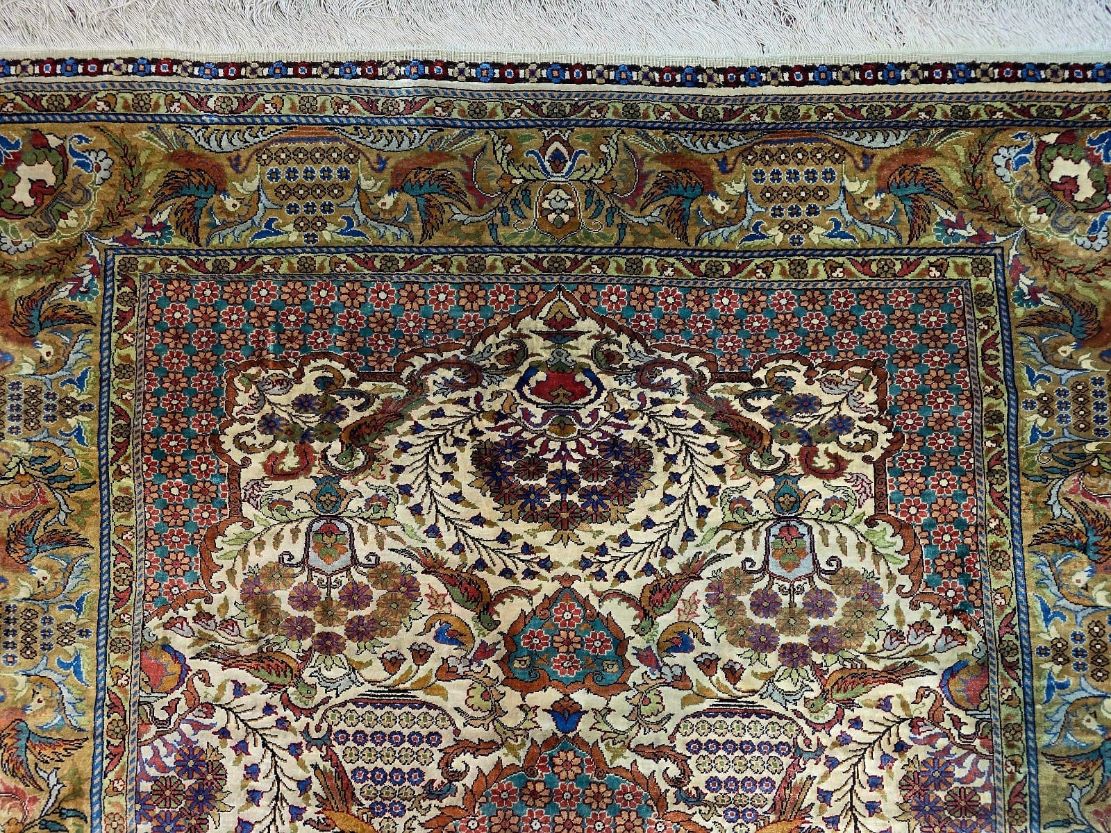Besonderheiten dieses Teppichs sind die handgeknüpfte Struktur, die aus einer hohen Knotendichte resultiert, sowie die Verwendung von reiner Seide, die ihm einen luxuriösen Glanz verleiht. Der Teppich befindet sich in einem sehr guten Zustand, was seine Langlebigkeit unterstreicht. Eine professionelle Reinigung wird empfohlen, um die Qualität und das Aussehen des Teppichs über Jahre hinweg zu erhalten.