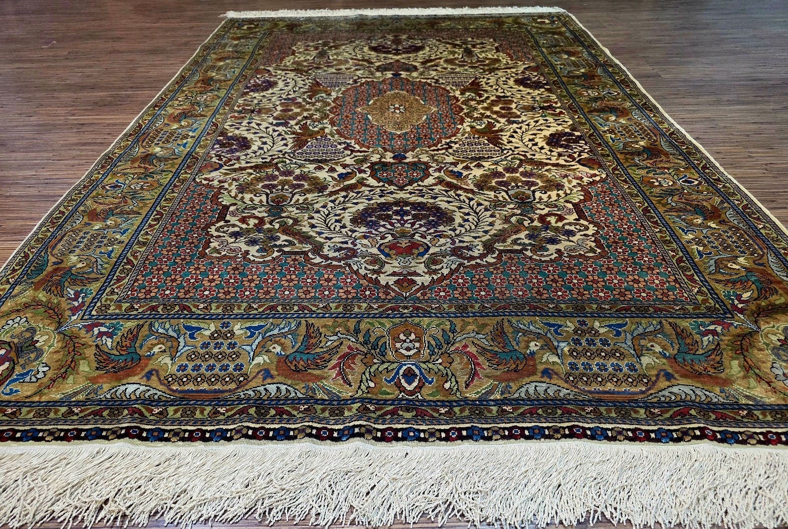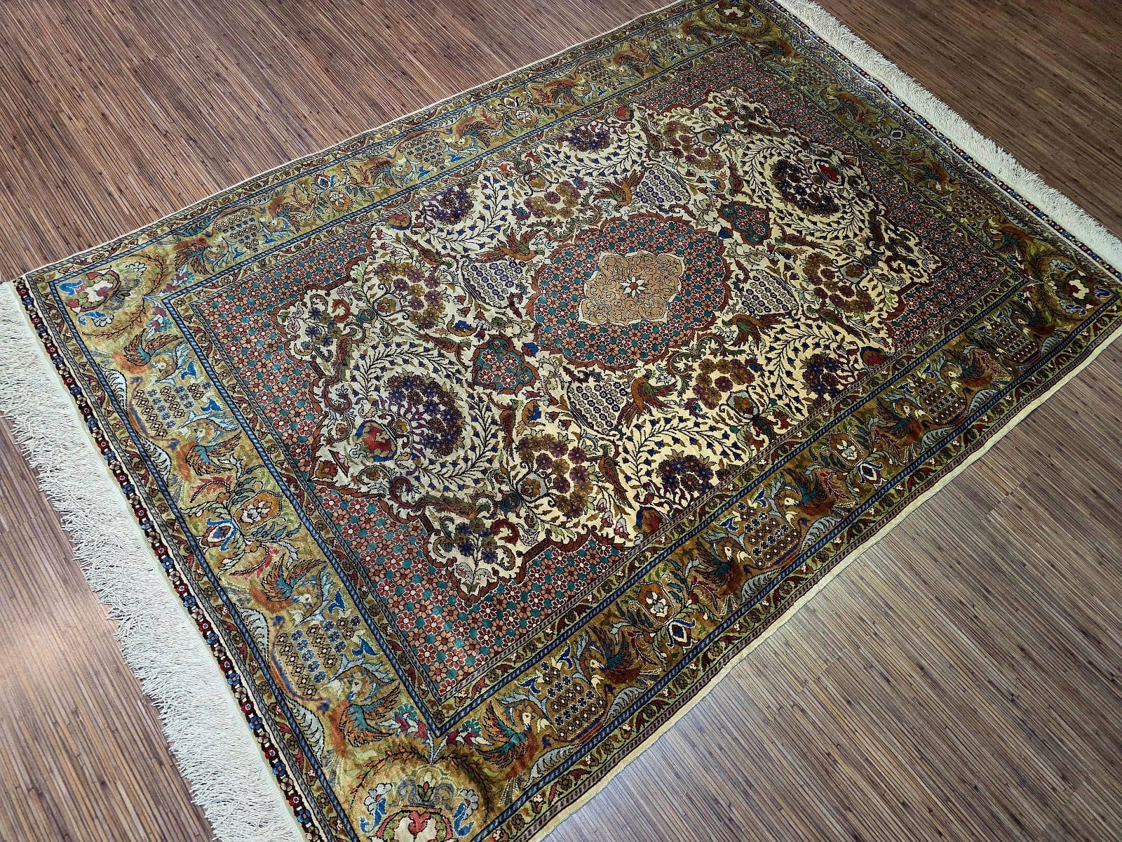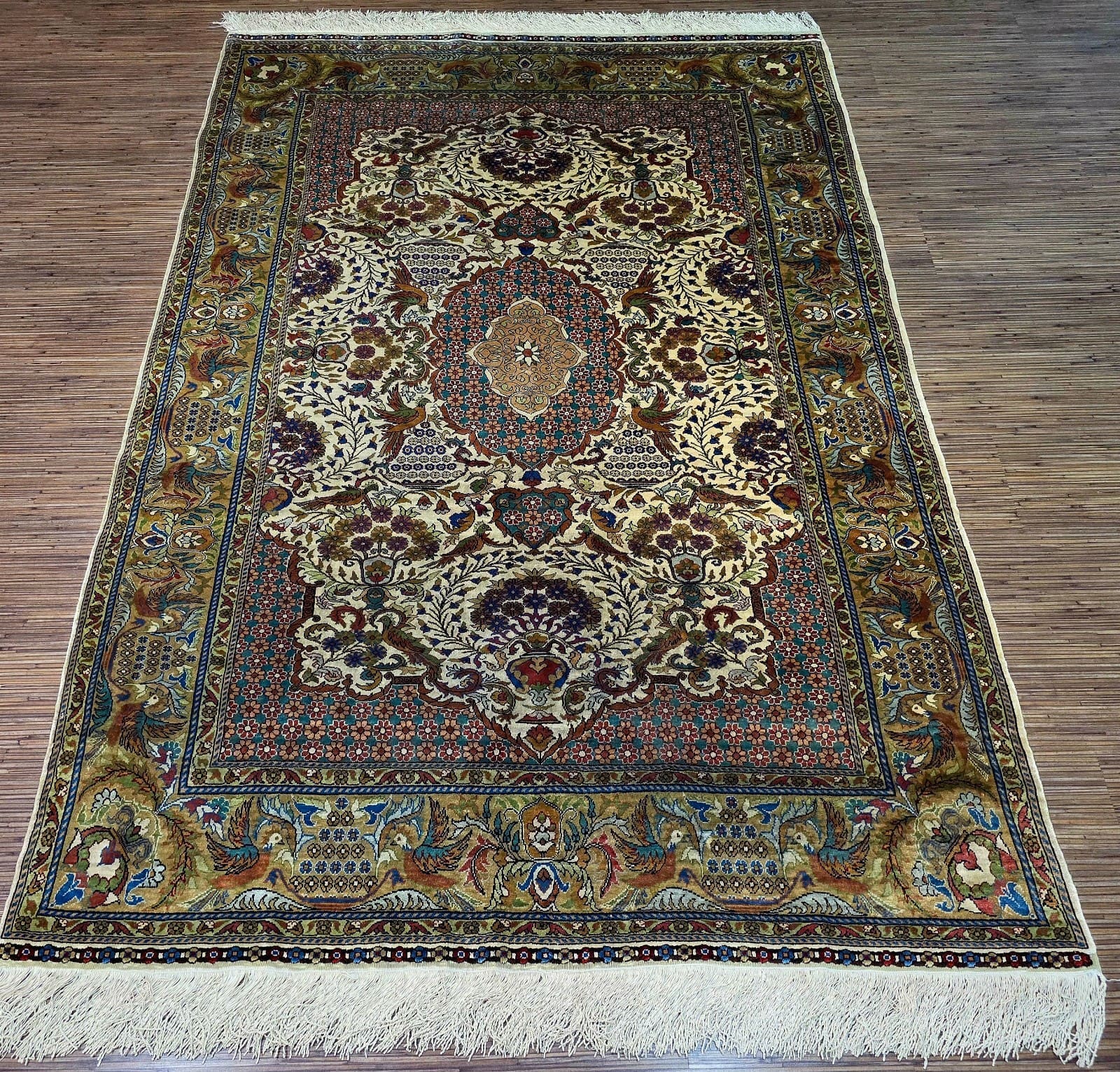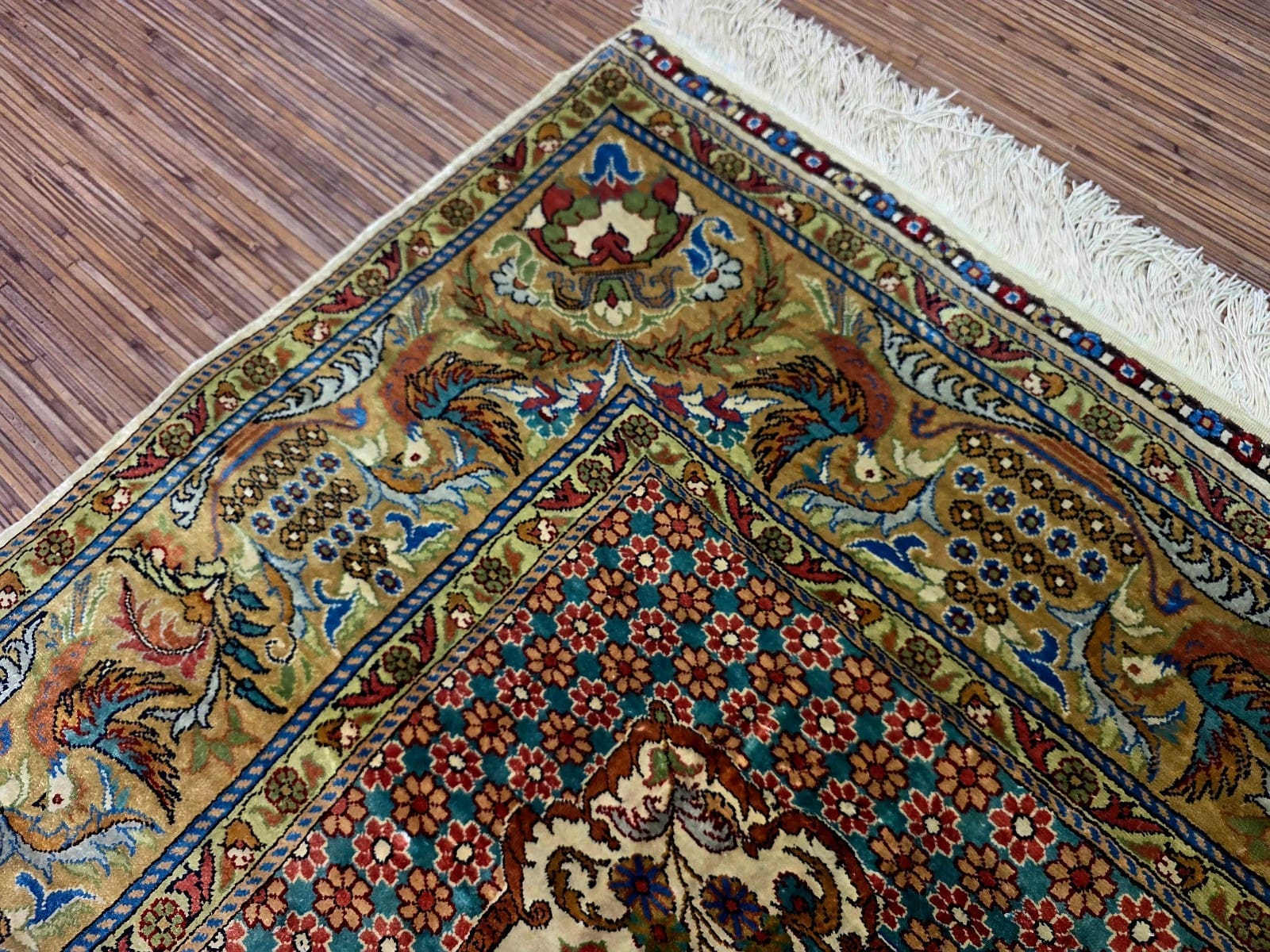 Besonderheiten dieses Teppichs sind die handgeknüpfte Struktur, die aus einer hohen Knotendichte resultiert, sowie die Verwendung von reiner Seide, die ihm einen luxuriösen Glanz verleiht. Der Teppich befindet sich in einem sehr guten Zustand, was seine Langlebigkeit unterstreicht. Eine professionelle Reinigung wird empfohlen, um die Qualität und das Aussehen des Teppichs über Jahre hinweg zu erhalten.