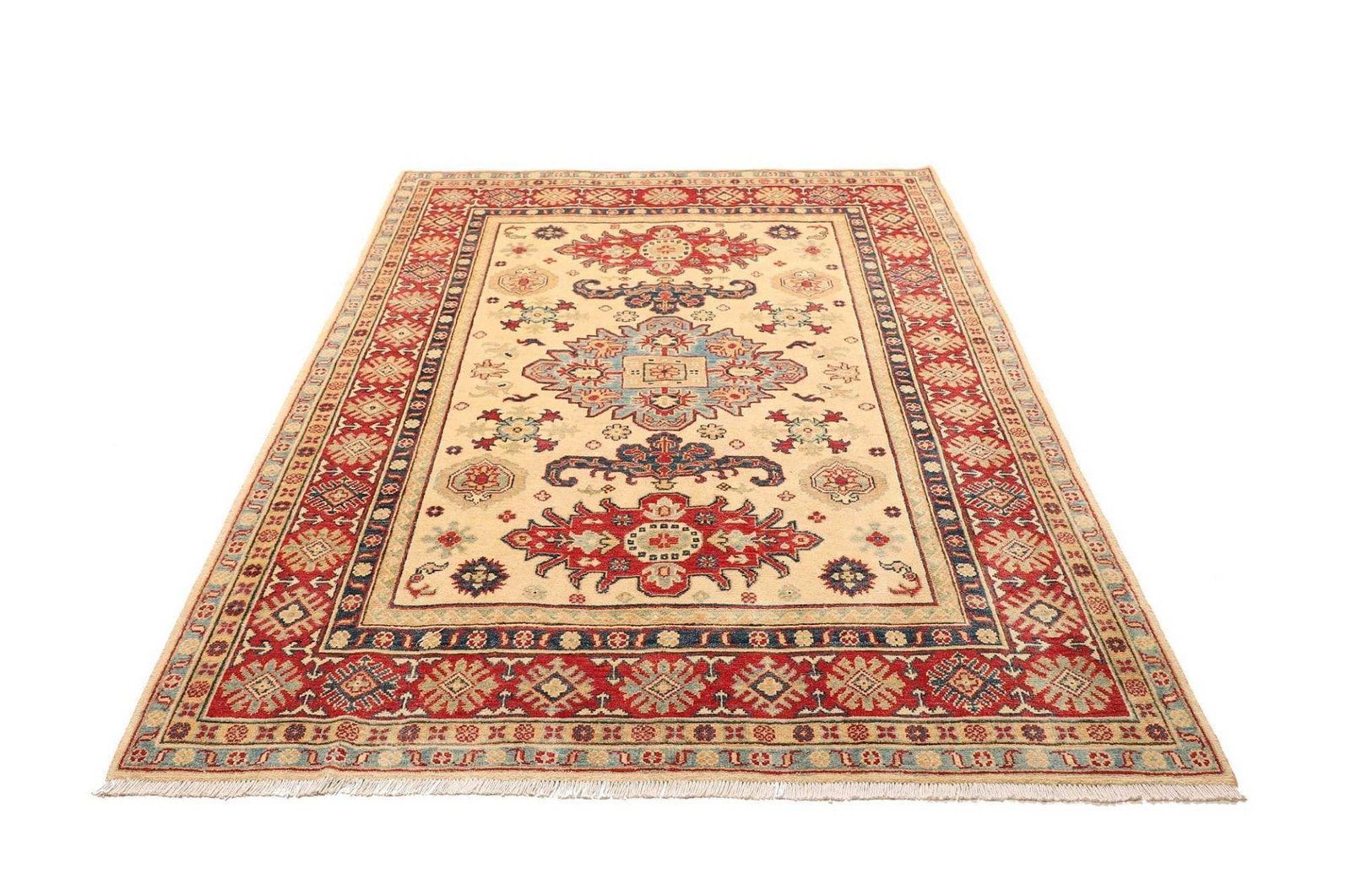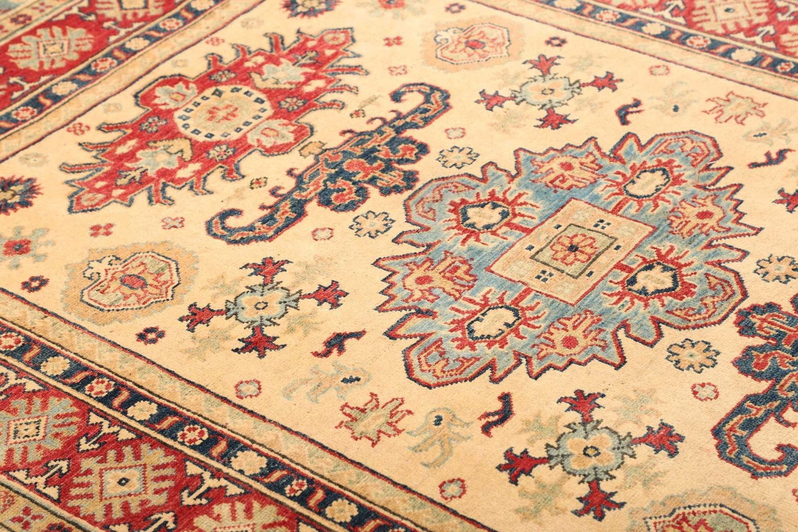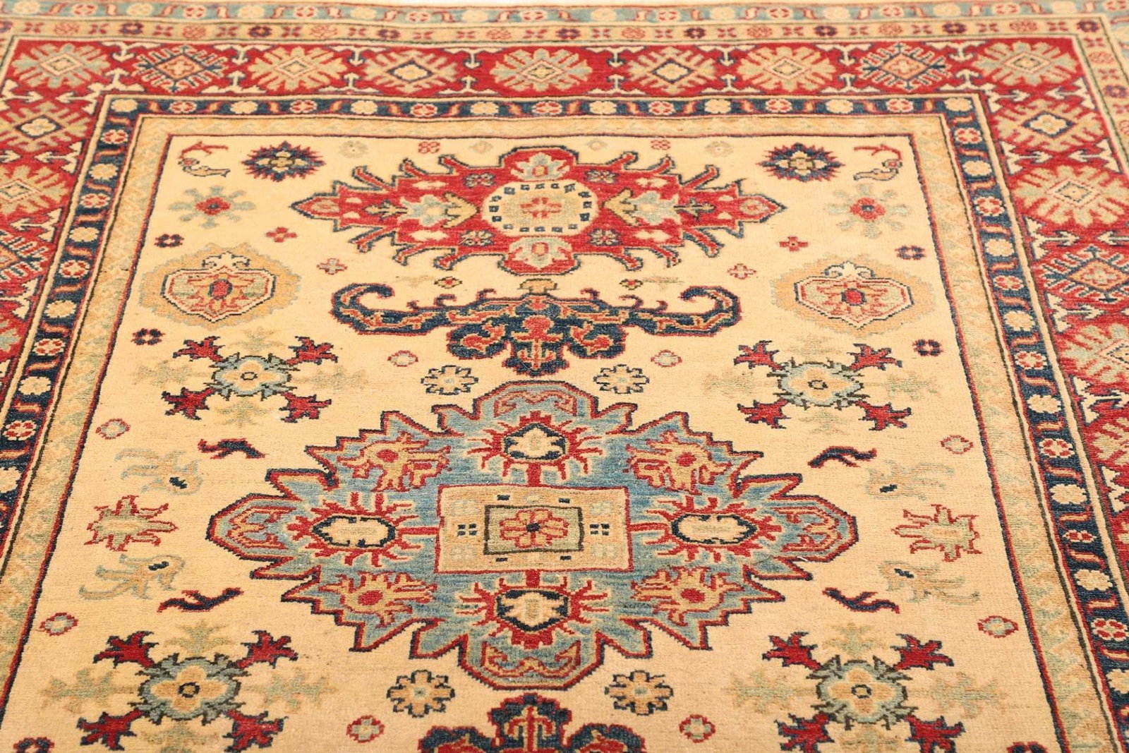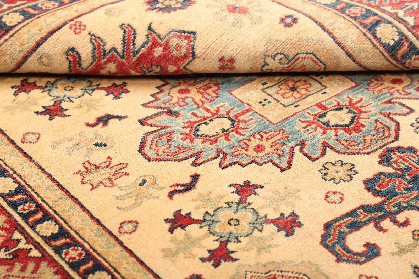 Ein weiterer Vorteil des Kazak-Teppichs ist seine Vielseitigkeit. Er eignet sich sowohl für Wohnräume als auch für Büros und andere Einrichtungen und kann sowohl als zentraler Blickfang als auch als harmonische Ergänzung zur bestehenden Einrichtung genutzt werden.