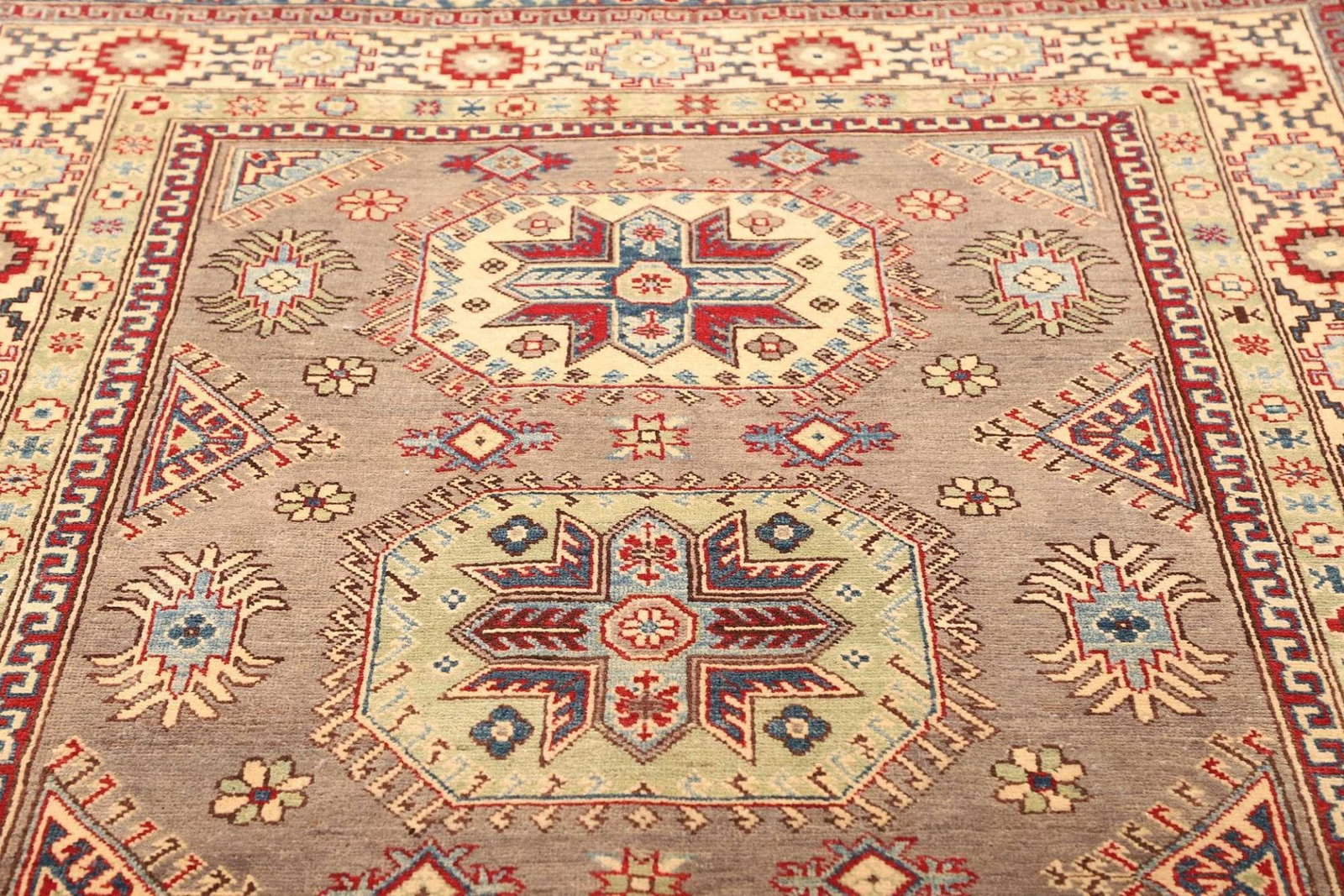 Mit seiner Kombination aus verspielten und strengen geometrischen Formen passt der Kazak-Teppich sowohl in klassische als auch in zeitgenössische Einrichtungsstile. Ob im Wohnzimmer, im Essbereich oder in einem Arbeitszimmer, dieser Teppich ist vielseitig und kann jedem Raum einen Hauch von Eleganz und Wärme verleihen.
