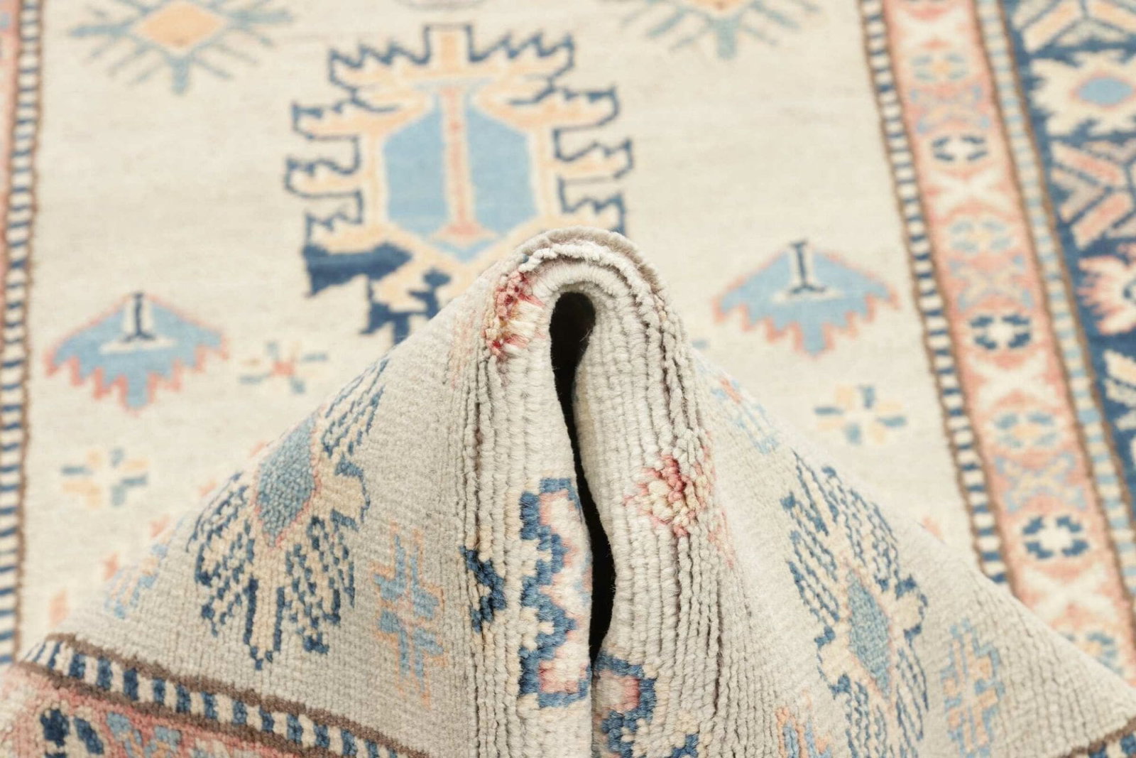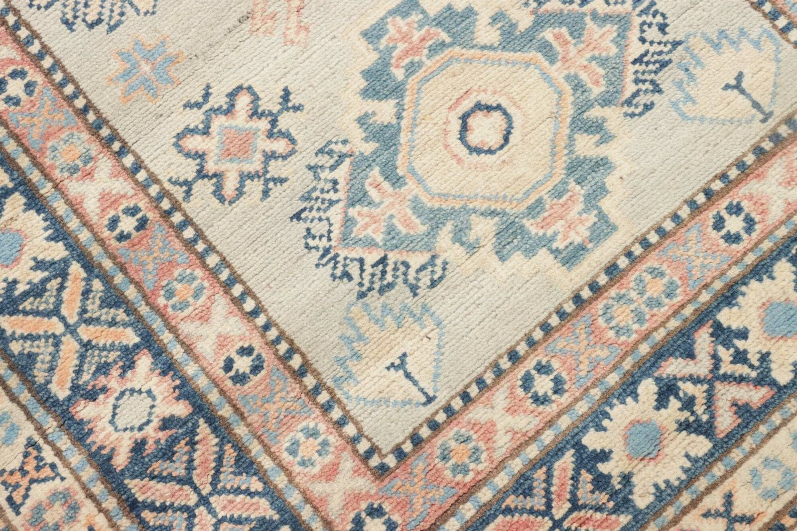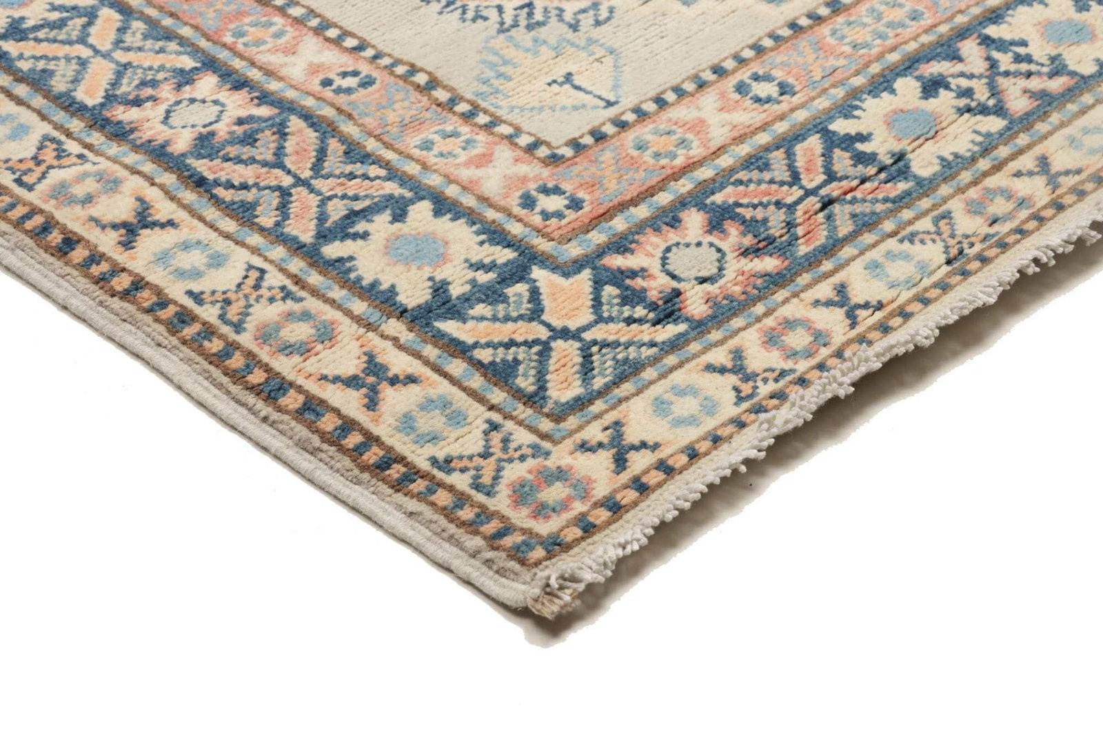 Der handgeknüpfte Kazak-Teppich ist vielseitig einsetzbar und eignet sich hervorragend für Wohnzimmer, Essbereiche, Der Eingangsbereich oder auch Büros. Seine robusten Materialien machen ihn ideal für stark frequentierte Bereiche.
