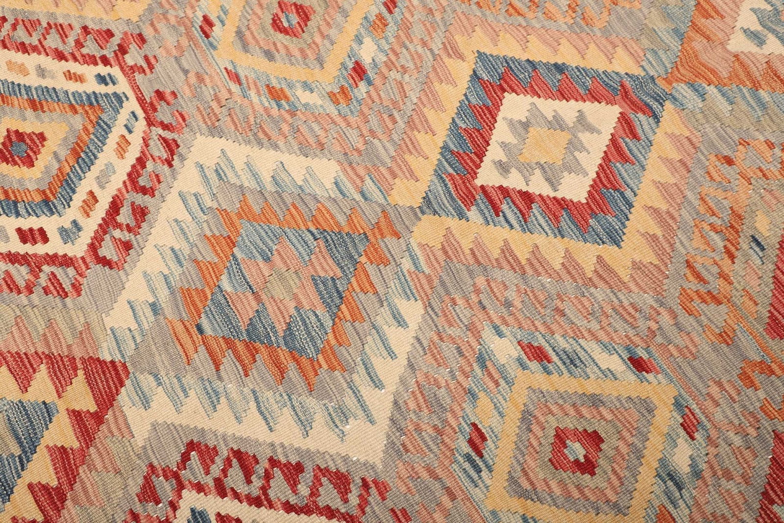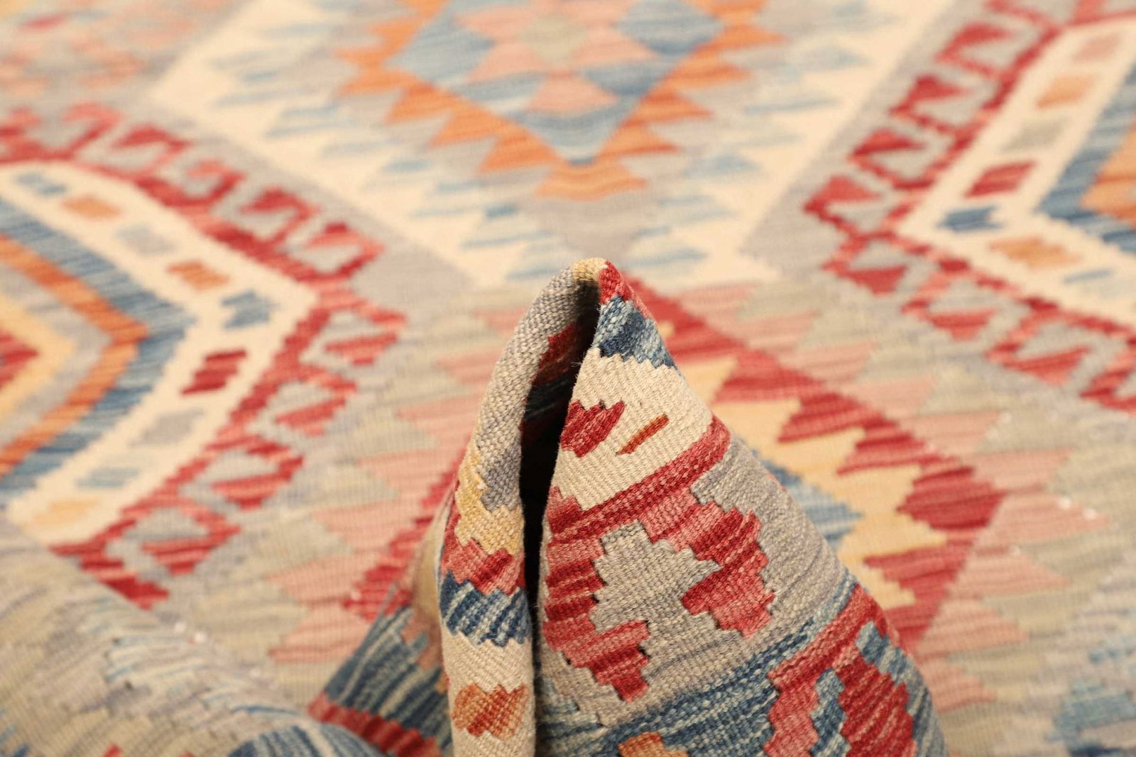 Ein Kelim ist in der Regel ein Flachgewebe, das sich durch seine einfarbigen sowie farbenfrohen Elemente auszeichnet. Die Farbpalette dieses Teppichs ist harmonisch aufeinander abgestimmt, wodurch er sich nahtlos in verschiedene Wohnstile einfängt, sei es modern, rustikal oder traditionell.