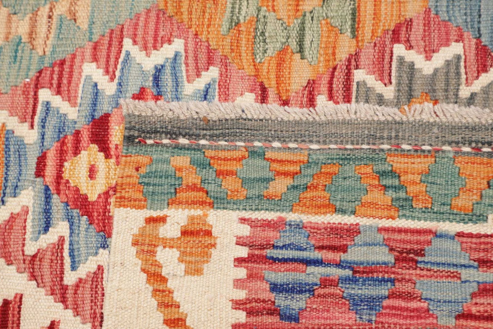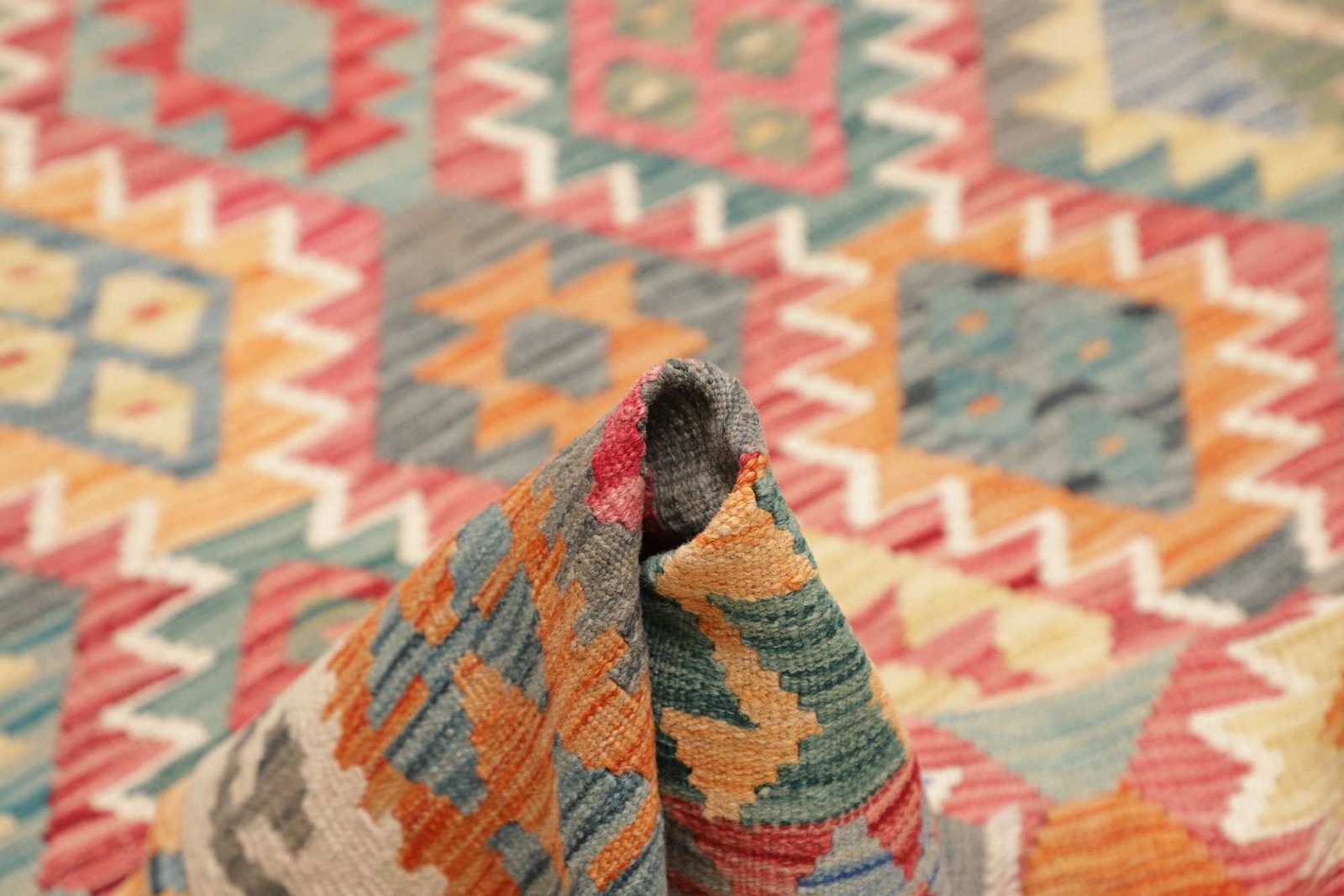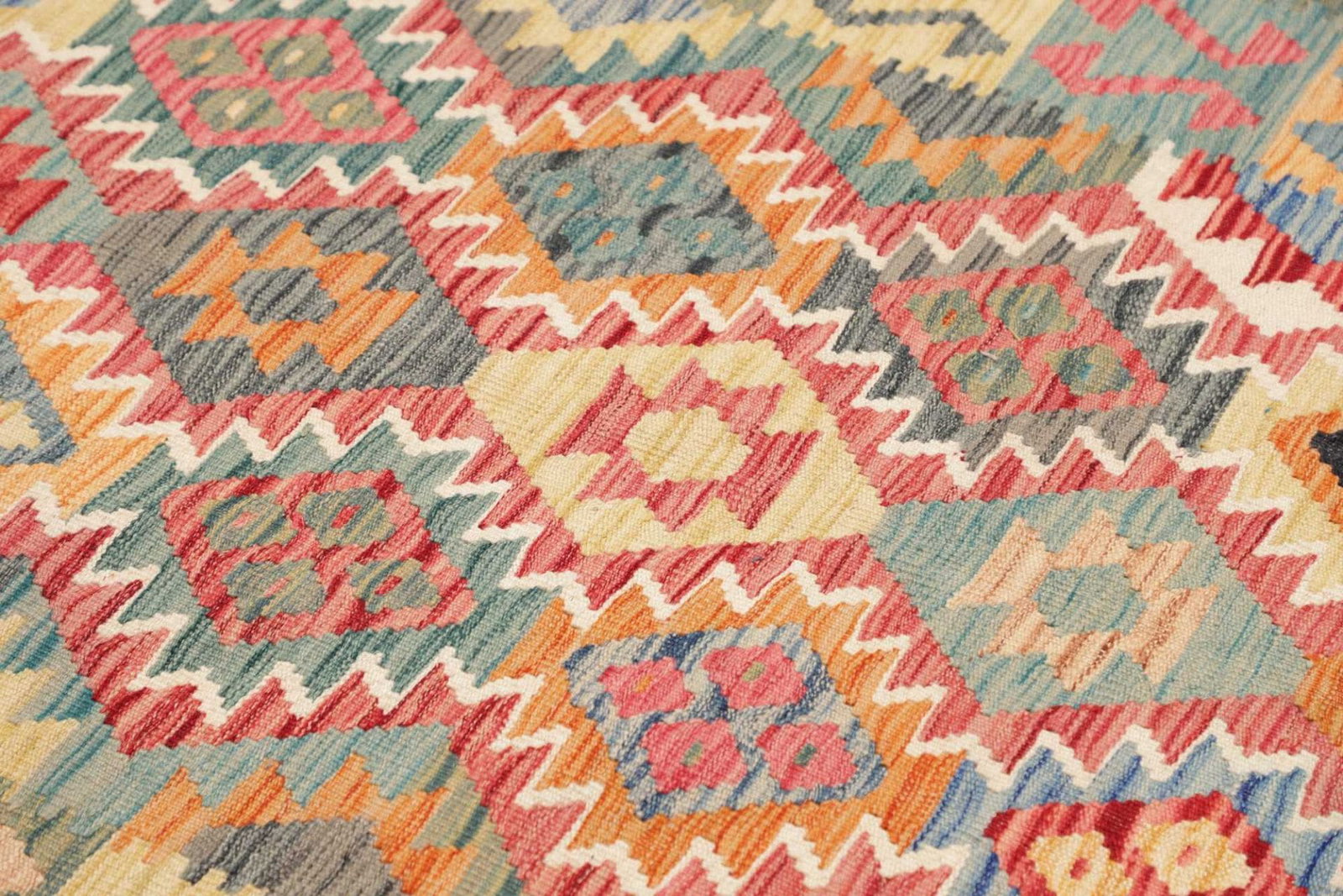 Der Teppich hat eine Knotendichte von etwa 200.000 Knoten pro Quadratmeter und eine Florhöhe von ca. 5 mm, was ihn sowohl strapazierfähig als auch angenehm im Gebrauch macht. Die Kombination aus Schurwolle und Baumwolle sorgt für ein angenehmes Gefühl und eine einfache Pflege. Kelims sind zudem oft beidseitig verwendbar, was ihre Einsatzmöglichkeiten erhöht und sie zu einer nachhaltigen Wahl für jede Wohnung macht.