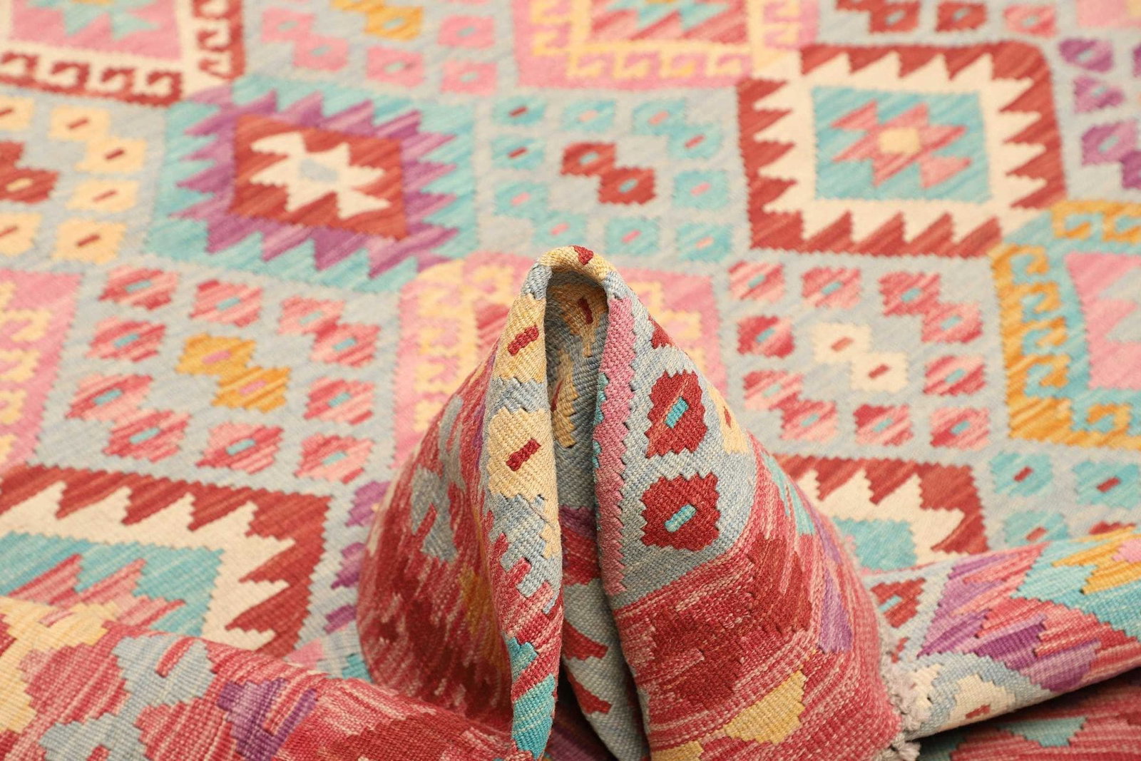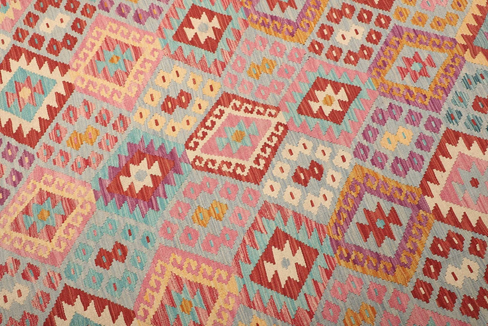 Dieser Kelim besticht durch seine farbenfrohen Muster und seine außergewöhnliche Knotendichte, die typisch für handgewebte Teppiche ist. Jedes Muster erzählt seine eigene Geschichte und zielt darauf ab, durch geometrische Formen und lebendige Farben eine einladende Atmosphäre zu schaffen. Ob im Wohn- oder Schlafzimmer, der Teppich verleiht jedem Raum einen Hauch von Exotik und Natürlichkeit. Er wird von Kunsthandwerkern gefertigt, die über jahrzehntelange Erfahrung in der Teppichweberei verfügen und traditionelles Wissen mit modernen Designs kombinieren.