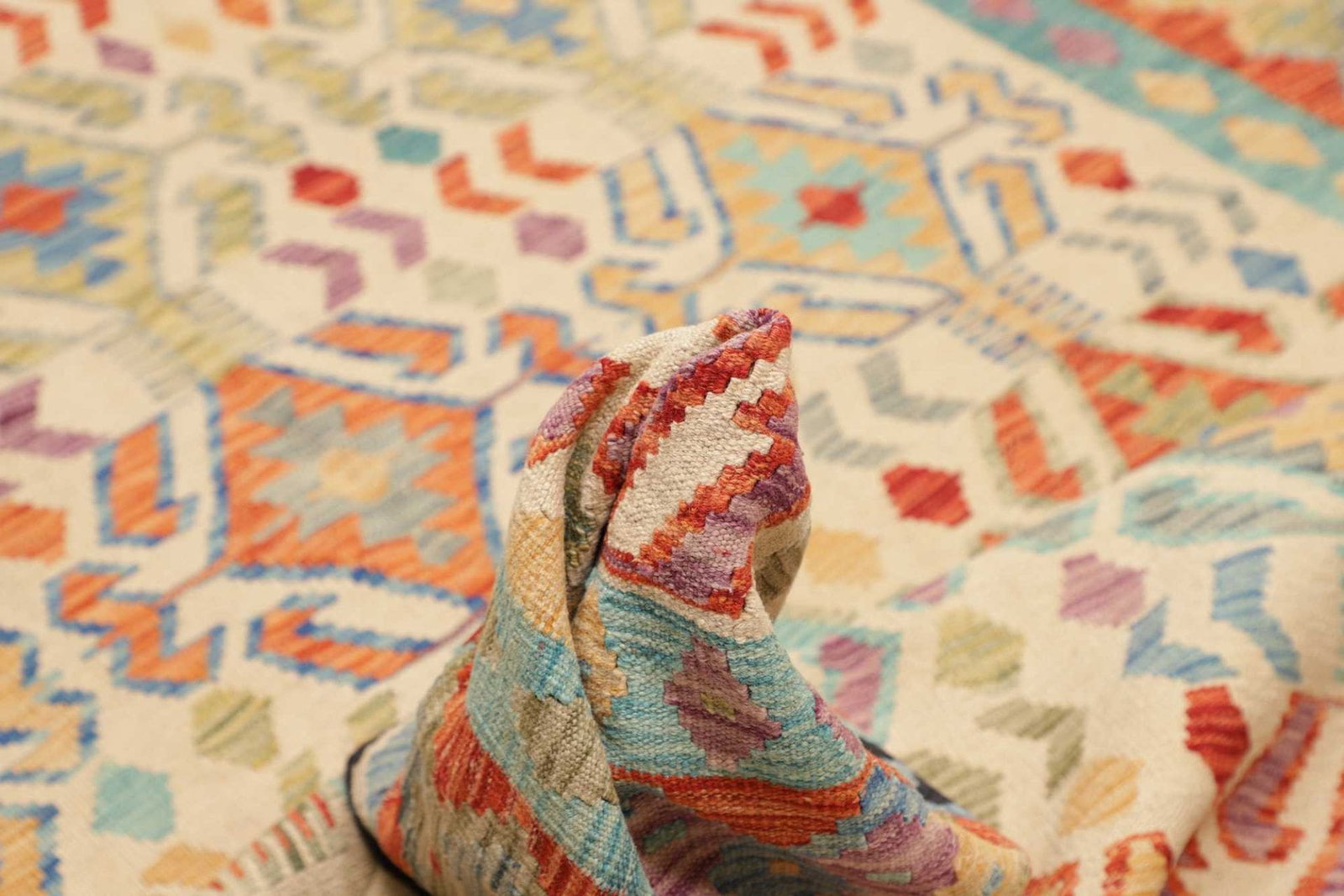 Dieser Kelim Teppich ist handgewebt und wird aus 100% Schurwolle für den Flor sowie 100% Baumwolle für die Kette gefertigt. Kelim Teppiche unterscheiden sich von klassischen Orientteppichen, da sie gewebt und nicht geknüpft werden. Sie weisen einen dünnen Flor von circa 5 mm auf, was ihnen ein rustikales Flair verleiht, das sich ideal in moderne Einrichtungsstile integrieren lässt. Die hohe Knotendichte von etwa 200.000 Knoten pro Quadratmeter sorgt für eine strapazierfähige und langlebige Qualität.