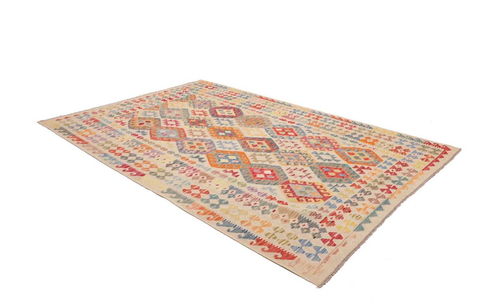 Der Kelim Teppich ist handgewebt und zeichnet sich durch seinen dünnen Flor aus 100% Schurwolle aus. Die Kette besteht ebenfalls aus 100% Baumwolle, was die Strapazierfähigkeit und Langlebigkeit des Teppichs gewährleistet. Im Gegensatz zu klassischen Orientteppichen, die geknüpft werden, sind Kelims gewebt, was ihnen eine flachere Struktur verleiht. Diese Teppiche werden seit Jahrhunderten in verschiedenen Regionen des Orients, wie der Türkei, dem Iran, Afghanistan und Nordafrika, hergestellt und finden neben ihrer Funktion als Bodenbelag auch Verwendung als Vorhänge, Kissen und Wandschmuck.