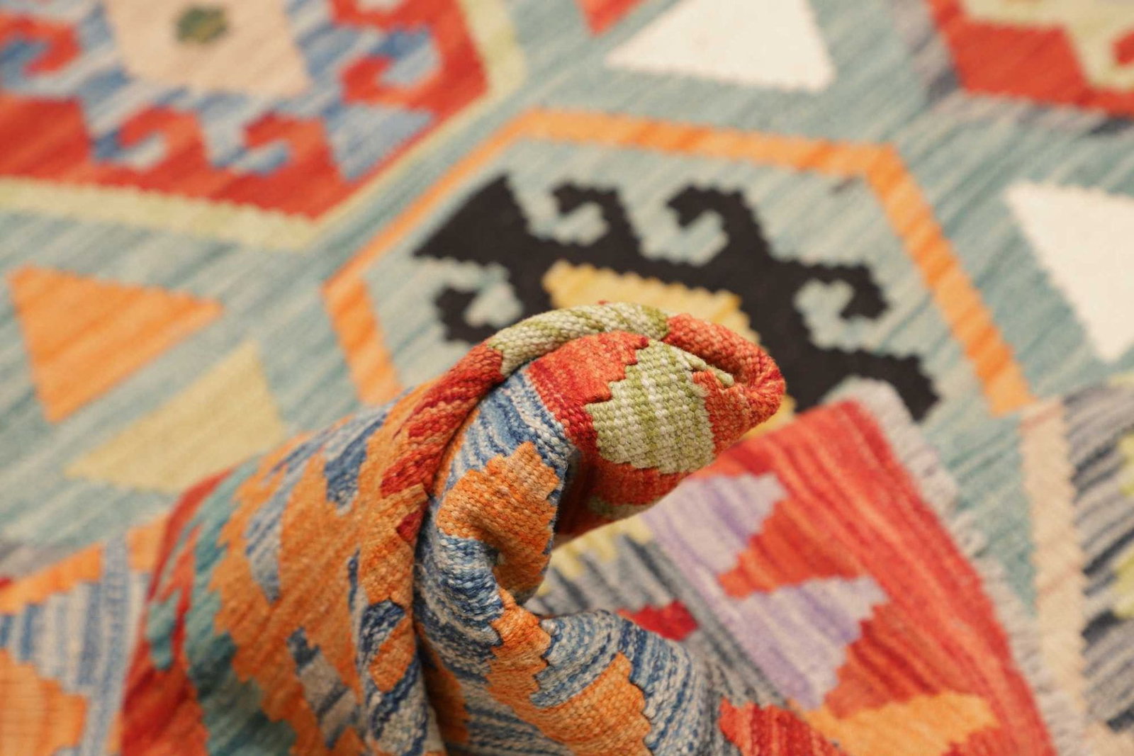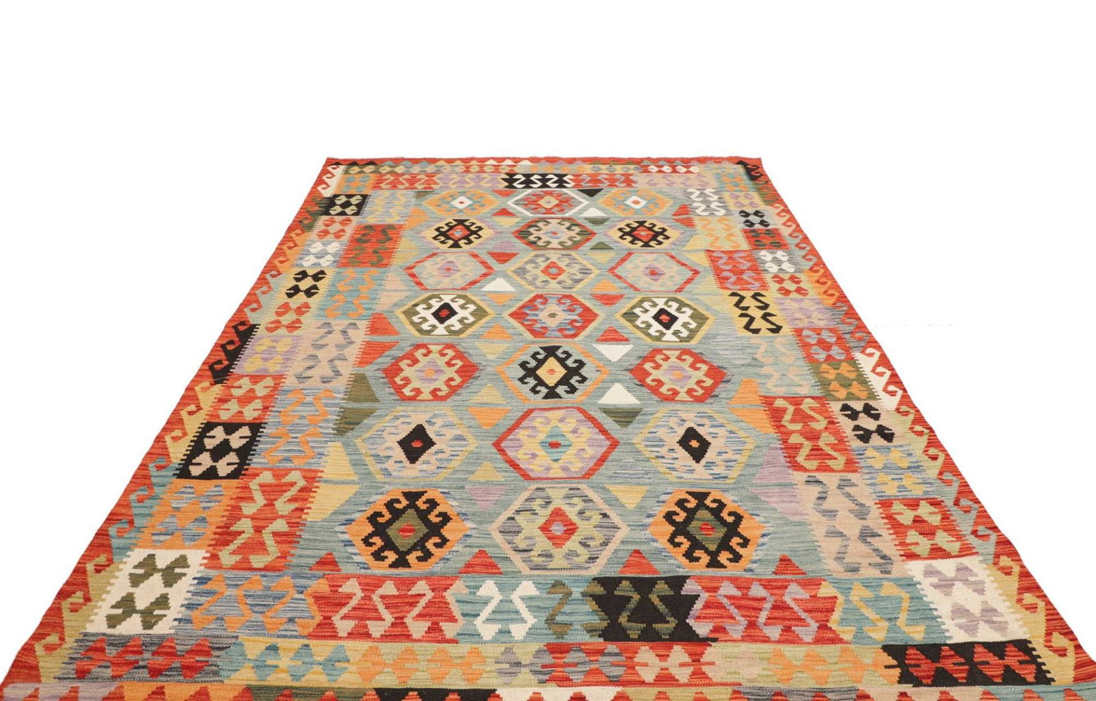 Die handgewebte Qualität und die Verwendung von hochwertigen Materialien wie Schurwolle und Baumwolle machen diesen Kelim besonders langlebig und pflegeleicht. Die hohe Knotendichte von ca. 200.000 Knoten pro Quadratmeter sorgt für eine feine Textur und Detailtiefe. Kelims sind nicht nur als Bodenbelag geschätzt, sondern finden auch Verwendung als Wanddekoration, Vorhänge oder Kissenbezüge, was ihre Vielseitigkeit unterstreicht. Die beidseitige Verwendbarkeit vieler Kelims erhöht ihren praktischen Nutzen und macht sie zu einer geschätzten Wahl für verschiedene Wohnstile.