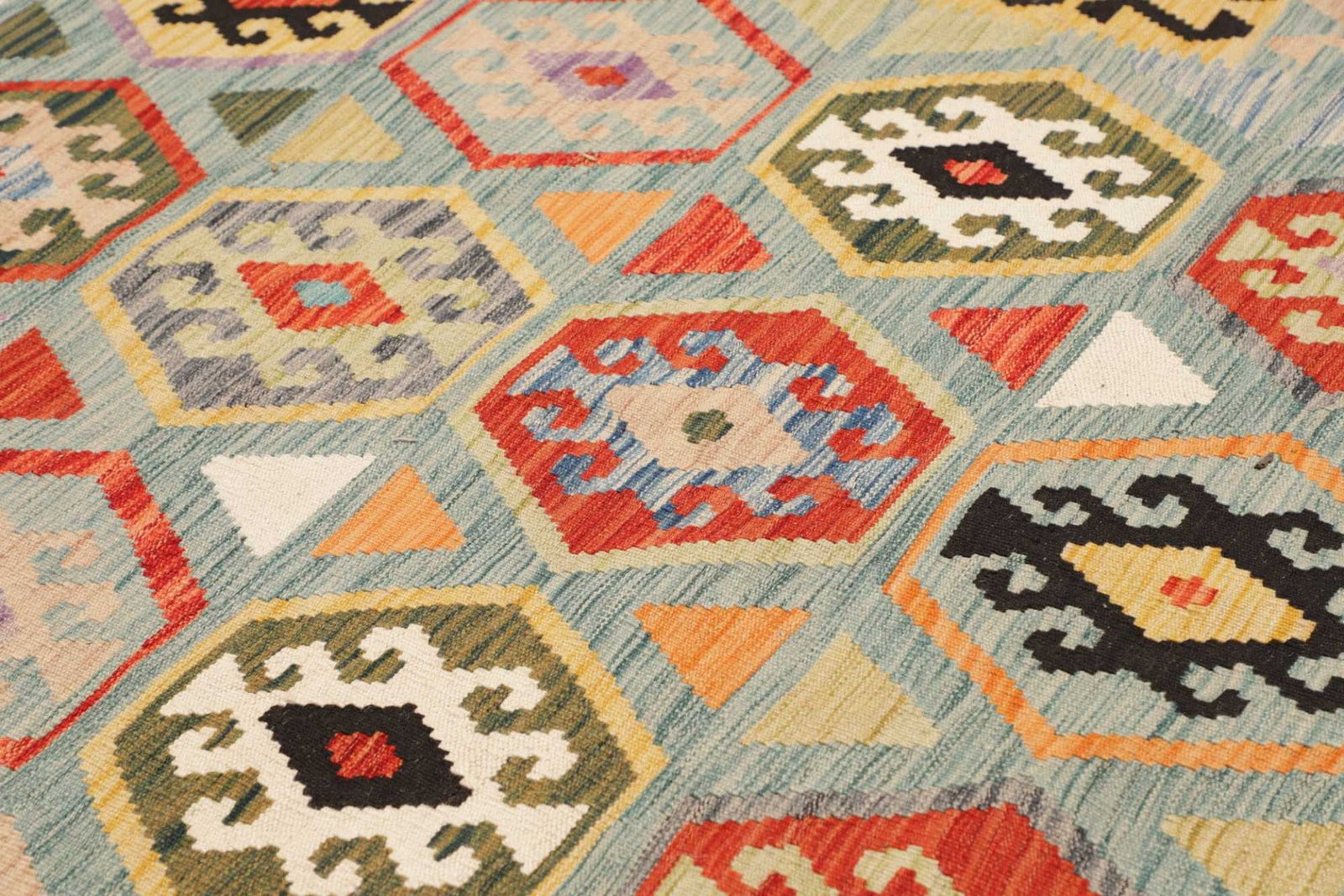 Dieser Kelim stammt aus Pakistan, einem Land, das für seine hohe Knüpfqualität und die reichhaltige Teppichtradition bekannt ist. Pakistanische Teppiche zeichnen sich durch eine hohe Knotendichte und eine flache Florhöhe aus. Die Teppiche aus dieser Region integrieren oft kulturelle Einflüsse aus den benachbarten Ländern und reflektieren die Vielfalt der Handwerkskunst. Die Teppichproduktion in Pakistan hat eine lange Geschichte und ist eng mit der regionalen Kultur und Tradition verbunden, was sich in den verwendeten Mustern und Farben widerspiegelt.