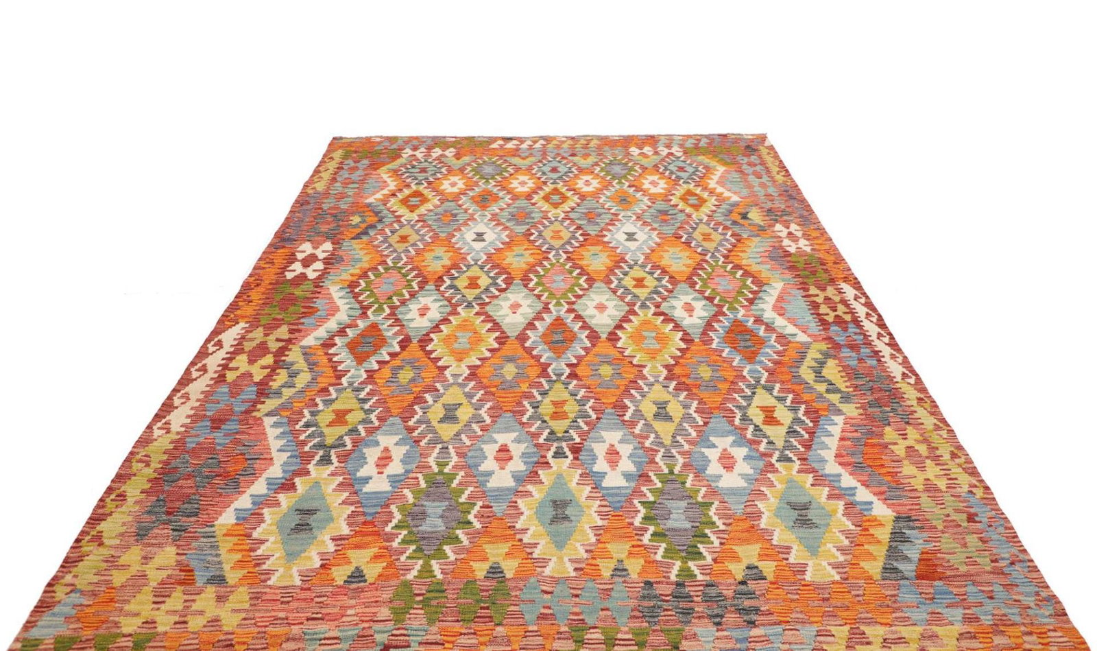 1050$Ursprünglicher Preis war: 1050$932$Aktueller Preis ist: 932$Handgewebter Kelim | Knotendichte: ca. 200.000 / m² | Material: Flor: 100% Schurwolle, Kette: 100% Baumwolle | Größe: 211 x 303 cm | Herkunft: Pakistan