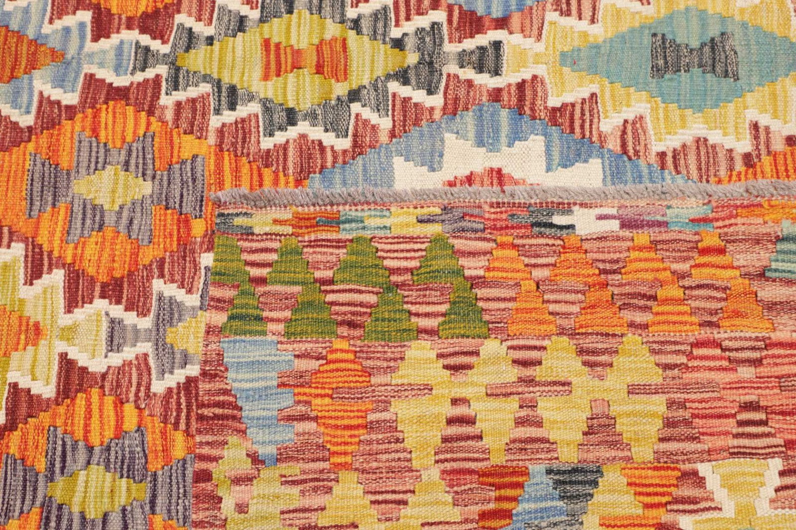 Die Verarbeitung dieses Kelims zeichnet sich durch eine hohe Qualität aus, mit einer Knotenzahl von etwa 200.000 pro Quadratmeter. Die Höhe des Flors beträgt ca. 5 mm, was den Teppich strapazierfähig und gleichzeitig angenehm weich macht. Diese Eigenschaften machen ihn ideal für stark frequentierte Räume. Kelims sind zudem oft beidseitig verwendbar, was ihre Funktionalität erhöht.