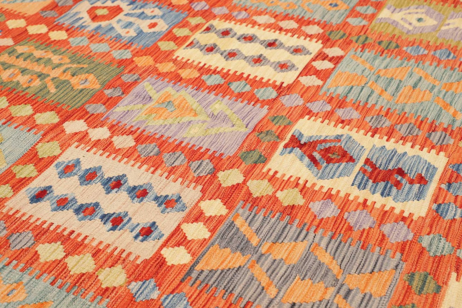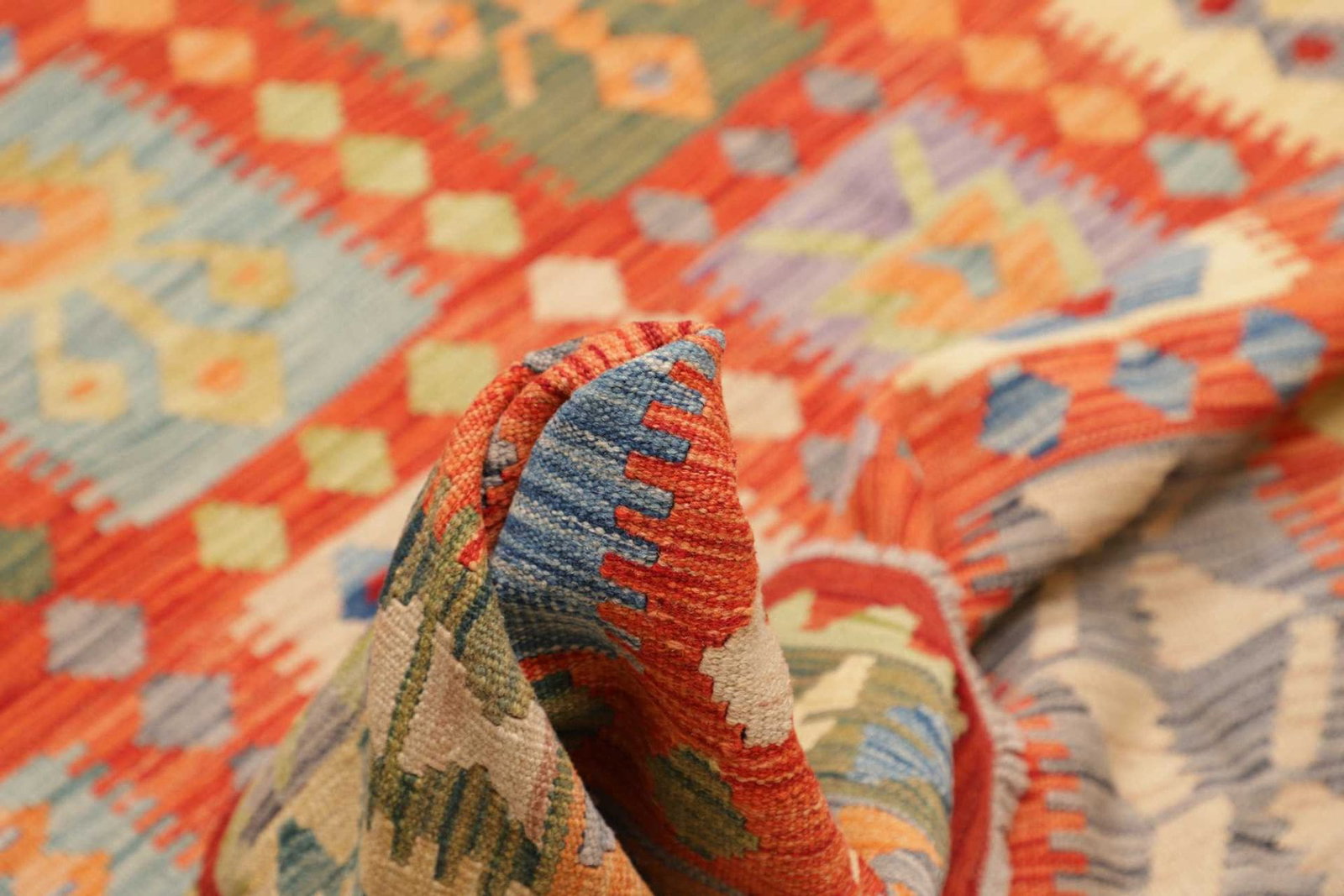 Die Handgewebte Qualität und die Verwendung von hochwertigen Materialien wie Schurwolle und Baumwolle sind charakteristisch für diesen Teppich. Die Verarbeitung als Kelim ermöglicht eine flache Struktur, die sich ideal für den Einsatz in modernen Wohnräumen eignet. Besonderheiten wie die hohe Knotendichte und die exzellente Verarbeitung machen diesen Teppich zu einem langlebigen und wertvollen Bestandteil Ihrer Einrichtung.