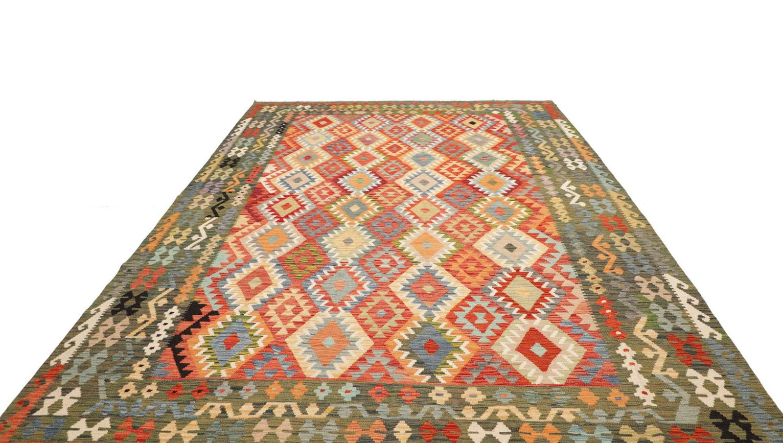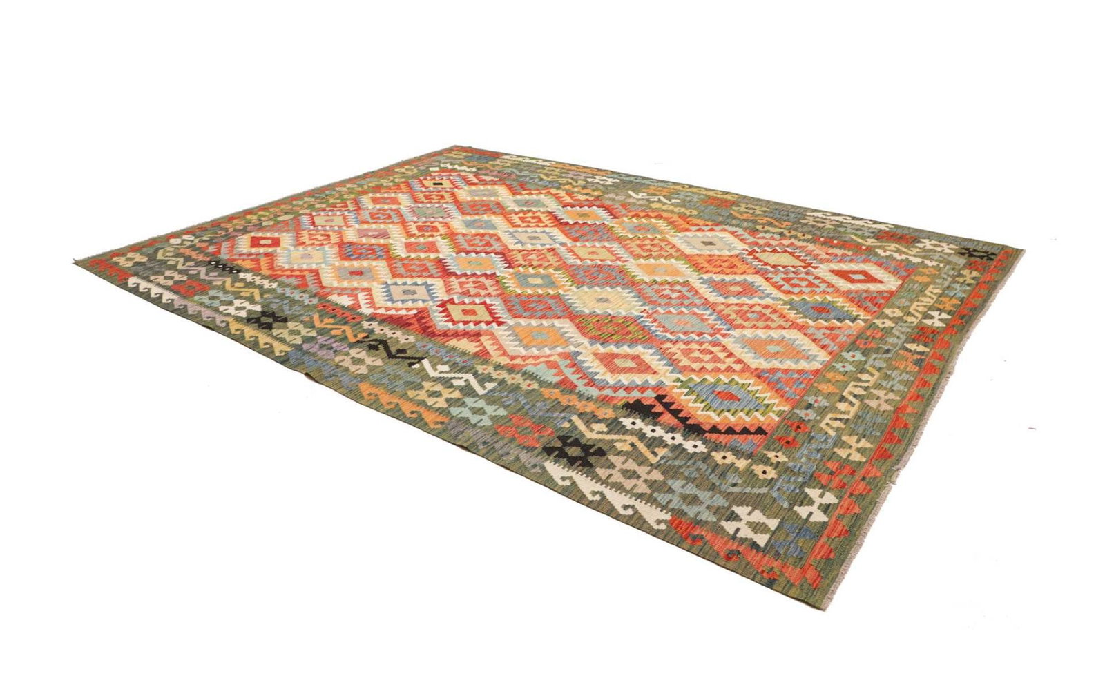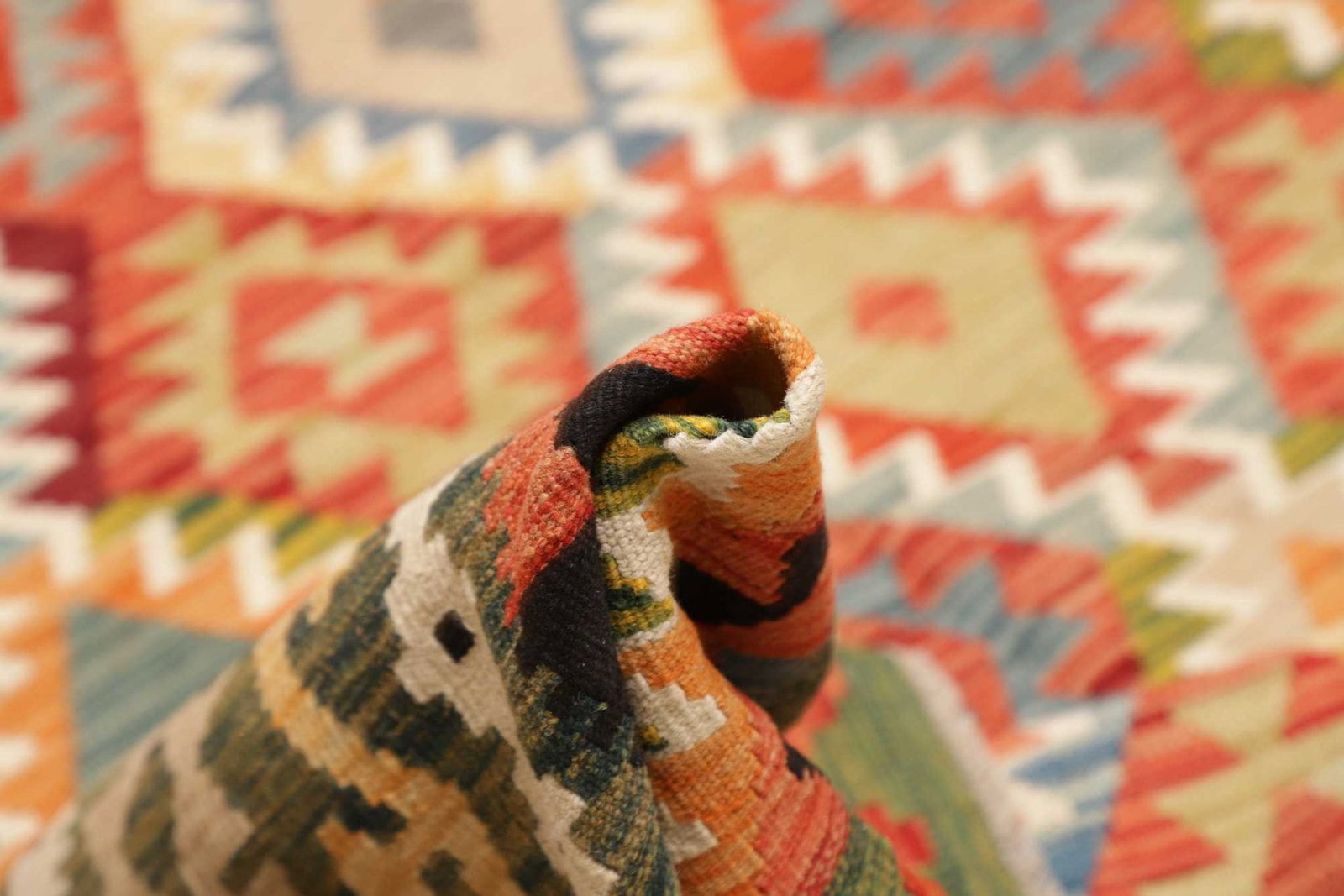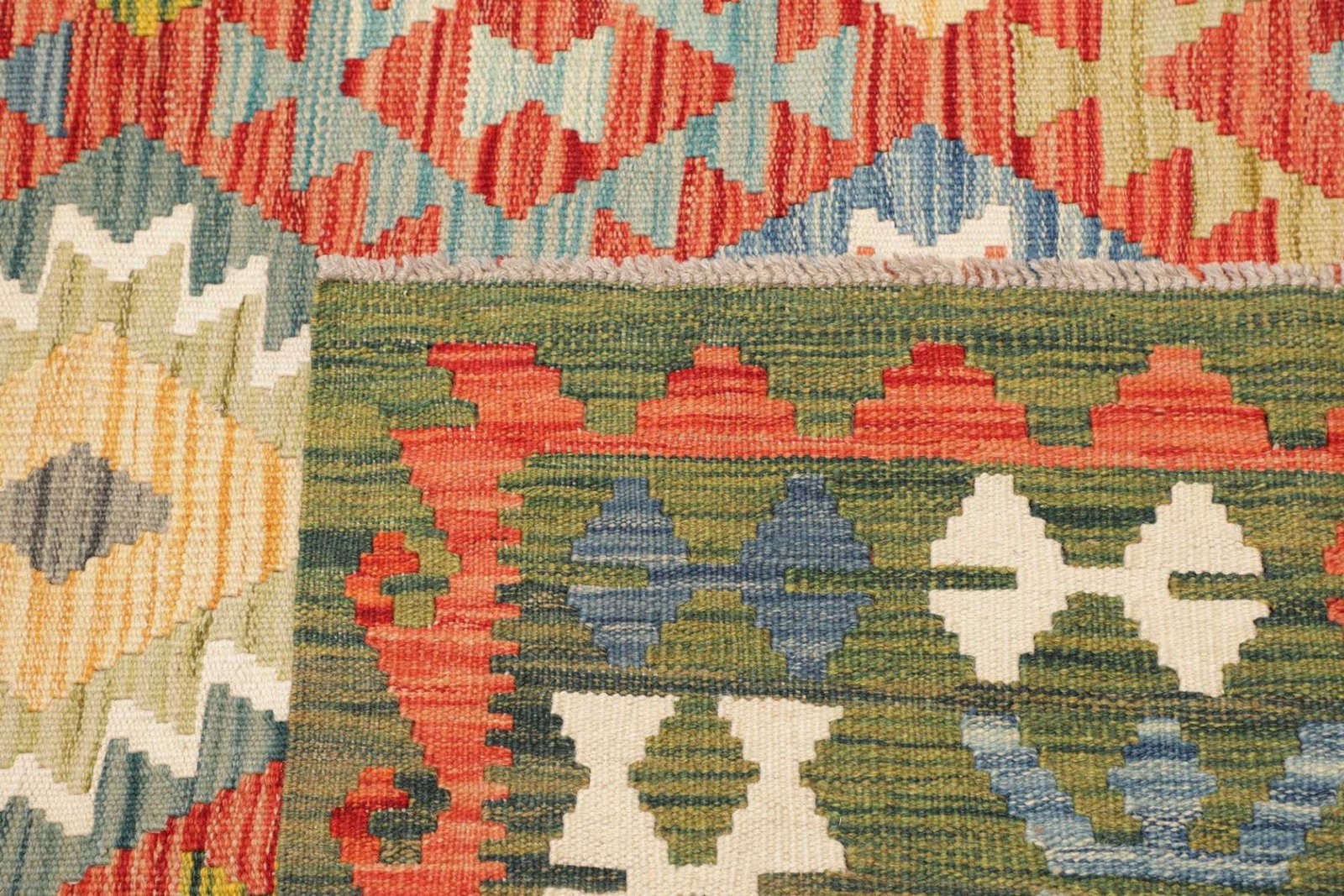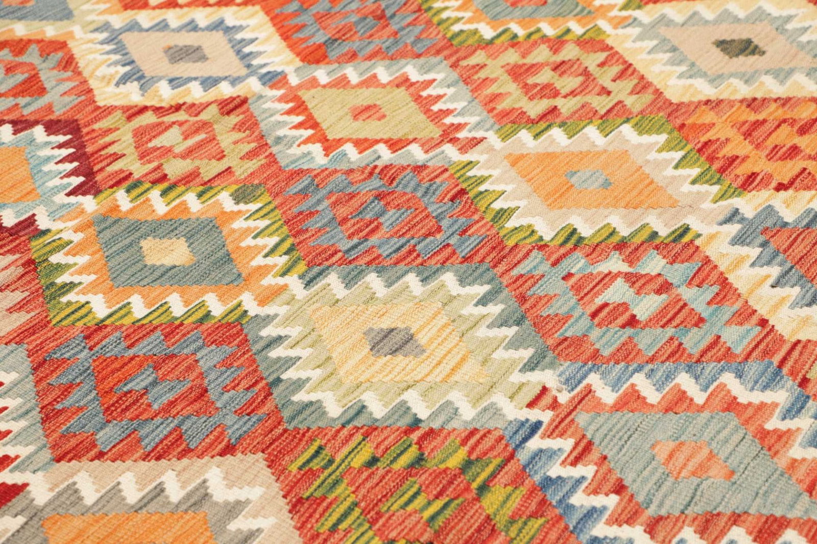 Pakistani Kelim Teppiche sind bekannt für ihre hohe Knotendichte, die Verwendung von natürlicher Schurwolle und die vielfältigen geometrischen Muster, die oft in kräftigen Farben gestaltet sind.