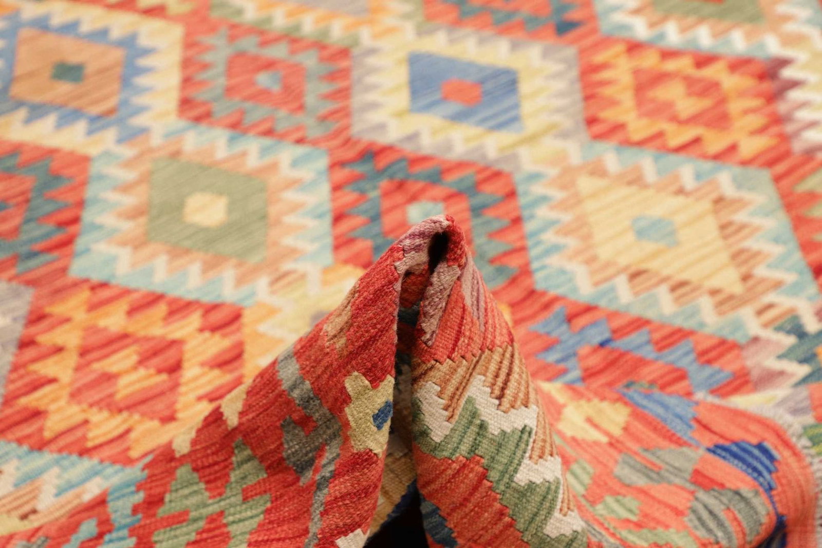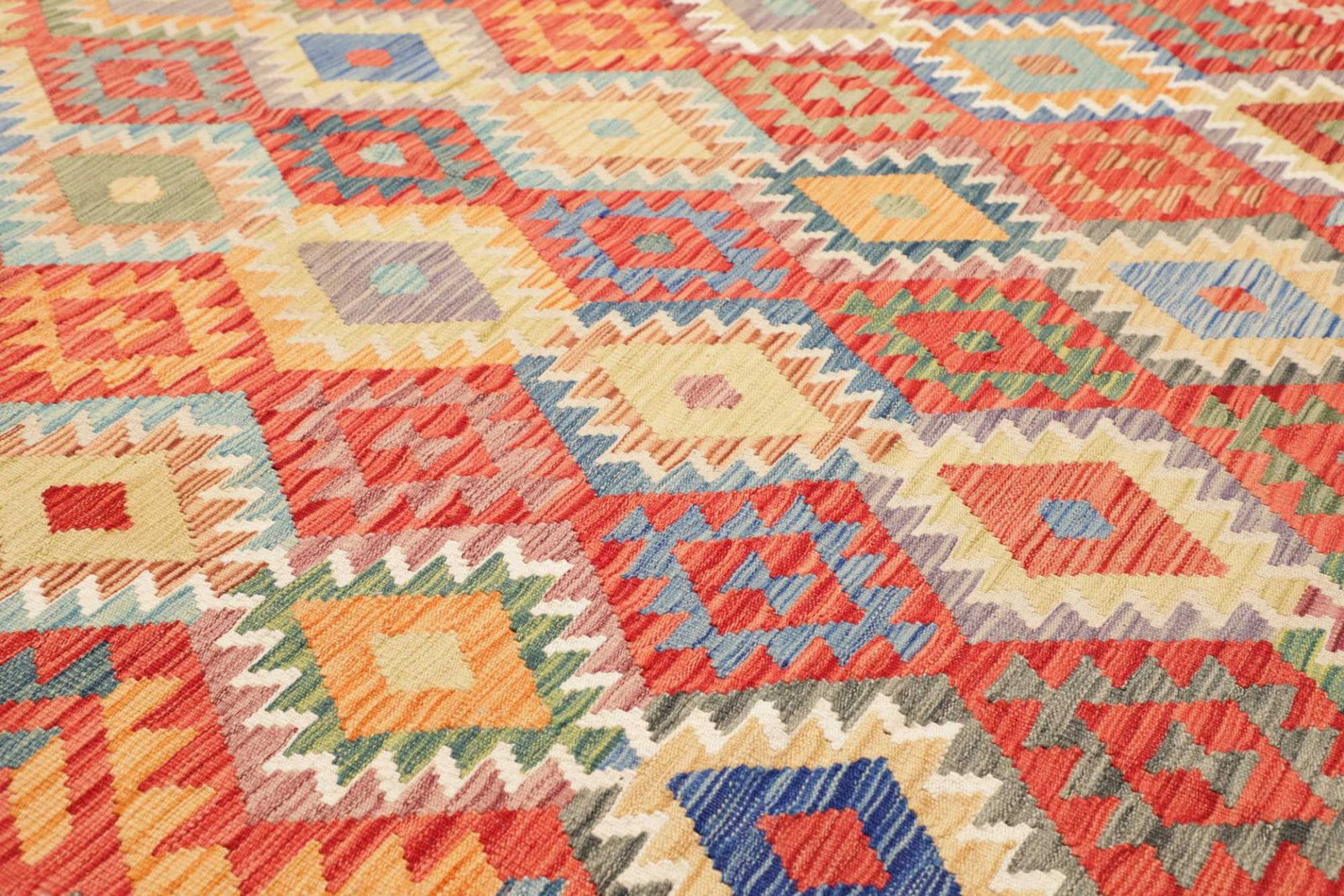 Kelim Teppiche sind gewebt und nicht geknüpft, was ihnen eine flache Struktur verleiht. Sie sind bekannt für ihre geometrischen Muster und kräftigen Farben, die kulturelle Einflüsse aus dem Orient widerspiegeln.