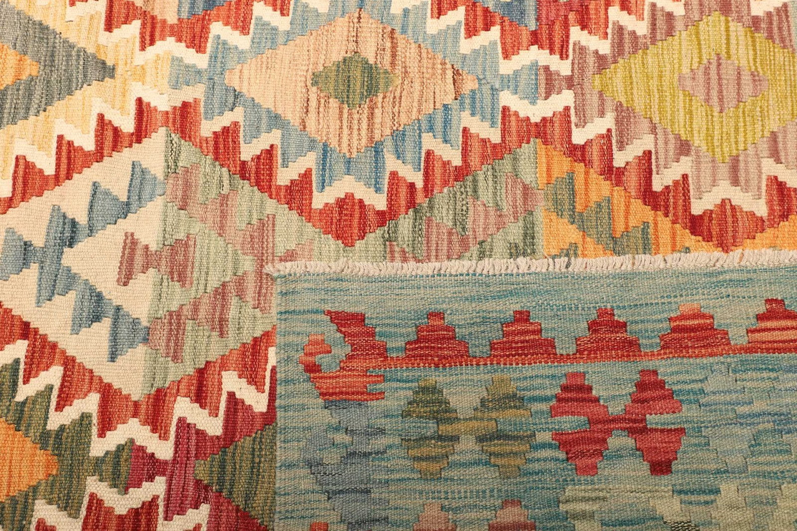 Der Kelim besteht aus 100% Wolle, was ihn besonders robust und pflegeleicht macht. Wolle ist ein hervorragendes Material für Teppiche, da sie nicht nur weich und warm ist, sondern auch geruchsabsorbierend und schmutzabweisend. Die handgewebte Technik sorgt dafür, dass jeder Teppich ein Unikat ist, geprägt von individuellen Details und einzigartiger Ausstrahlung. Die Verwendung hochwertiger Rohstoffe und traditionelle Webtechniken garantieren zudem die hervorragende Qualität und Langlebigkeit dieses Teppichs.