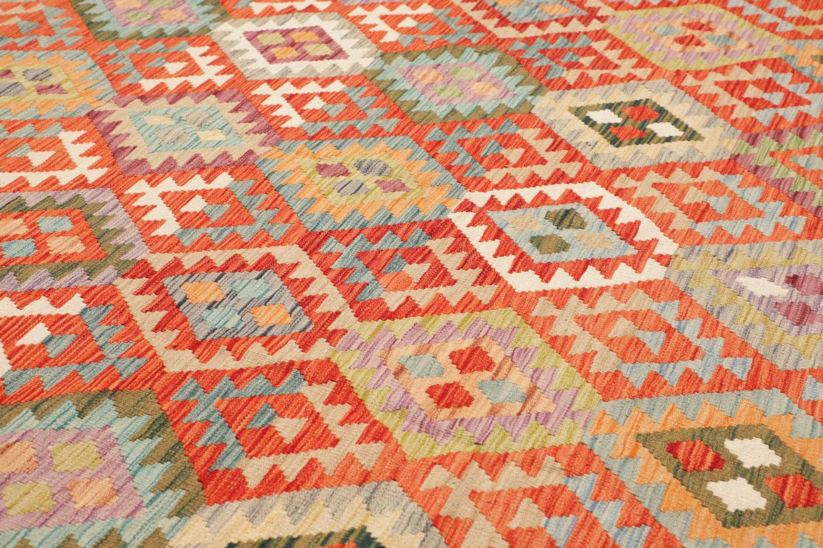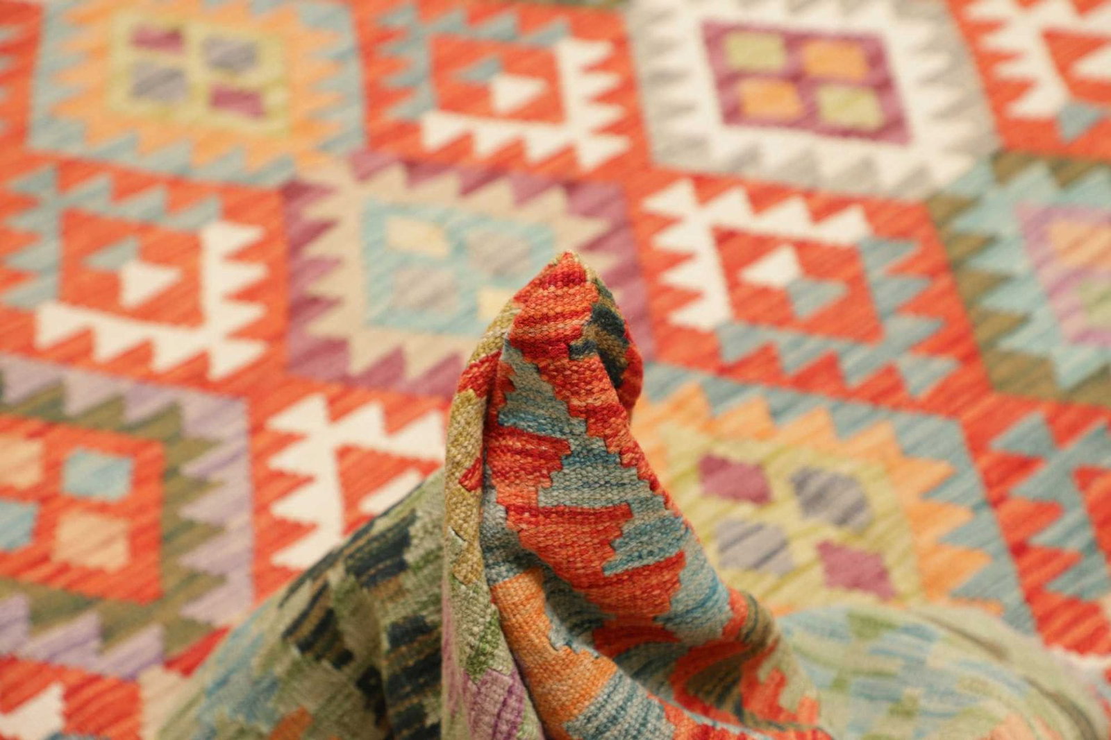 Die Verwendung von Schurwolle sorgt für eine angenehme Haptik und trägt zur Regulierung der Luftfeuchtigkeit bei, während die Baumwollkette dem Teppich Stabilität verleiht. Kelims sind nicht nur als Bodenbelag beliebt, sondern finden auch Verwendung als Wandbehänge, Vorhänge oder Kissenbezüge. Ihre Beidseitigkeit macht sie besonders vielseitig einsetzbar. Die handgewebte Qualität und die Verwendung von natürlichen Materialien heben diesen Teppich von maschinell hergestellten Produkten ab und machen ihn zu einem einmaligen Kunstwerk.