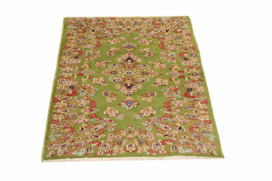 Kerman Teppich | Knotendichte: 160.000 – 200.000 Knoten/m² | Material: Handgesponnene Wolle und Baumwollkette | Größe: 147×86 cm | In neuem Zustand | Farbe: Grün/Oliv | Verarbeitung: Handgeknüpft