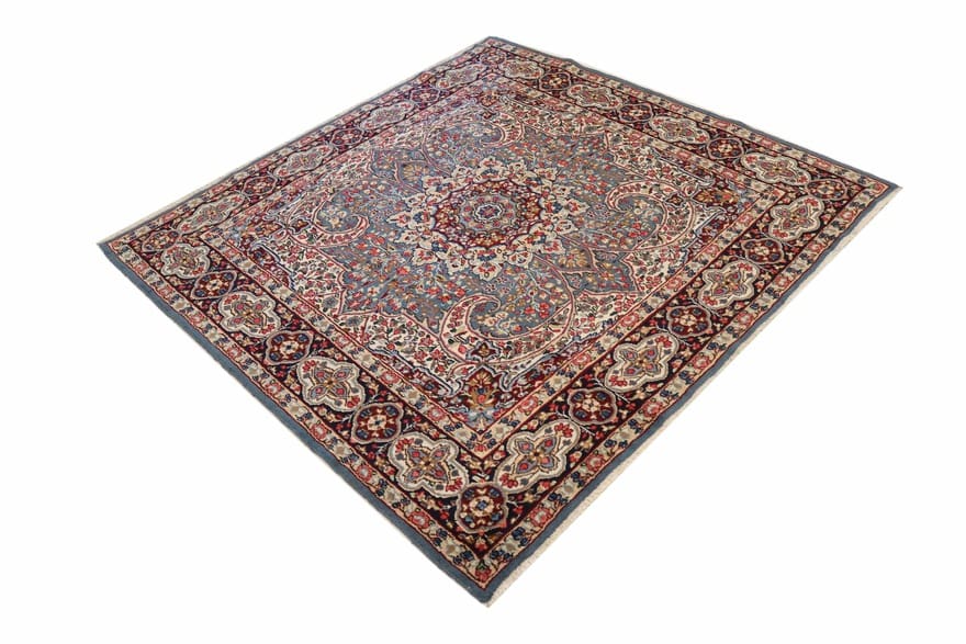 Multifarbiger Kerman Teppich | Knotendichte: 160.000 – 200.000 Knoten/m² | Material: Handgesponnene Wolle mit Baumwollkette | Größe: 257×241 cm | Neu und in ausgezeichnetem Zustand | Form: Quadratisch