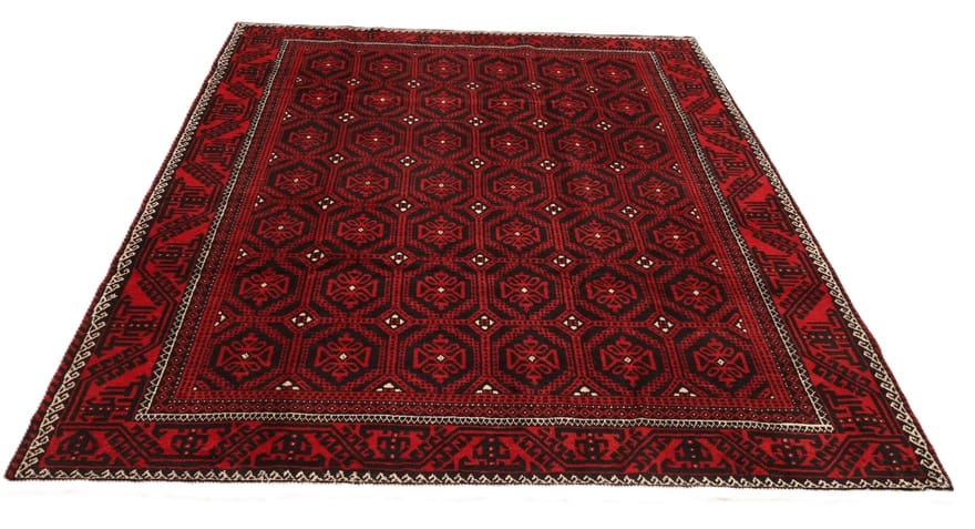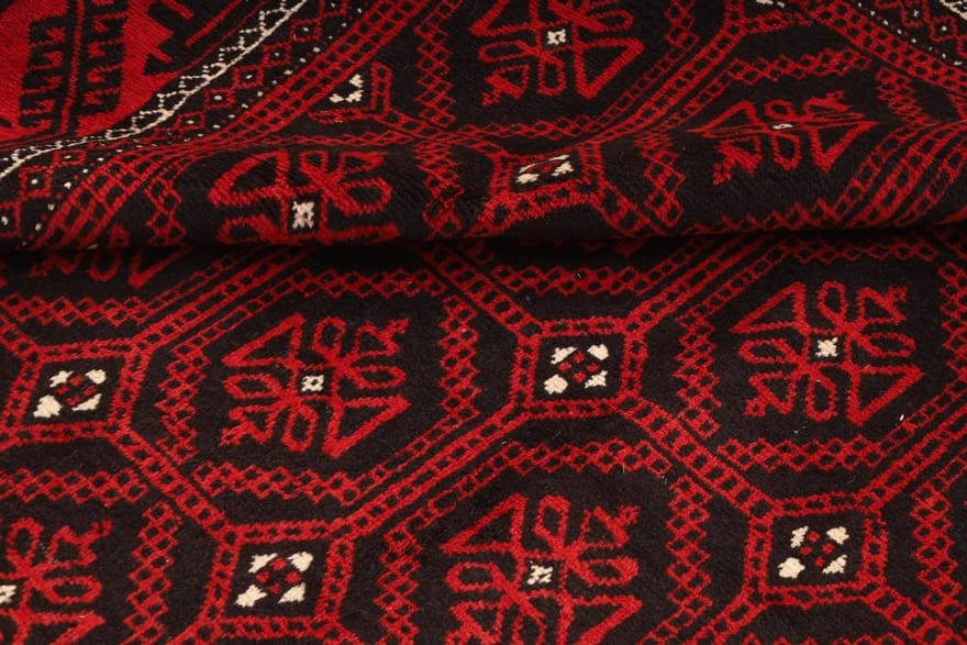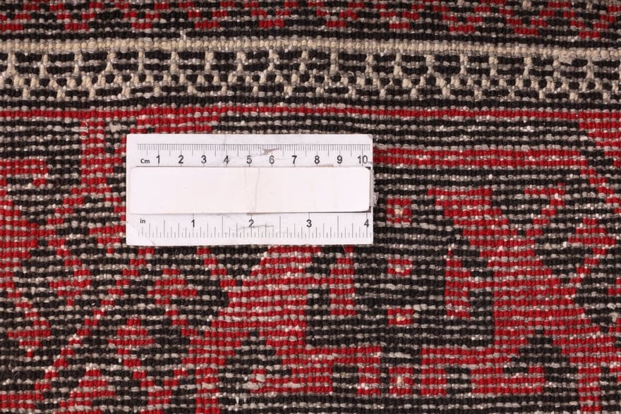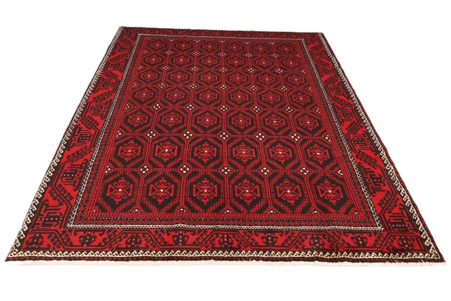 Handgeknüpfter Kurdi Teppich | Knotendichte: 128.000 – 160.000 Knoten/m² | Material: Wolle und Seide | Größe: 280×208 cm | Farbe: Rot/Schwarz | Zustand: Neu | Ursprung: Iran/Persien | Dicke: ca. 8 mm | Gewicht: ca. 12 kg | Geometrisches Muster mit achteckigen Motiven