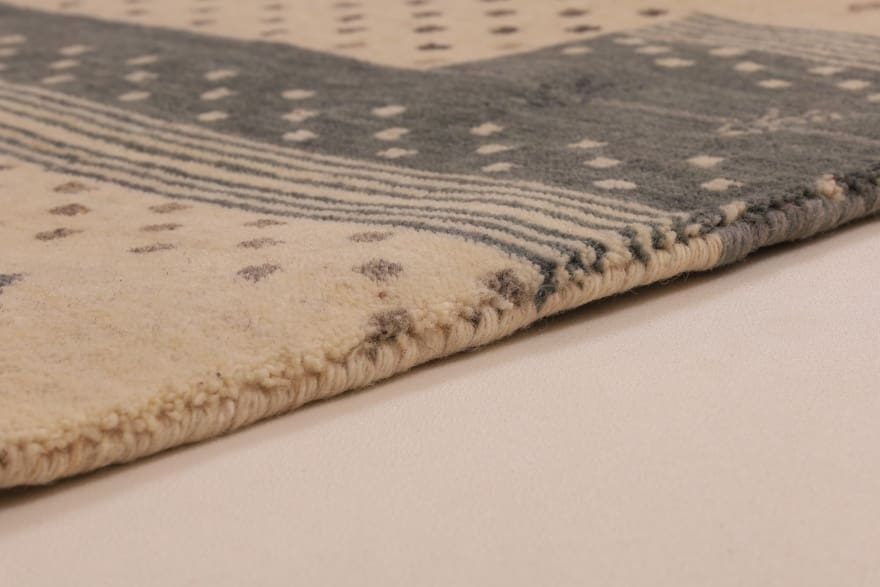 Loribaf Teppich | Knotendichte: 160.000 – 200.000 Knoten/m² | Material: Hochwertige Wolle und Baumwolle | Größe: 188×122 cm | In neuem Zustand | Herkunft: Indien | Farbe: Weiß/Beige | Form: Rechteckig | Dicke: ca. 8 mm | Gewicht: ca. 6 kg | Handgeknüpft in Loom-Technik