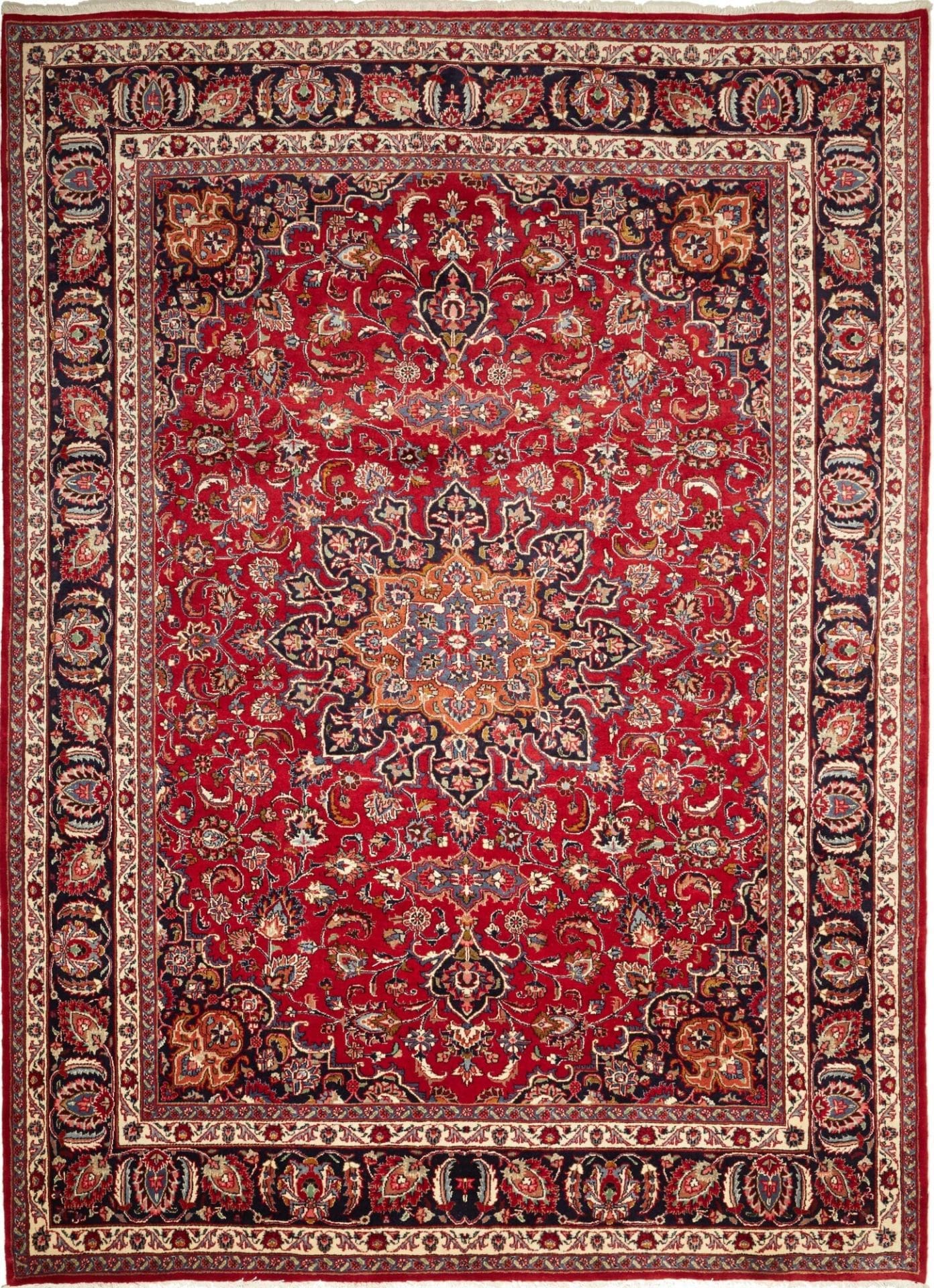 Der Mashad Teppich stammt aus der gleichnamigen Stadt Mashad, die eine der wichtigsten und historisch bedeutsamsten Städte im Iran ist. Mashad liegt in der Provinz Khorasan und ist bekannt für seine beeindruckende Architektur, seine religiöse Bedeutung und seine reiche Teppichtradition. Die Teppichknüpfer in dieser Region haben Generationen von Wissen und Kunsthandwerk weitergegeben. Die Herstellung von Teppichen in Mashad hat eine jahrhundertelange Tradition und wird häufig mit dem Streben nach Perfektion in Bezug auf Design und Technik assoziiert. Oft sind es die floralen Muster, die auf die üppige Natur der Umgebung und die spirituelle Symbolik zurückzuführen sind, die in der persischen Kultur eine zentrale Rolle spielt.