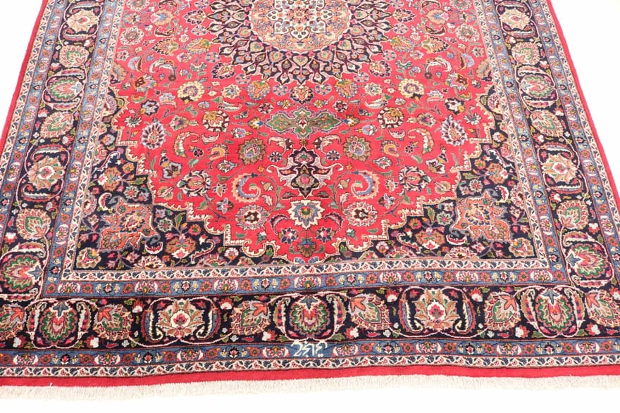 | Traditioneller Maschad Teppich | Knotendichte: 450.000 – 500.000 Knoten/m² | Material: Handgesponnene Wolle mit Baumwollkette und -schuss | Größe: 398×295 cm | Farbe: Rot/Orange | Zustand: Neu | Herkunft: Iran/Persien | Verarbeitung: Handgeknüpft | Dicke: ca. 10 mm | Gewicht: ca. 35 kg